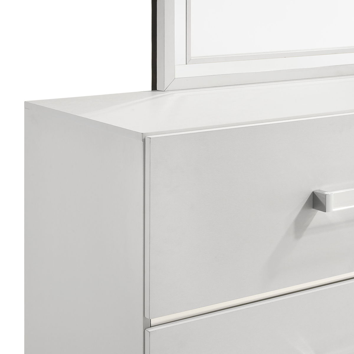 The Europa Mirror in white is a perfect blend of modern design and quality craftsmanship. This mirror features a sleek, sophisticated look with a bright white finish that adds to its glimmering appeal. Made from eco-friendly manufactured woods, it is assembled with durability in mind, and the surfaces are finished with a glossy white topcoat. The upscale design includes a low-distortion mirror encased in a tapered frame, adding a modern flair to any room. Choose the Europa Mirror to enhance your space with a touch of contemporary elegance and high-quality construction.