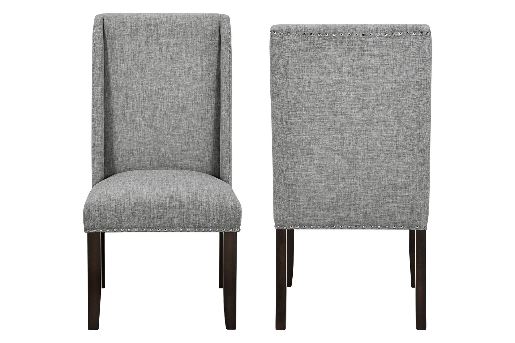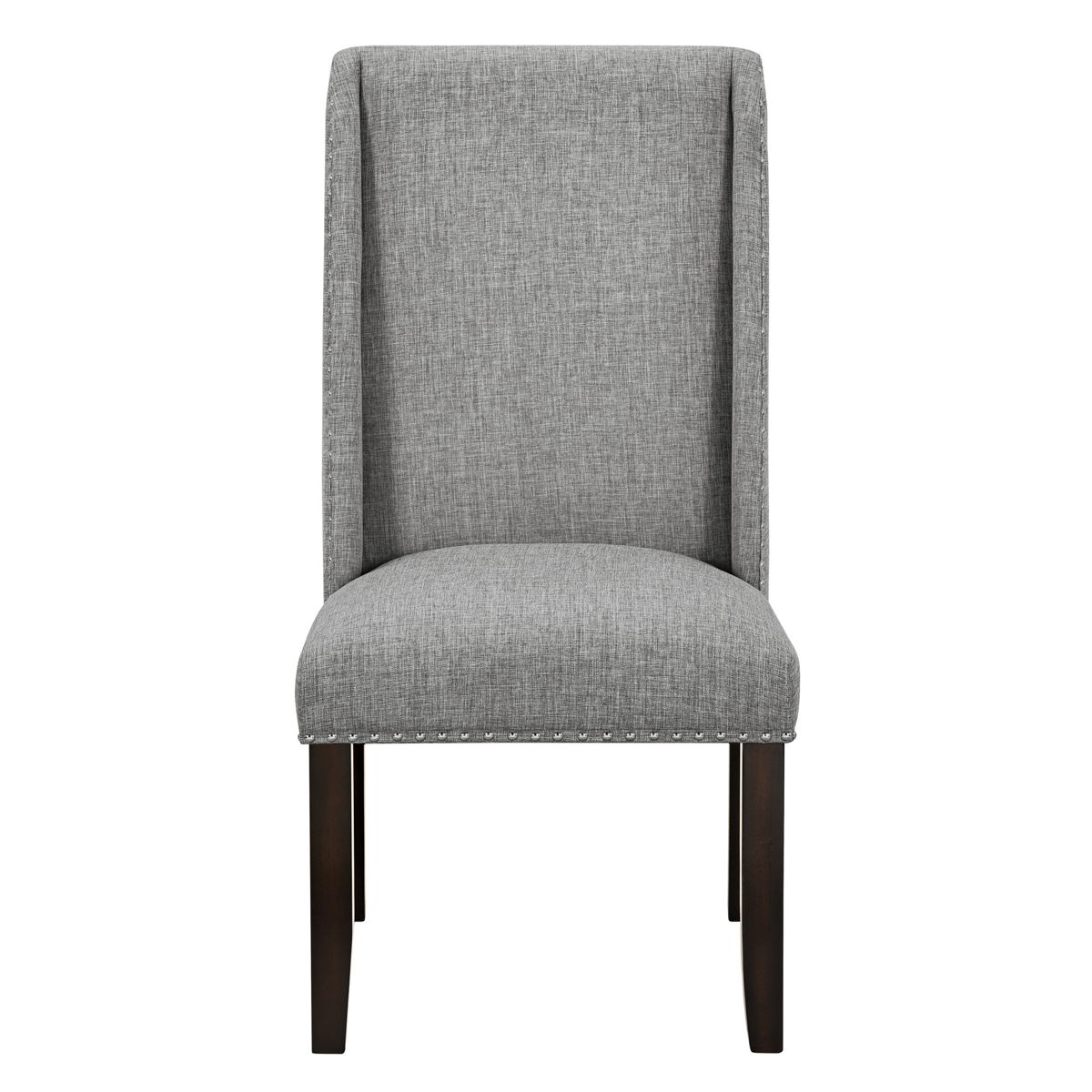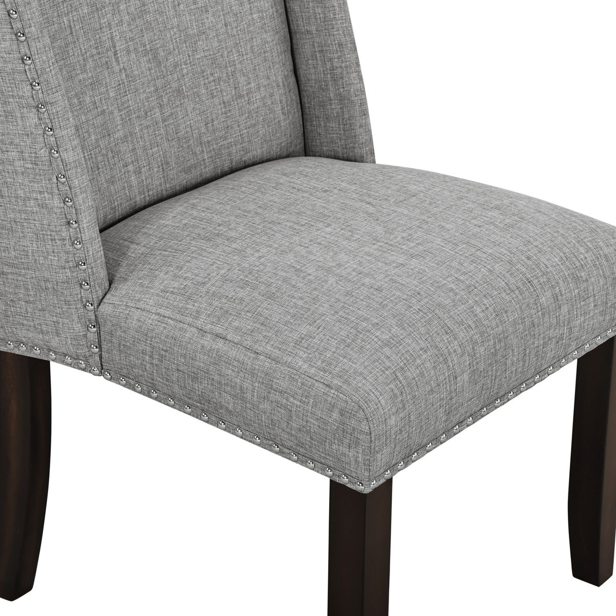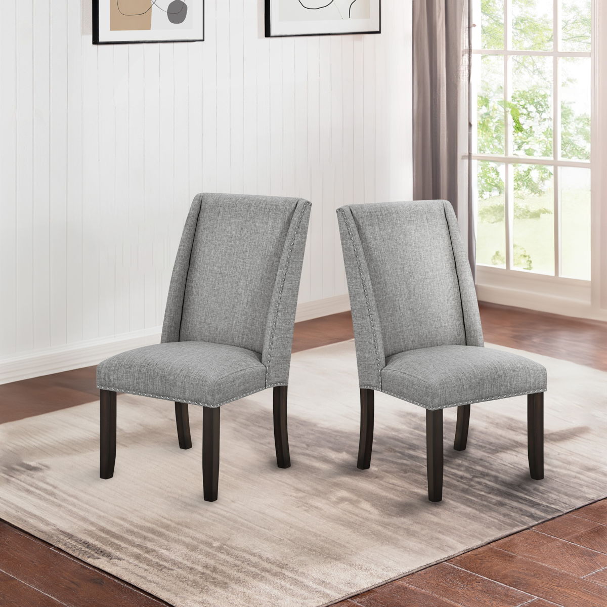The Faust Upholstered Parsons Dining Chairs combine elegant design with quality construction, making this set of 2 chairs a perfect addition to any dining space. Crafted from solid rubberwood and eco-friendly manufactured woods, these chairs are built to be strong and durable. The solid wood legs provide extra stability, ensuring long-lasting use. The 100% polyester tweed fabric fully upholsters the chairs, offering a soft and easy-to-clean surface. With resilient foam seat cushions and a padded back, these chairs provide restful and supportive seating, making them comfortable and welcoming. Featuring a sleek, contemporary design, the decorative nailhead trim along the edges adds a touch of elegance and sophistication. The dark wooden legs create a strong contrast to the light gray upholstery, resulting in a balanced and modern aesthetic. Ideal for those seeking a blend of luxury, comfort, and style, the Faust Parsons Dining Chairs are a fantastic choice for enhancing your dining area.