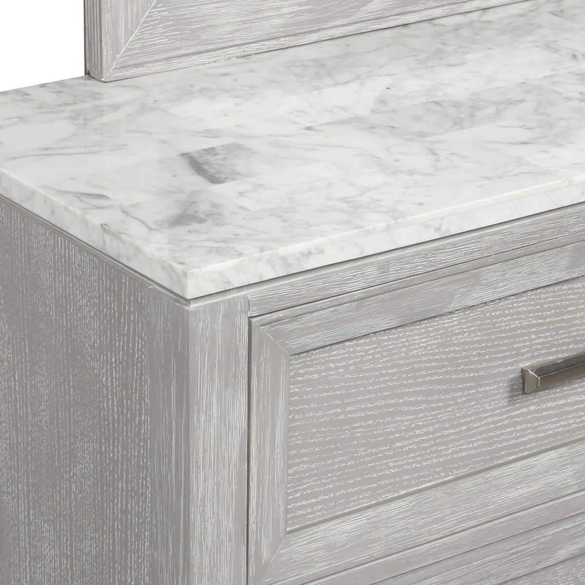 - Multi-Step Finish: The beauty of the natural wood grain is enhanced with a multi-step process including wire brushing and white glazing that results in a light, clear mist gray finish.
