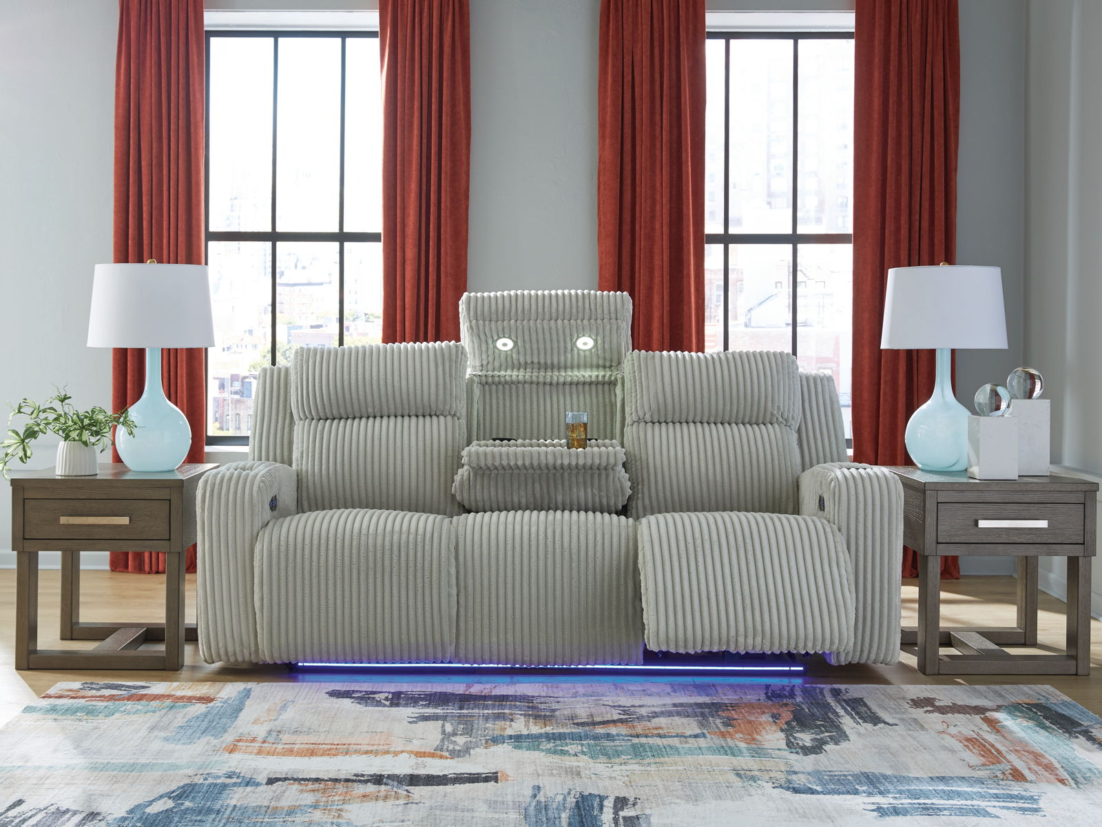 Trend-right style, meet irresistible modern function. Your living room gets a cozy-cool upgrade with this power reclining sofa. Curl up in its ultra-chic corded upholstery and recline with one-touch controls. Is it movie night or game time? With ambient LED lighting and wireless audio connectivity, this sofa transforms from a serene relaxation spot to an entertainment hub. Its drop-down table, USB charging and cup holders make lounging all the more convenient.