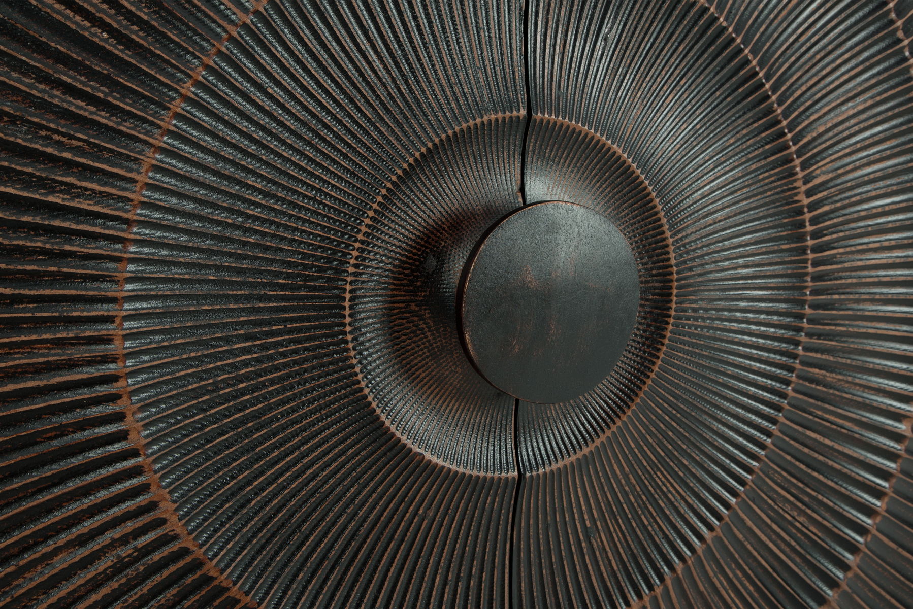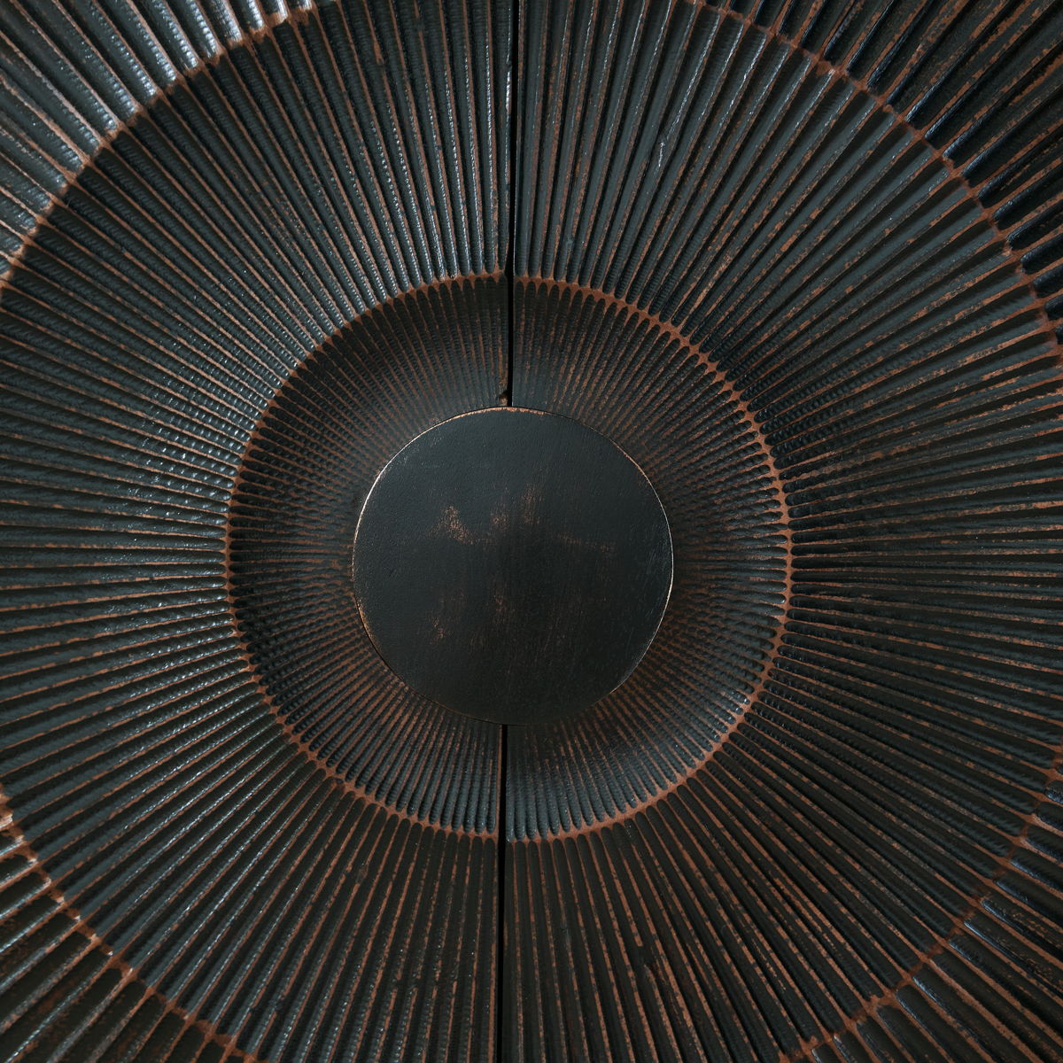 High style is on the rise with this wood accent cabinet. Its stunning doors, graced with a carved sunburst pattern and oversized wood pull, open to reveal two shelves. A distressed black finish adds contemporary flair. Whether this cabinet is accommodating storage needs or hiding clutter, it’s truly a showpiece.