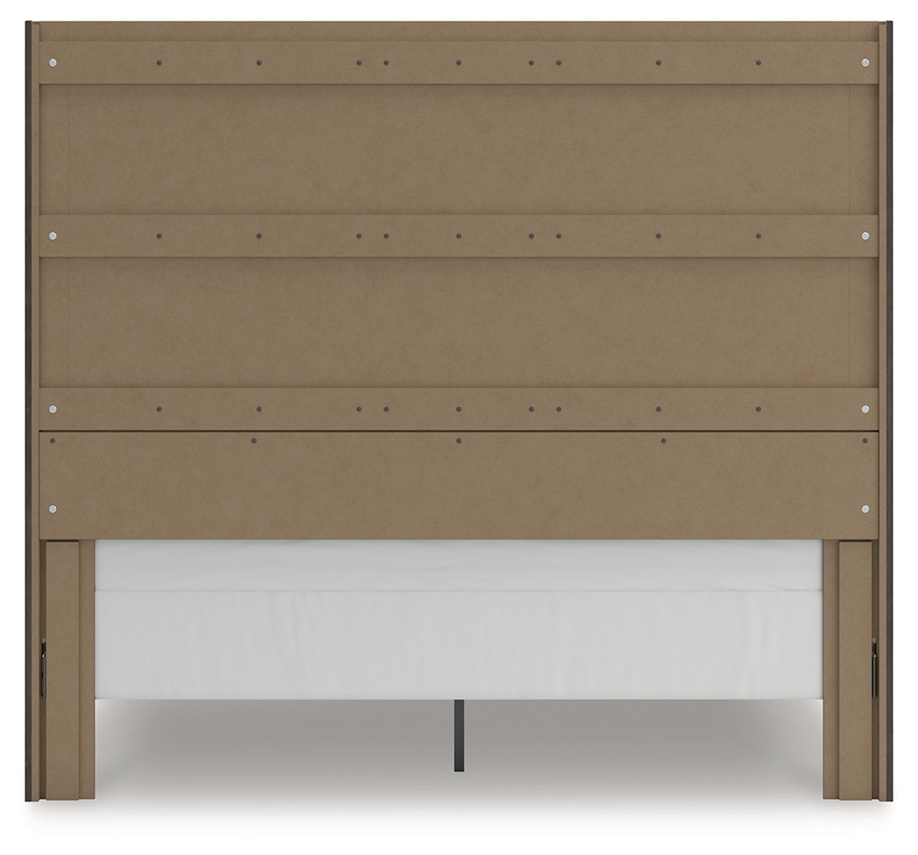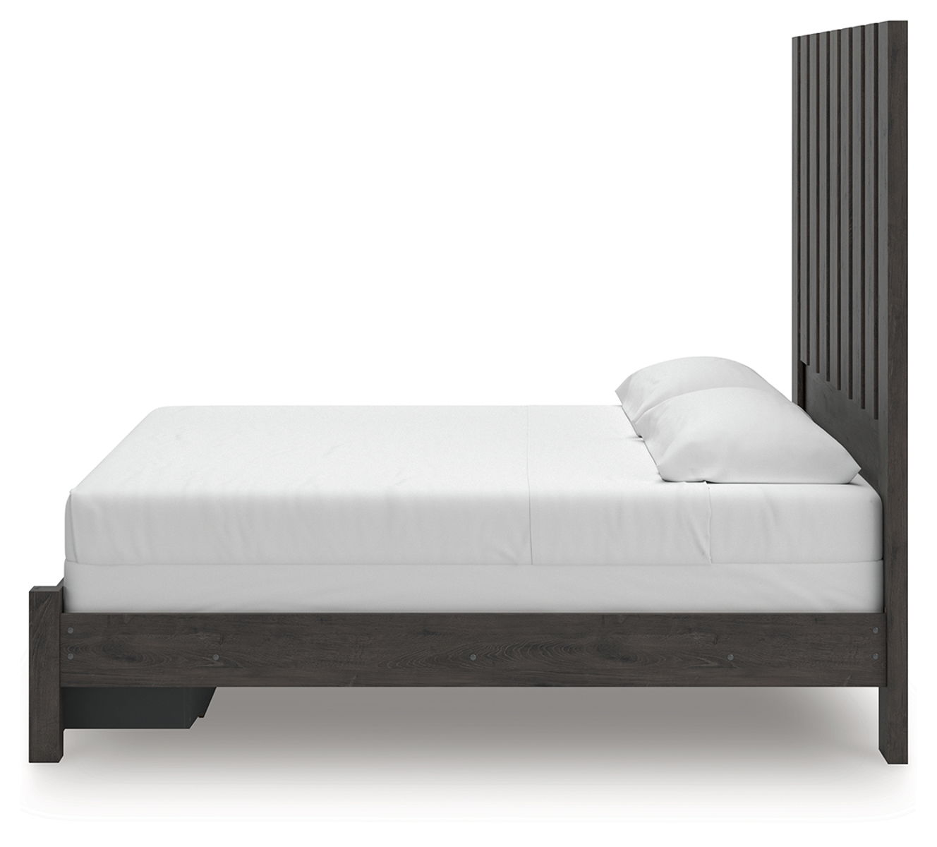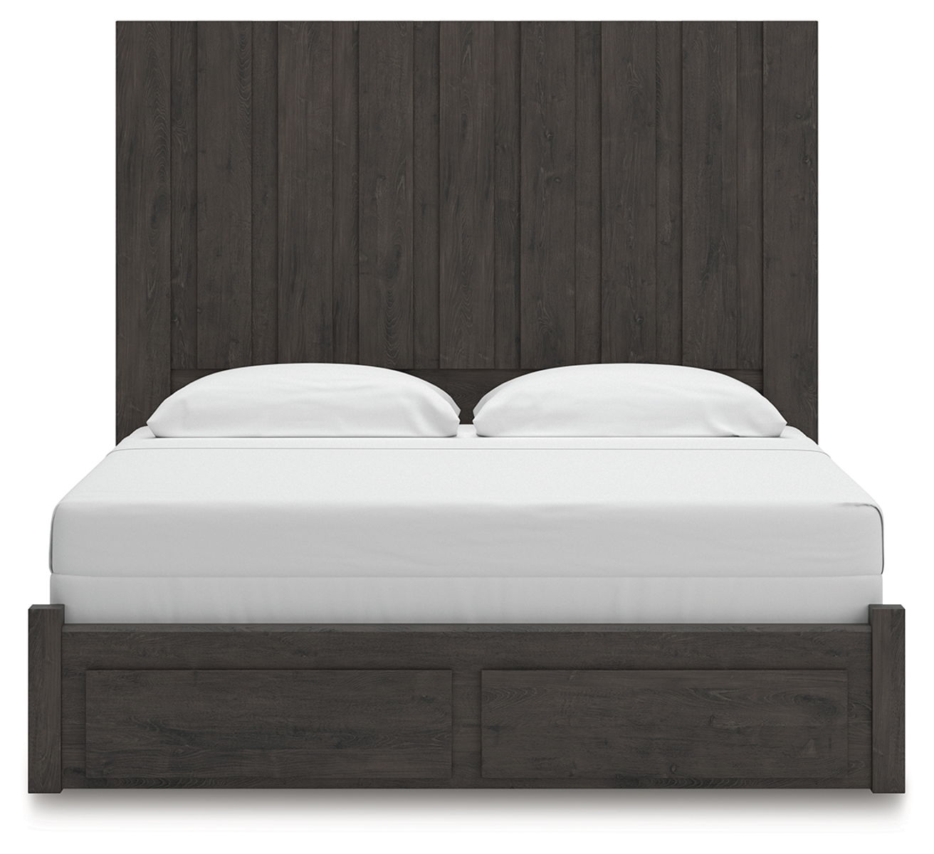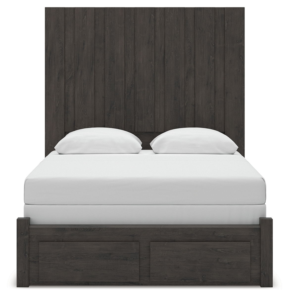 Find serene simplicity in the clean lines and dark neutral tones of this queen panel storage bed. Its a sincere approach to modern elegance, giving you high style at a great value. Short on storage? Smooth-gliding drawers in the footboard keep clutter neatly tucked away. Vertical planks decorate the generously scaled headboard to give the illusion of additional height, polishing off the piece in grand fashion.
