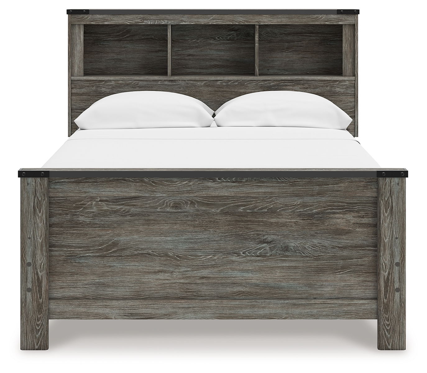 Cool, casual style is for all ages. With this bookcase panel bed, they get the function they need plus the refined design you love. Approachably neutral in a rustic warm, it’s adaptable enough to pair with an assortment of existing colors and room decor. Faux metal detailing with nailhead accents lends an industrial edge. And handy storage cubbies in the headboard keep books, toys and other bedtime necessities within easy reach.