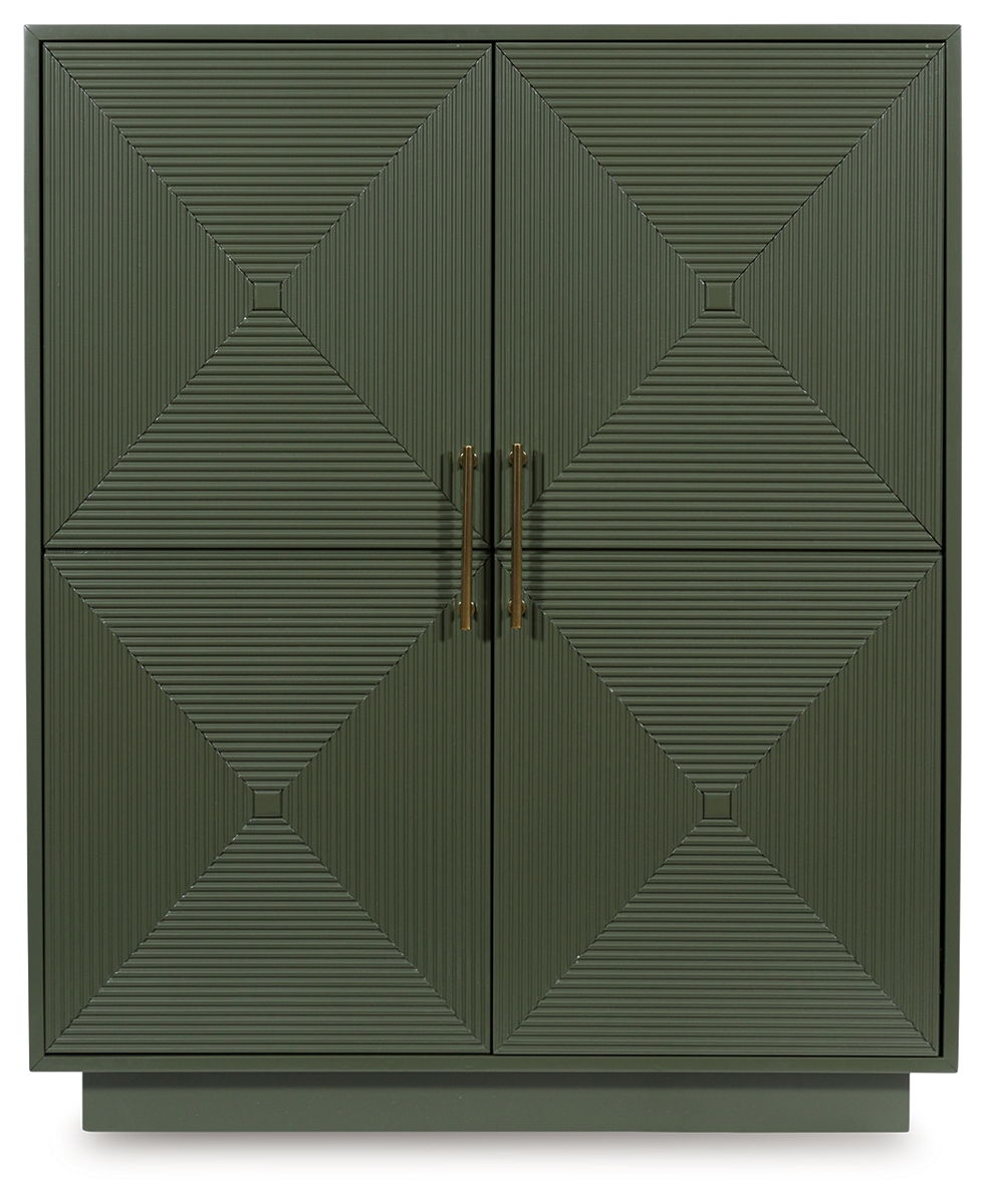 This accent cabinet makes a big impact with just one piece. Its intricately patterned doors impress with their dimension, while the dark green finish and sleek goldtone handles add a touch of modern elegance. Adjustable shelves add everyday functionality to this sophisticated yet approachable piece.
