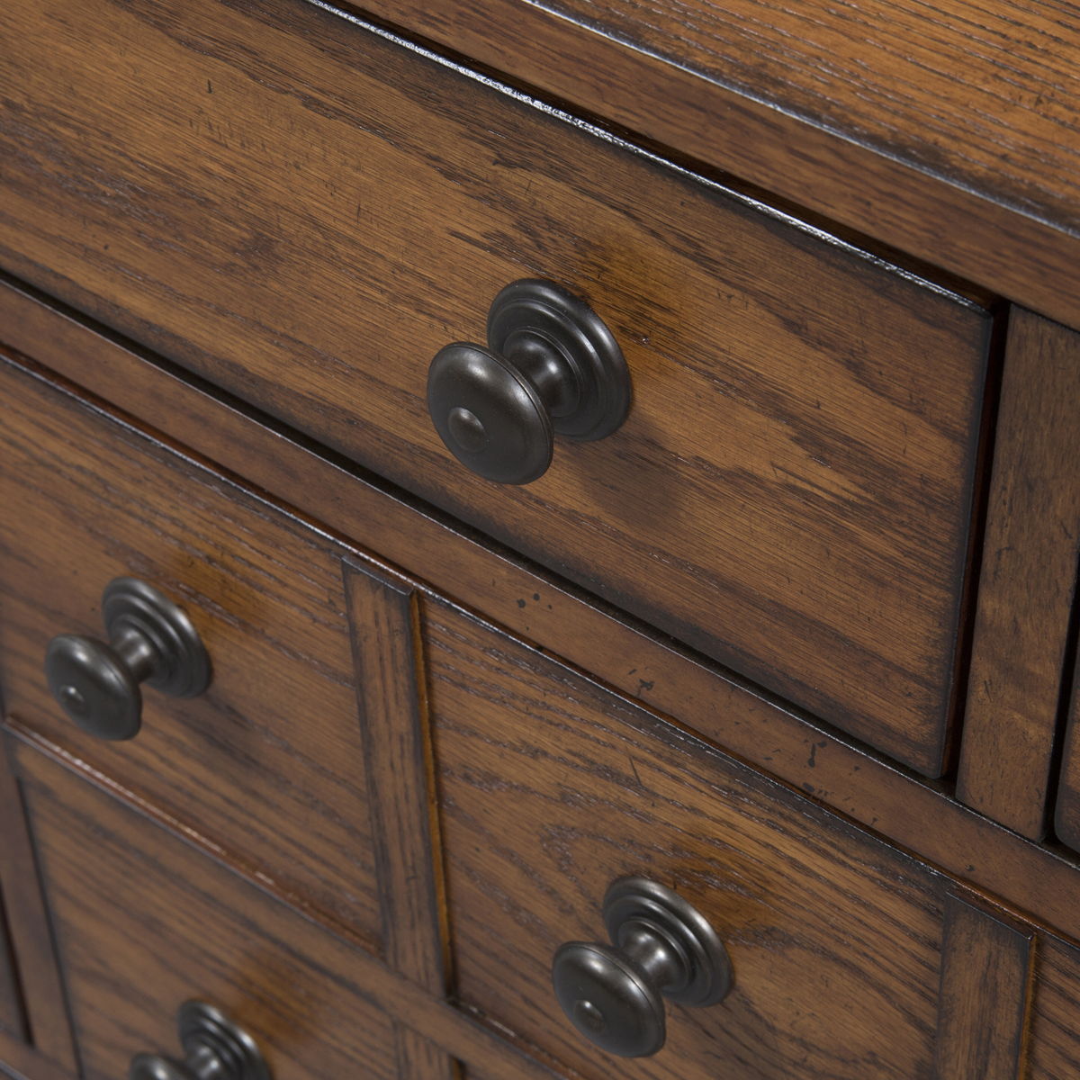 Staple your child’s room or guest space with a rustic American style with the Grandpa’s Cabin panel bed, dresser and mirror. Crafted of rubberwood solids and oak veneers, this kit features complete case dust proofing to protect your contents, French and English dovetail drawer construction, full extension and fully stained interior drawers, bluff-cut drawer fronts, wood and peg accents that offer a craftsman feel, and is accented with antique brass knob hardware. The panel bed offers a planked style on the headboard and footboard, a center support slat system and bolt on rails, ensuring reliability and longevity. The dresser offers three drawers and pairs well with the large picture frame mirror with a 1” bevel and includes bolt-on supports.