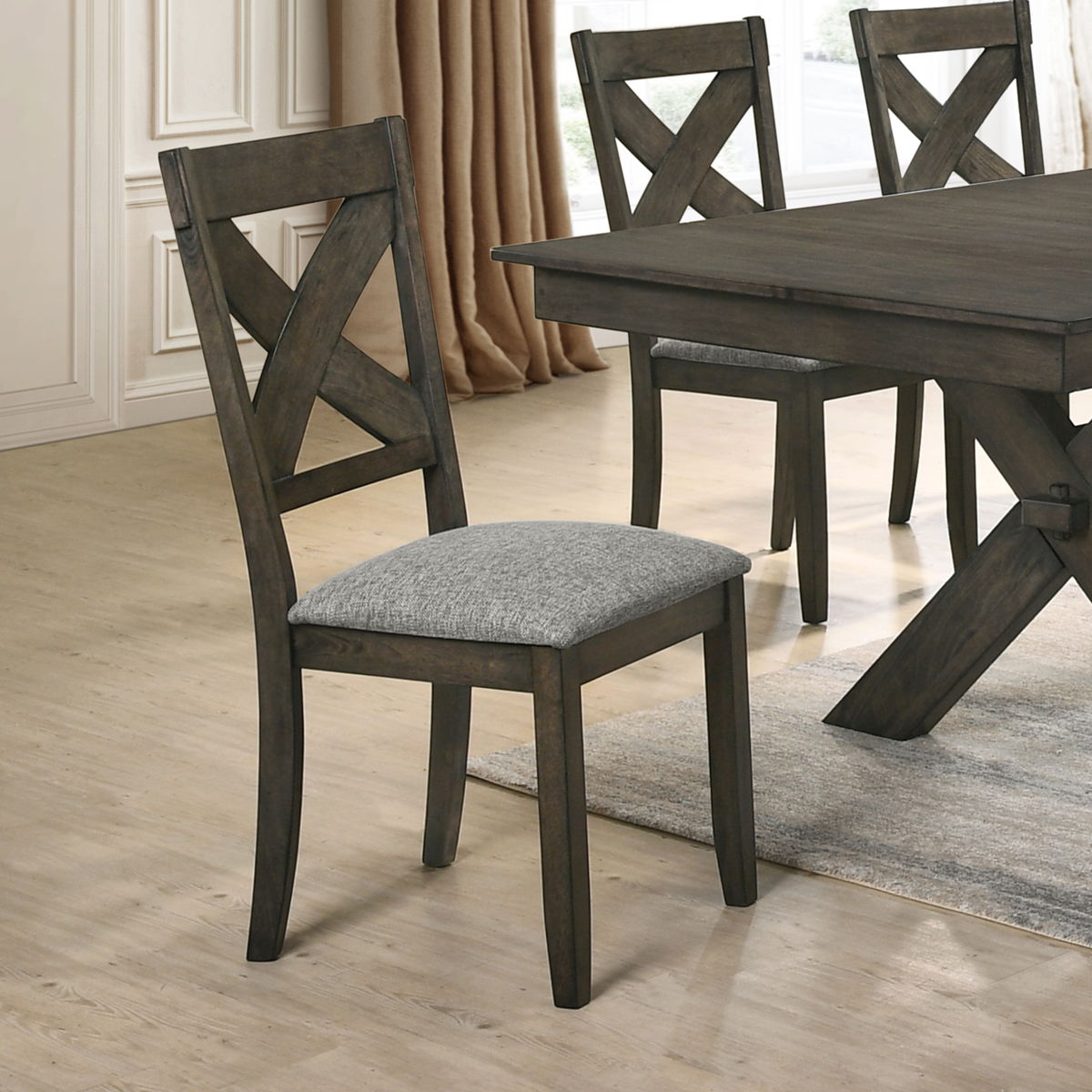 The Gulliver Wood Side Chairs in rustic brown offer a perfect blend of durability, style, and comfort. Each chair is crafted from solid rubberwood and acacia wood veneers, ensuring long-lasting stability. The multi-step rustic brown finish enhances the natural wood grain patterns, with subtle notes of gray and charcoal brown adding a touch of sophistication. These stylish X-back chairs feature a design that combines the clean lines of contemporary style with the cozy warmth of distressed wood, embodying modern farmhouse charm. Upholstered in an easy-care polyester and cotton blend gray fabric, the resilient foam cushions and comfortably angled backs provide a cozy seating experience. Enhance your dining space with the Gulliver Wood Side Chairs, perfect for adding both elegance and comfort to any dining room.