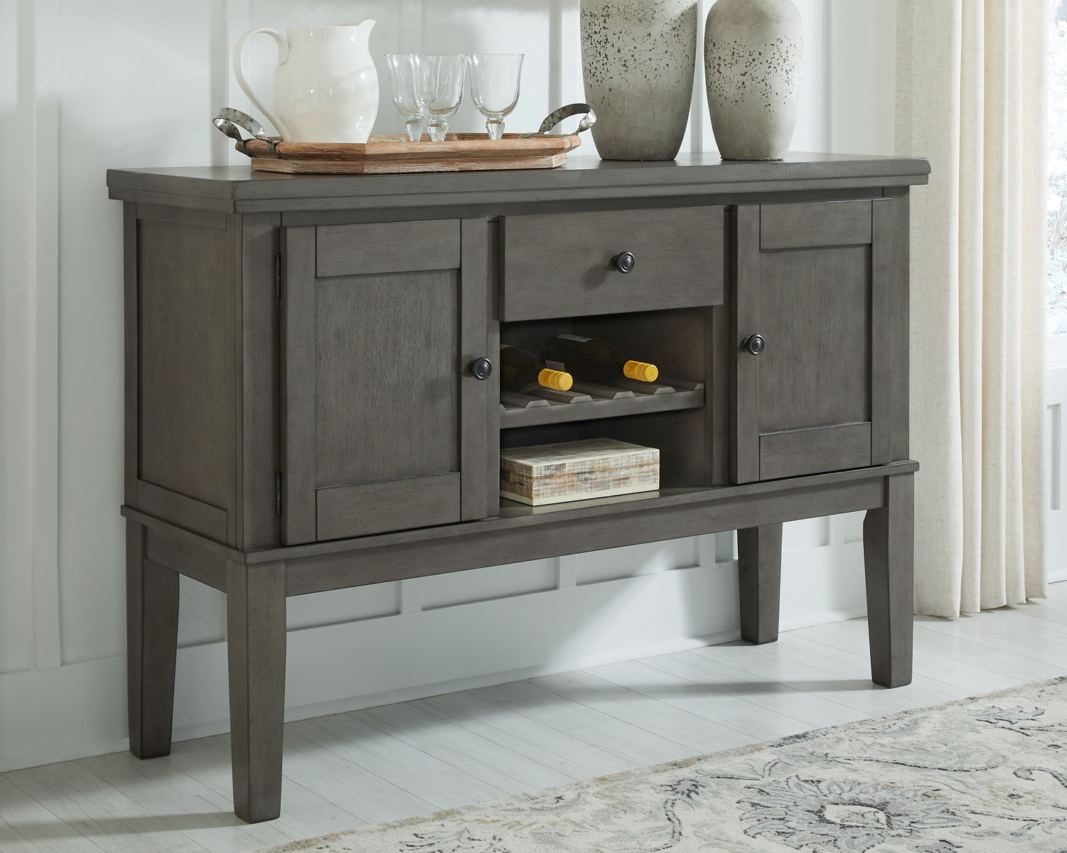 Cool and on-trend. This versatile server sports an antiqued gray color for a contemporary-yet-casual feel. The server features two cabinets, a smooth-gliding drawer and an open cubby with a wine rack, making it a breeze to clear away clutter and expand your serving space. Dining with friends and family has never been so stylish.