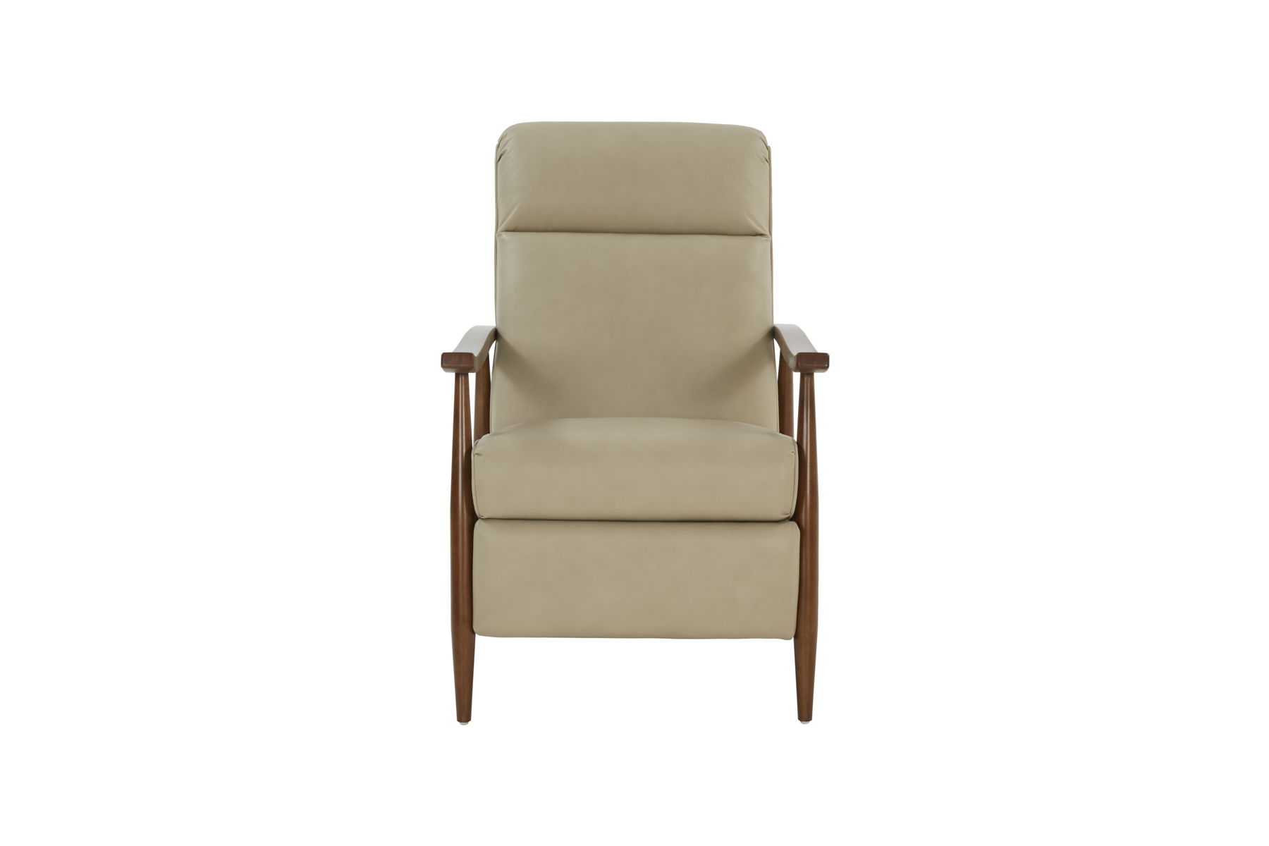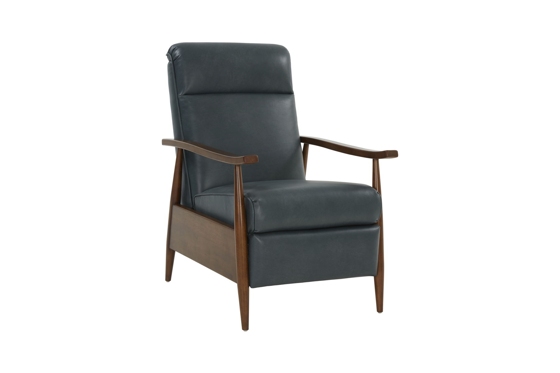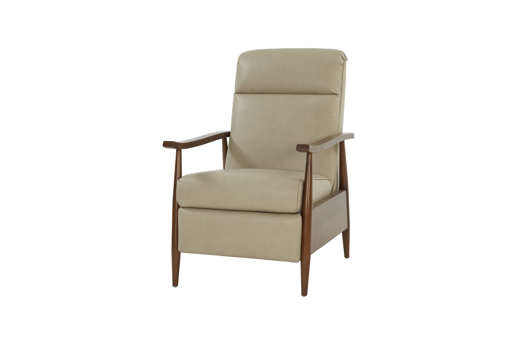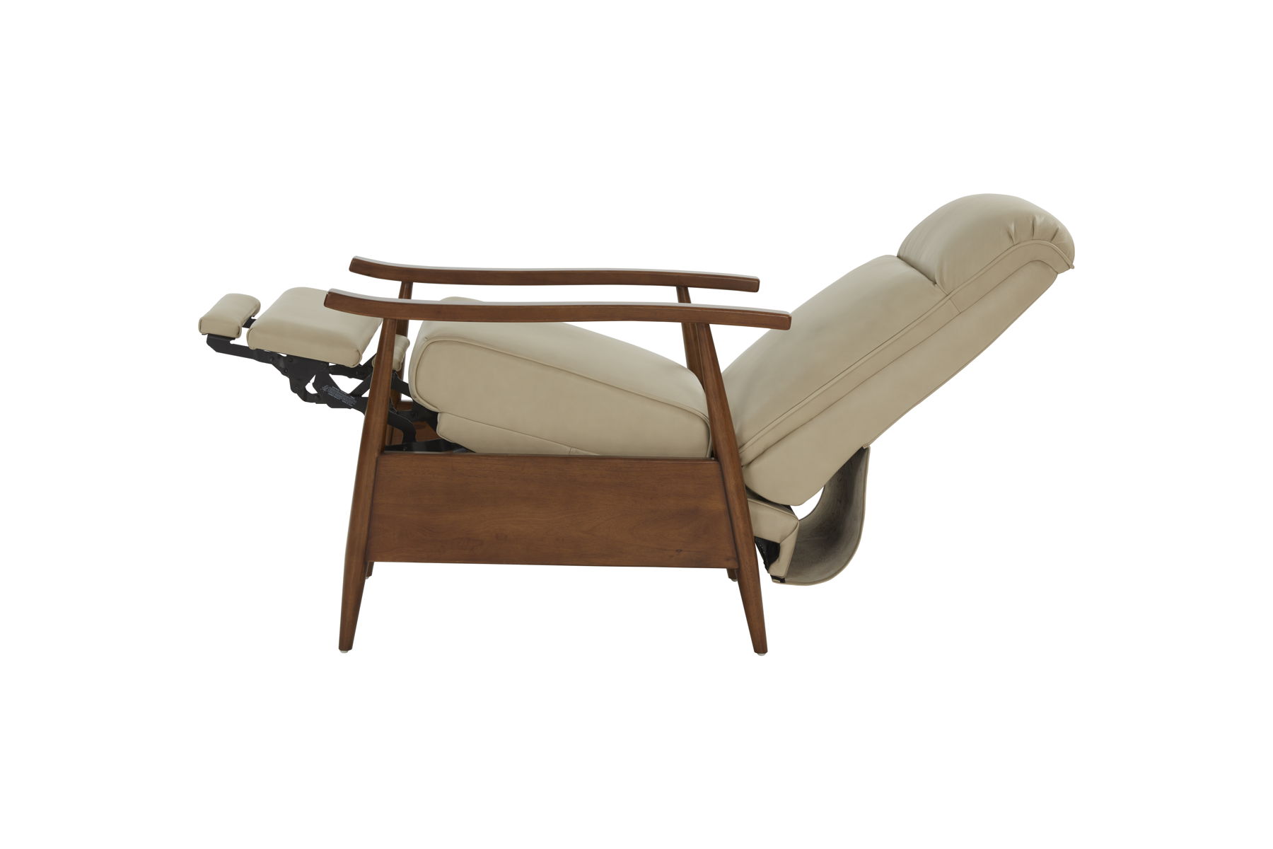Mid-Century Modern, exposed wood frame push thru the arm 3-way recliner featuring a bull nose seat cushion with pocketed coil springs encased in foam and wrapped in Dacron, split 41.8” high pub back.