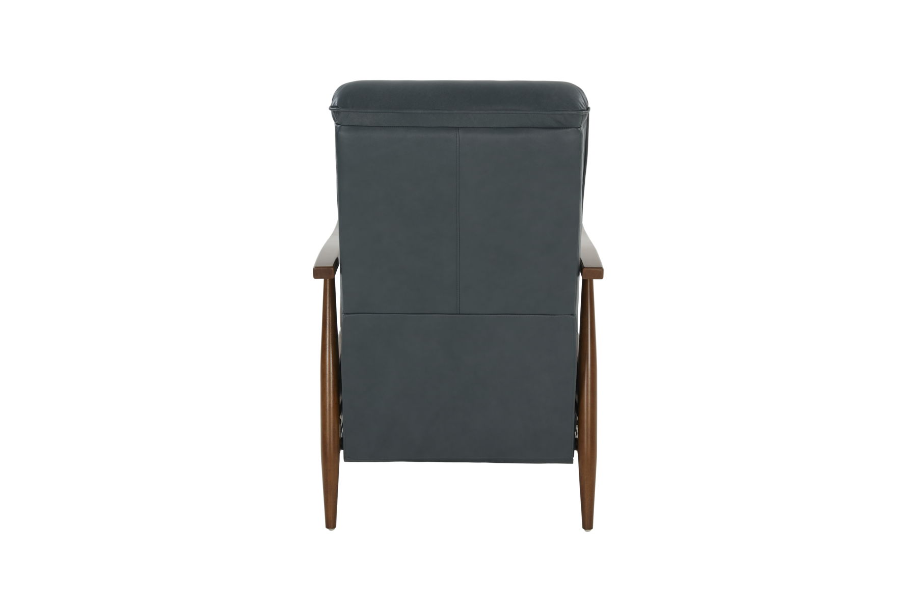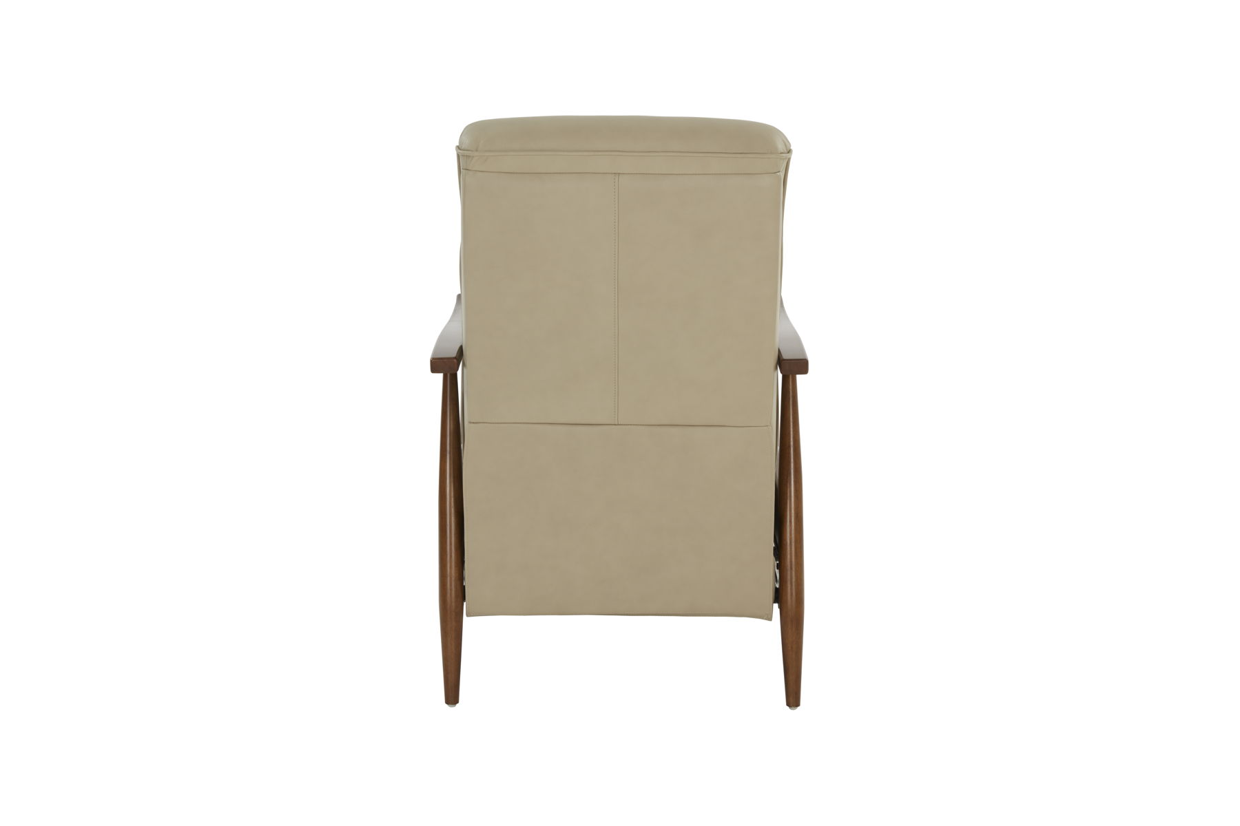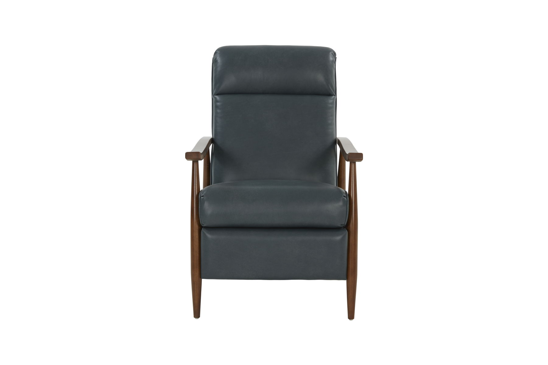 Mid-Century Modern, exposed wood frame push thru the arm 3-way recliner featuring a bull nose seat cushion with pocketed coil springs encased in foam and wrapped in Dacron, split 41.8” high pub back.