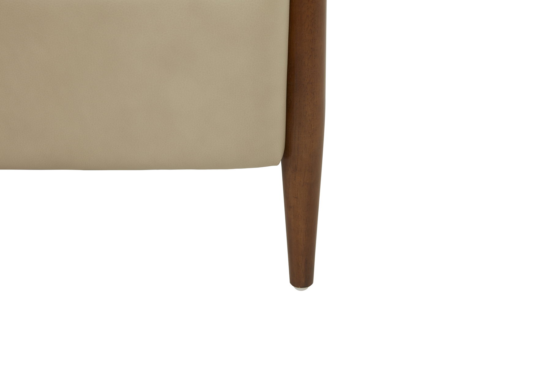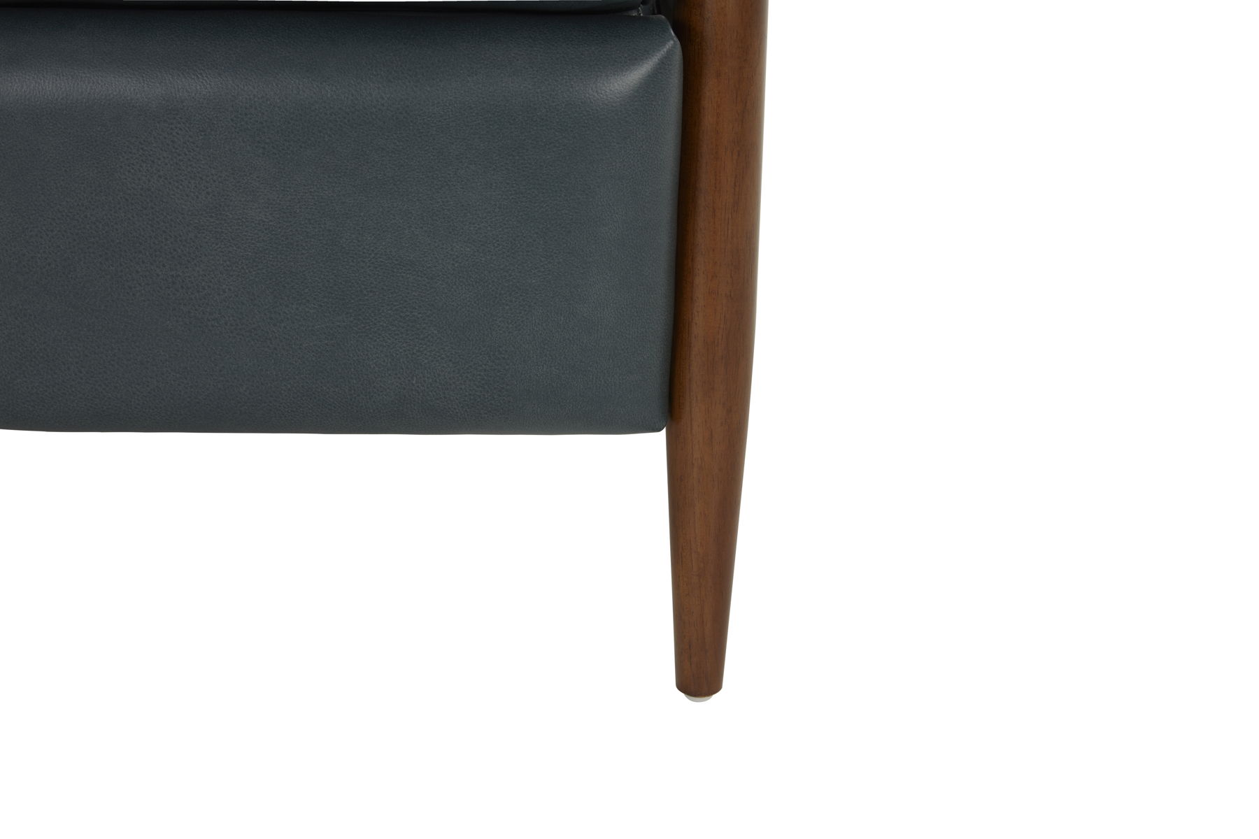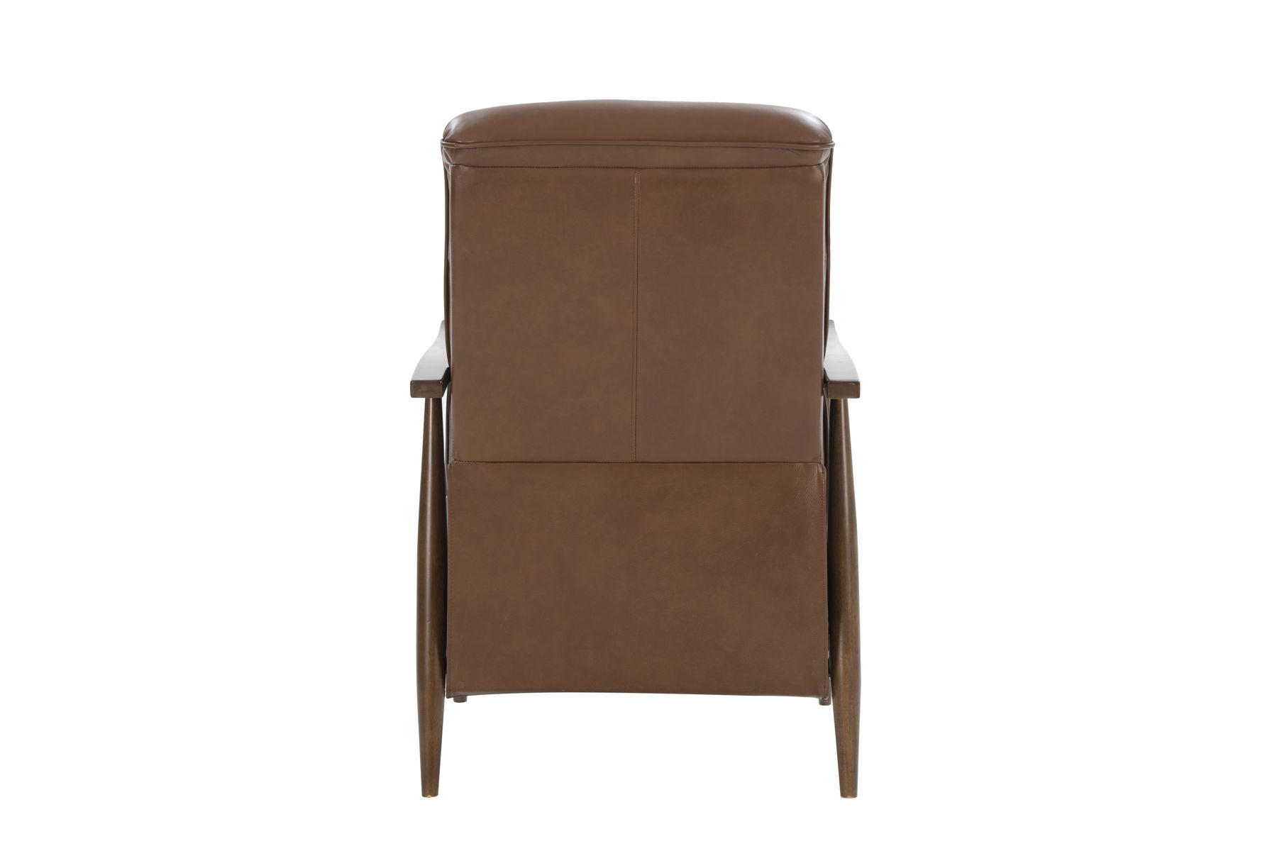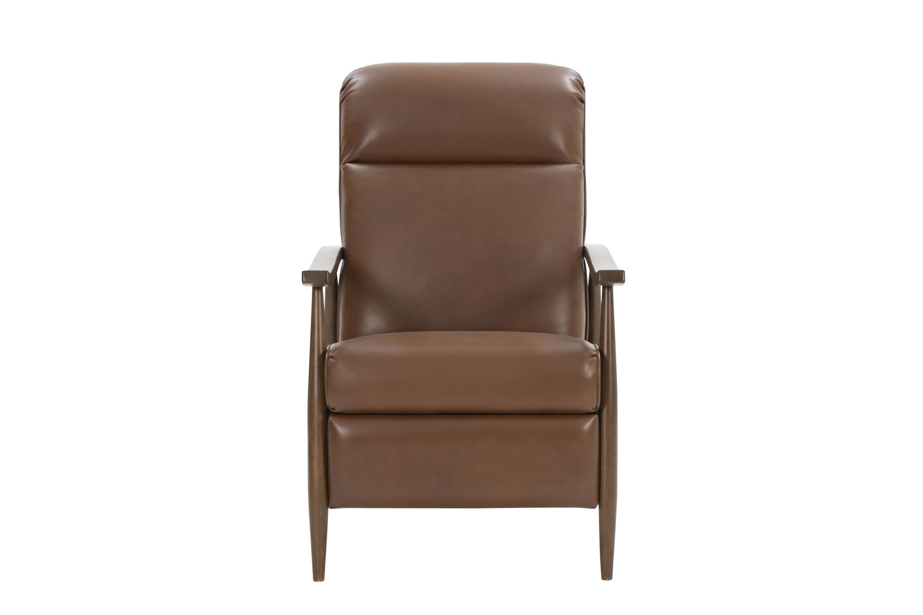 Mid-Century Modern, exposed wood frame push thru the arm 3-way recliner featuring a bull nose seat cushion with pocketed coil springs encased in foam and wrapped in Dacron, split 41.8” high pub back.