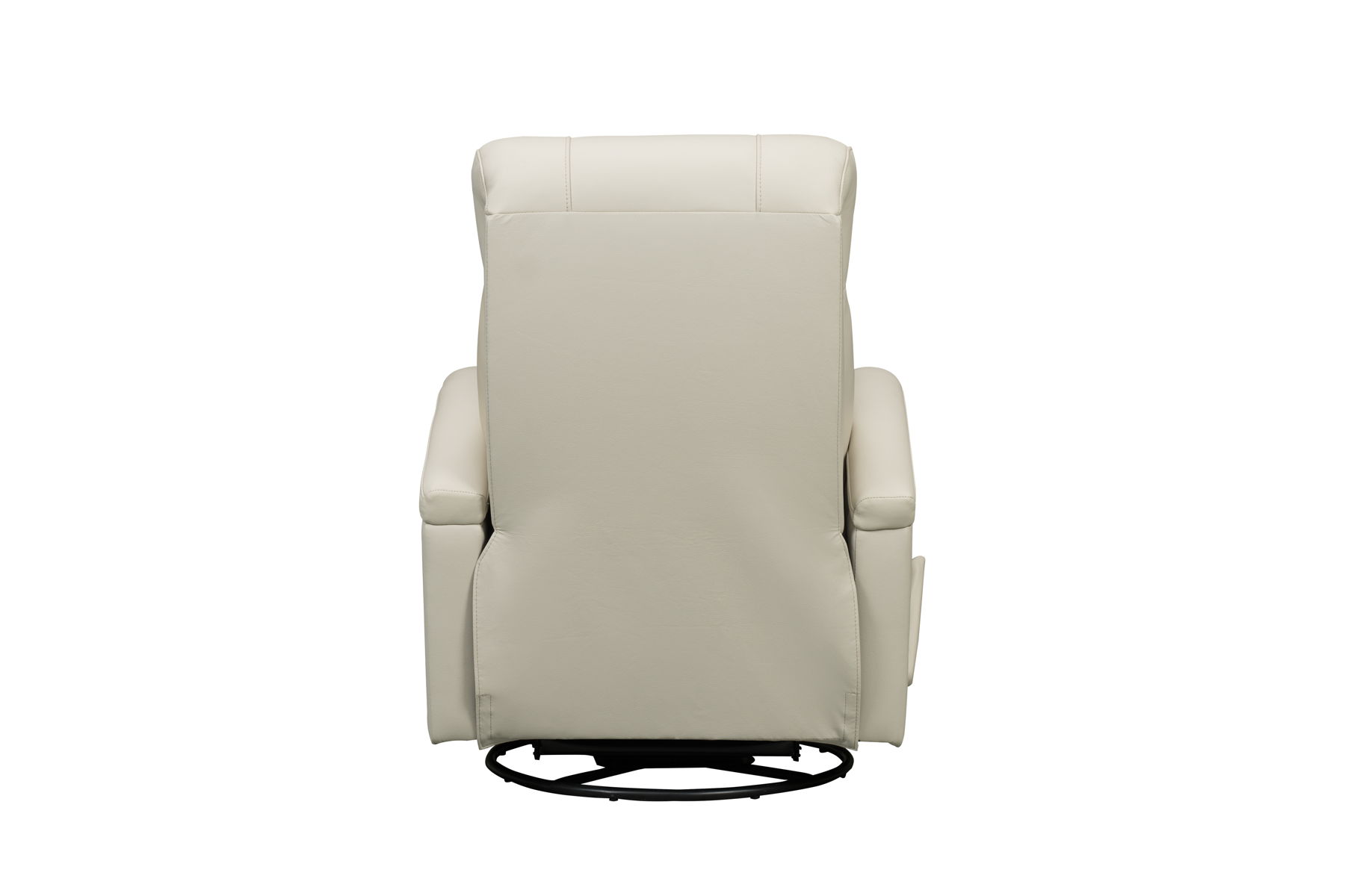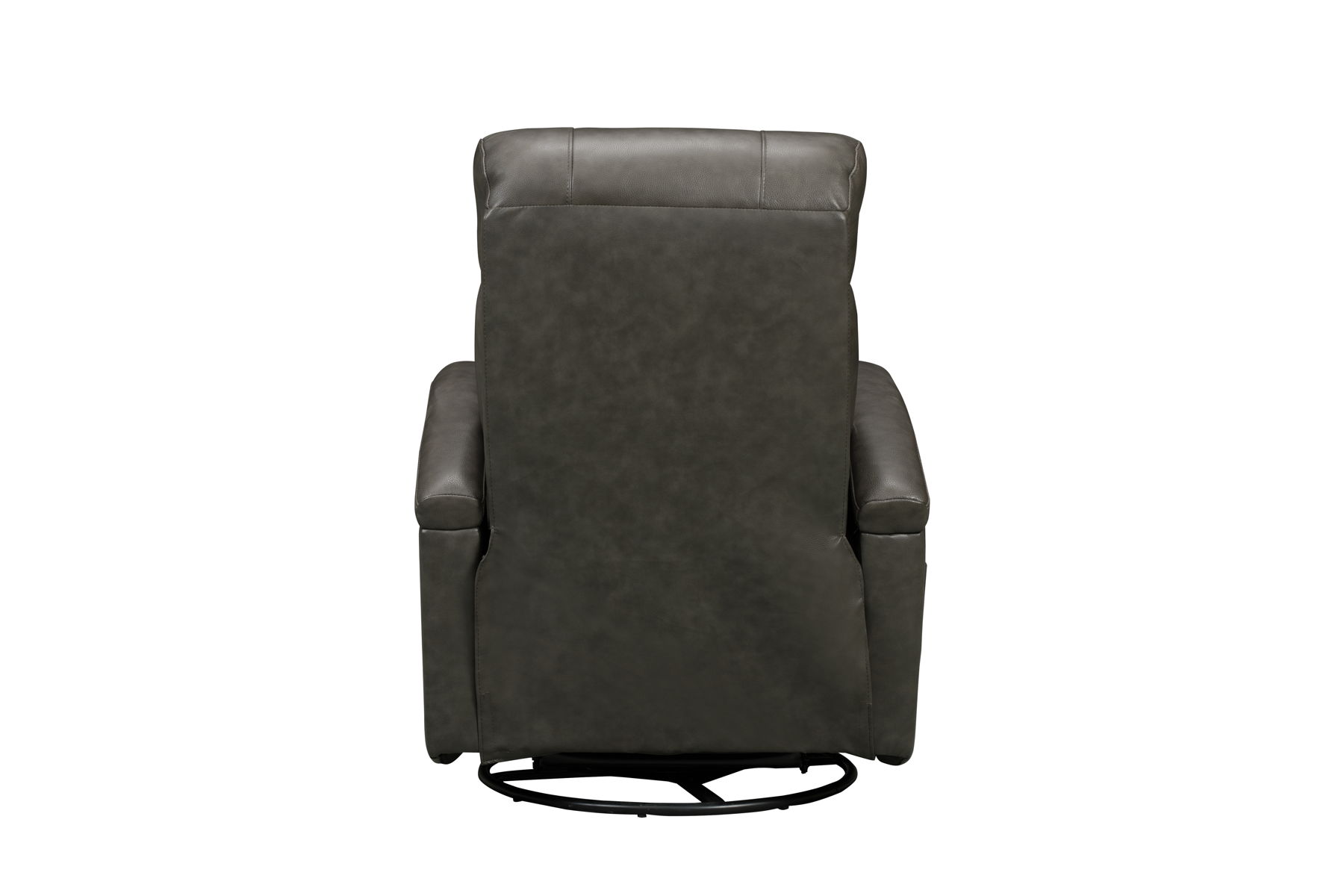 Contemporary open arm design, 360-degree swivel glider recliner with handle activated recline. Split pub back, boxed style pad over chaise seating with pocketed coil springs, plushily padded radius track arms, and single needle top stitch detail. A statement piece for any room