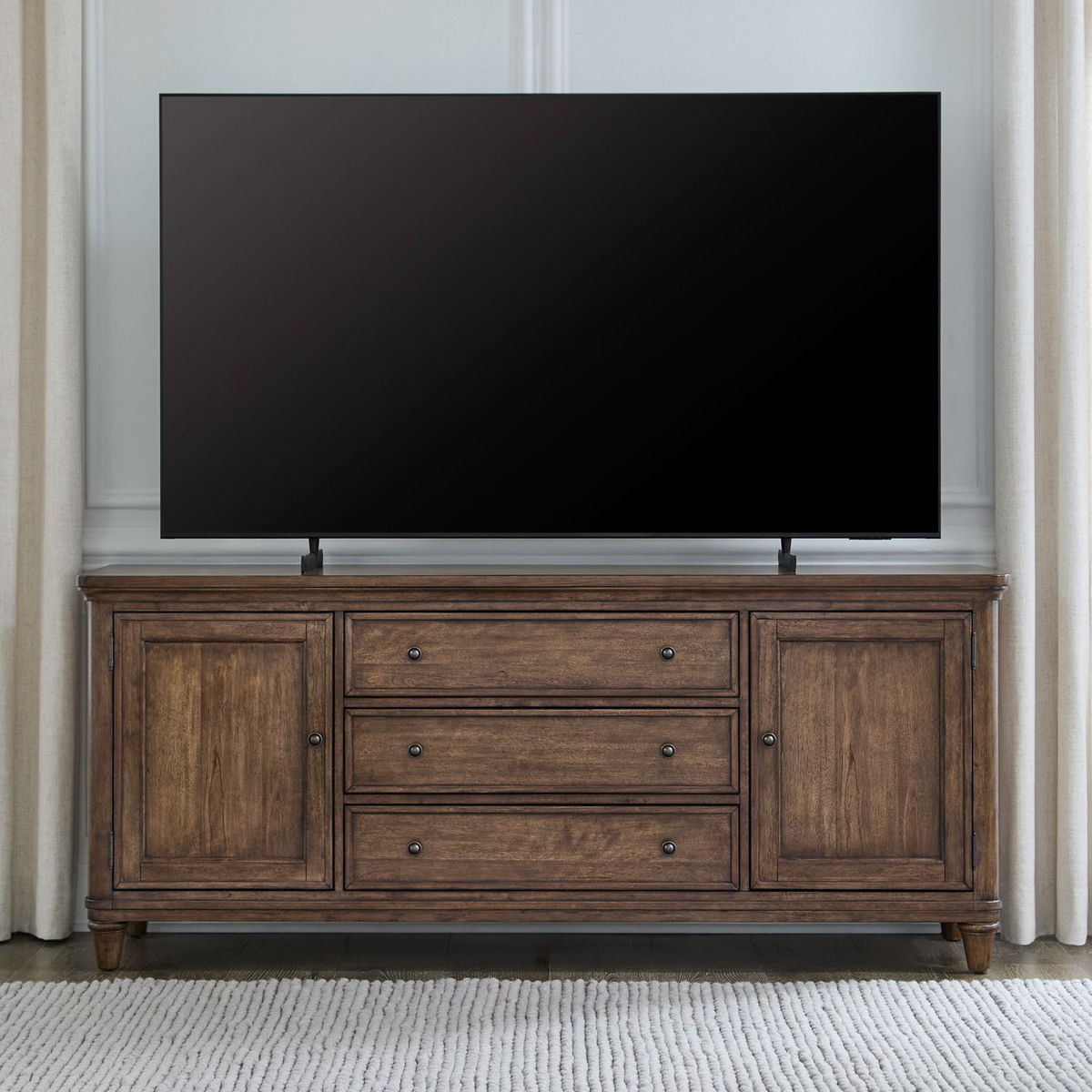 The Harrison Heights Entertainment Collection brings classic beauty and everyday functionality to your living space. Crafted of Rubberwood solids with Rustic Birch veneers in a rich Sienna finish, each piece features a stunning 4-way match fancy face veneer top that adds depth and elegance. Thoughtful design details-including wood-framed accents, square wood-framed molding, and versatile storage options such as drawers, shelves, and cabinets-keep your space organized while elevating its style. Softly rounded corners and gracefully turned legs complete the timeless look, blending traditional charm with modern convenience.