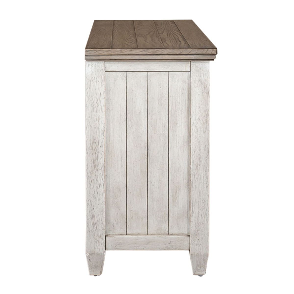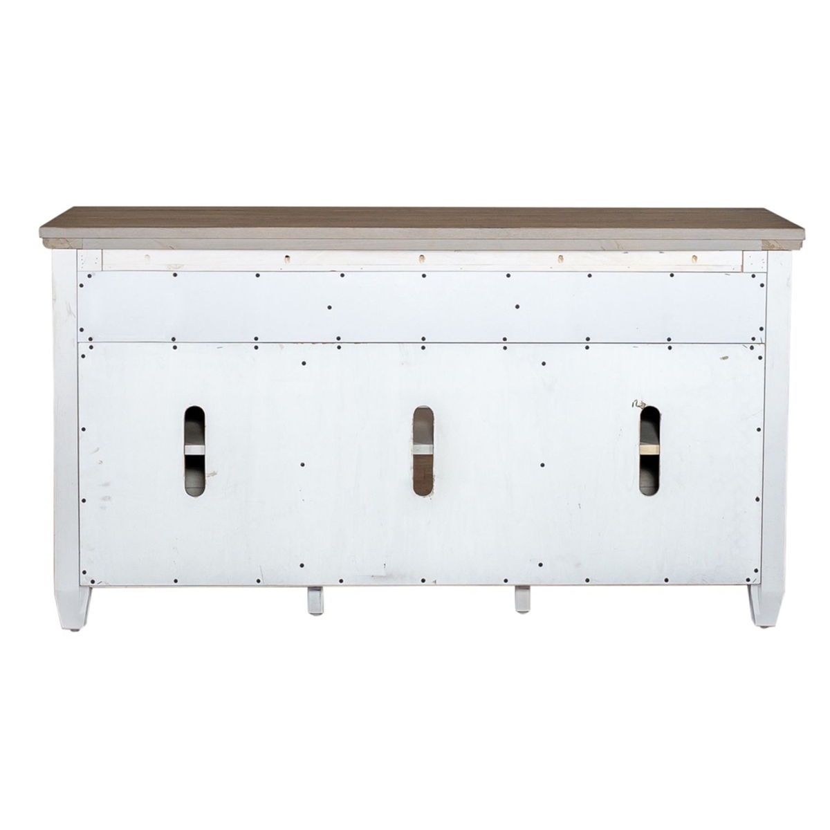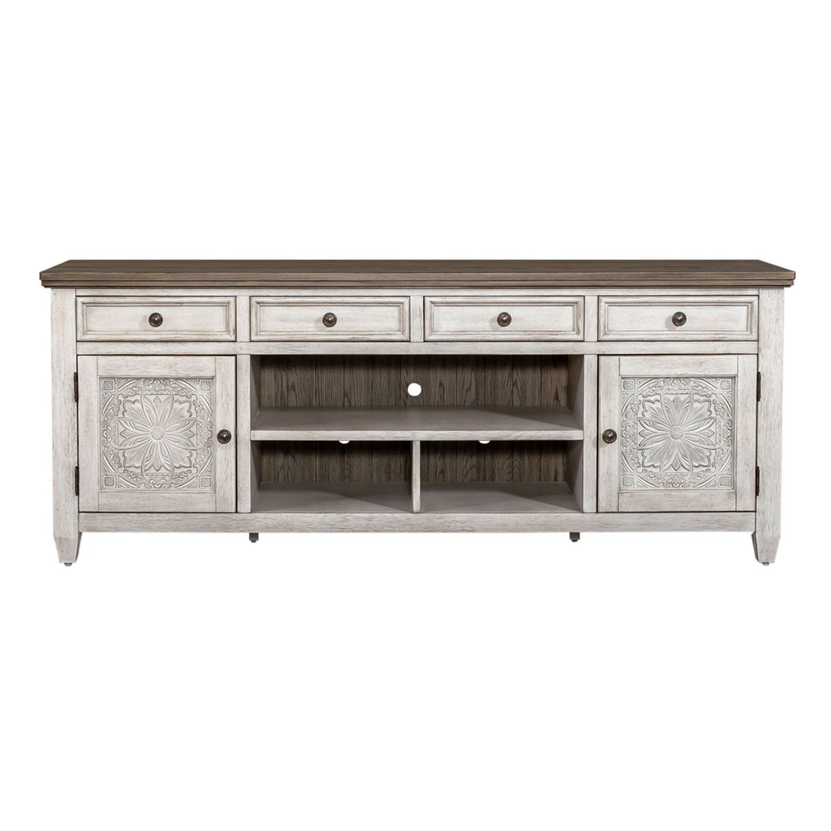 Accent your living room with the perfect vintage design, using this unique and stylish tile tv console. Crafted with rubberwood solids and cathedral white oak veneers, this piece accommodates most TVs and features an antique white finish with tobacco tops, three drawers, planked tops, full extension drawer glides for easy access to storage, two reversable/interchangeable decorative door panels, making this piece customizable, and is accented by timeless antiqued brass knob hardware. With today’s modern technology in mind, users can enjoy the convenience of the open compartment areas and wire management provisions to hide those pesky wires from your electronics or gaming equipment.