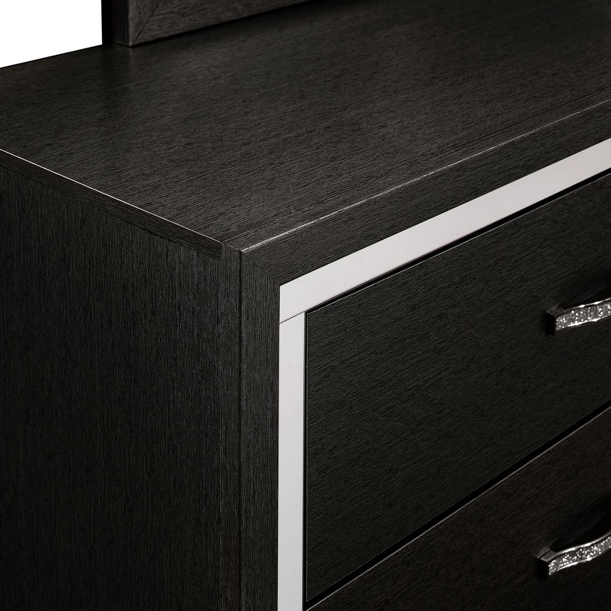 The Huxley 6-Drawer Dresser offers a perfect blend of contemporary glam and durable craftsmanship for your bedroom. This dresser is meticulously crafted from manufactured woods and eco-friendly decorative laminate, ensuring it will last for years. The design features clean lines with metallic accents and flared silver legs for a modern touch. Its finish provides a sleek, sophisticated look that is both timeless and modern, with bold highlighting the metallic accents and smooth surfaces to create a chic, polished aesthetic. The drawers, constructed with English dovetail joinery, roll smoothly on center glides for long-lasting operation. Functional and fashionable, this dresser provides ample storage for clothing, with chic, crystal-studded drawer pulls for easy access.