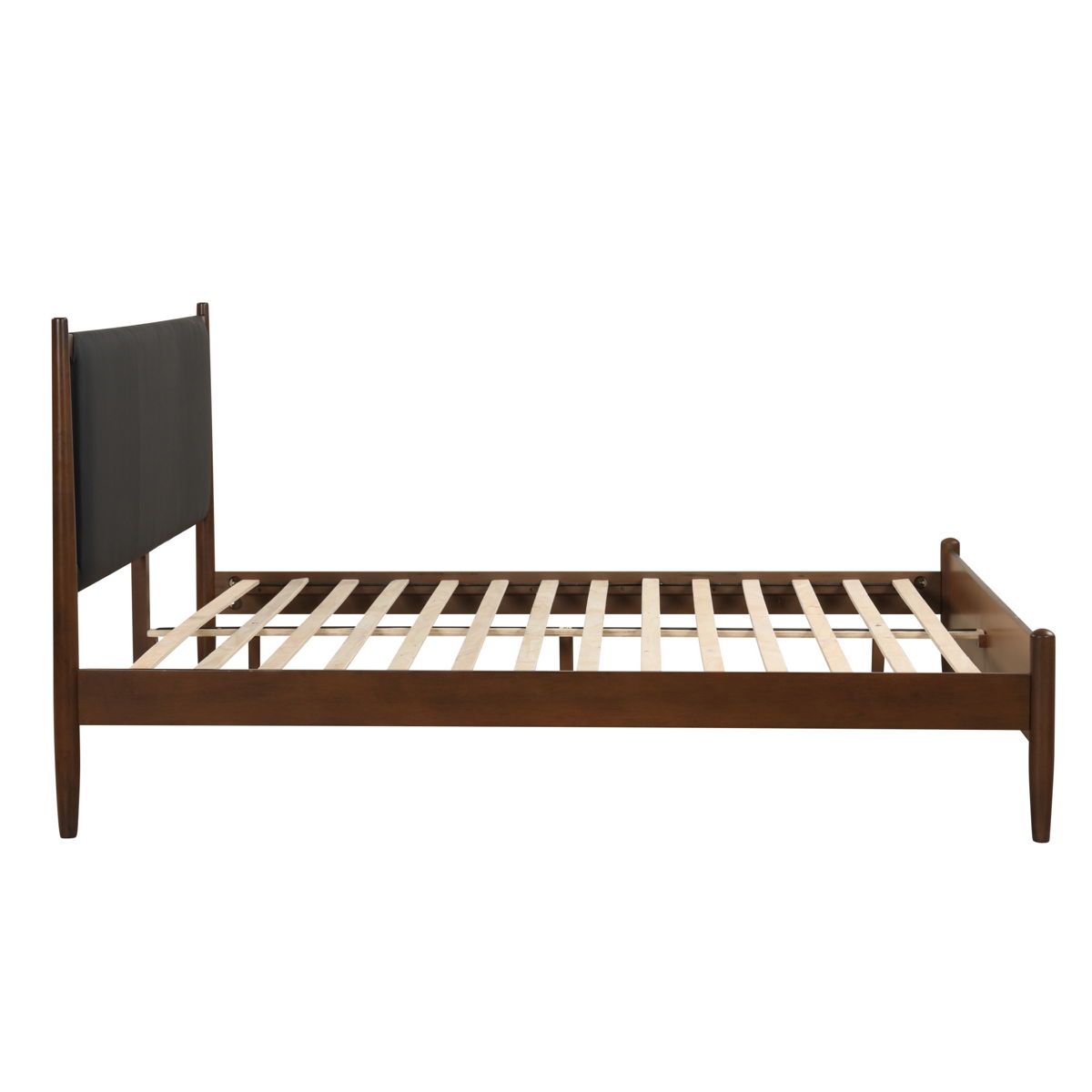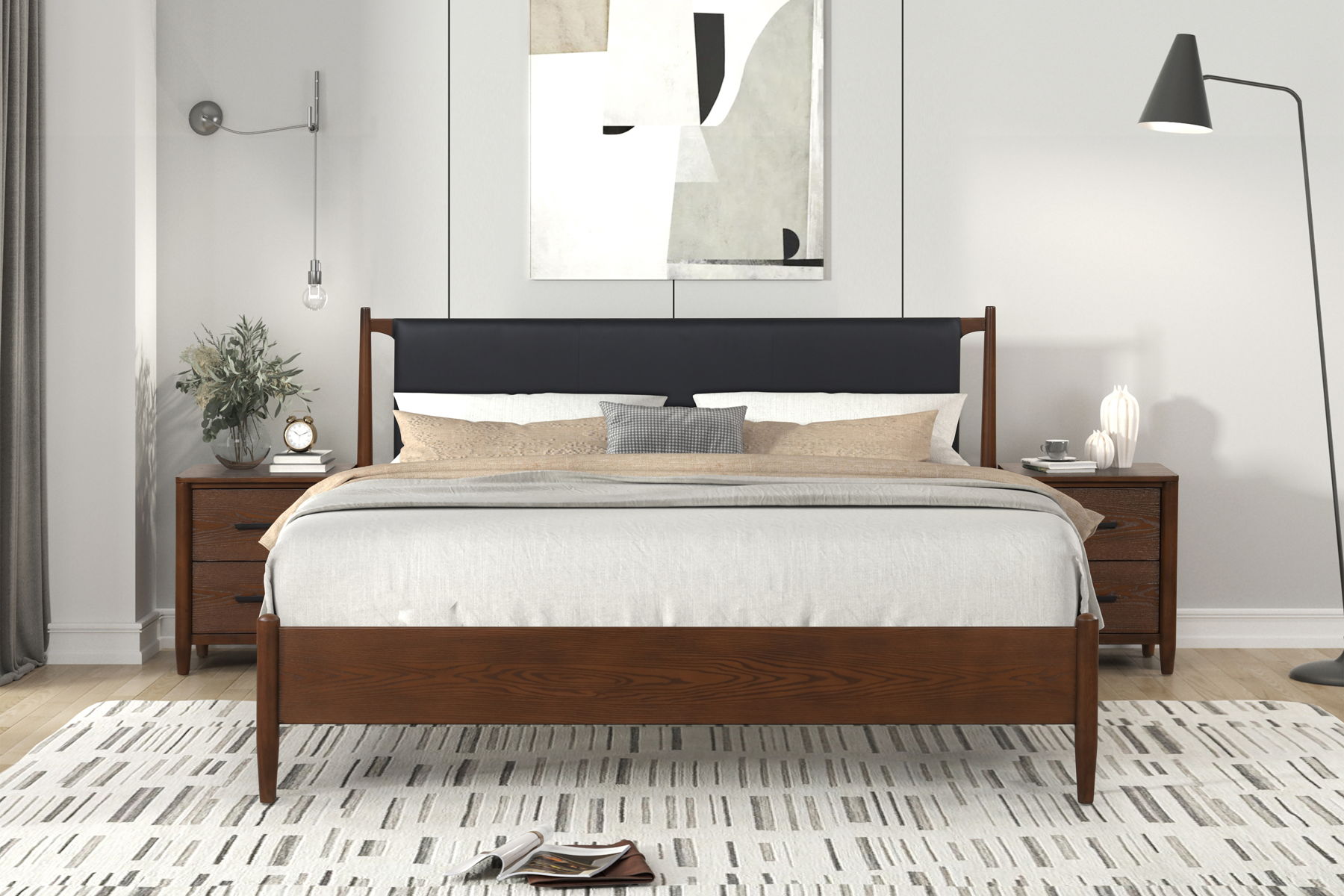 Meet the Ian Bed, a modern marvel of durability and style. Crafted from Rubberwood solids and manufactured wood, this bed boasts a sturdy construction that promises years of reliable use. Its warm finish, achieved through a meticulous multistep process, not only enhances the wood grain but also lends a welcoming ambiance to any bedroom. The cozy padded headboard, upholstered in striking black PU, serves as a comfortable backrest for those leisurely moments in bed. With its modern design featuring slim lines and tapered posts, the Ian Bed effortlessly channels a mid-century modern or casually contemporary vibe, adding a touch of sophistication to your sleeping space. Experience the perfect blend of durability, comfort, and style with the Ian Bed.