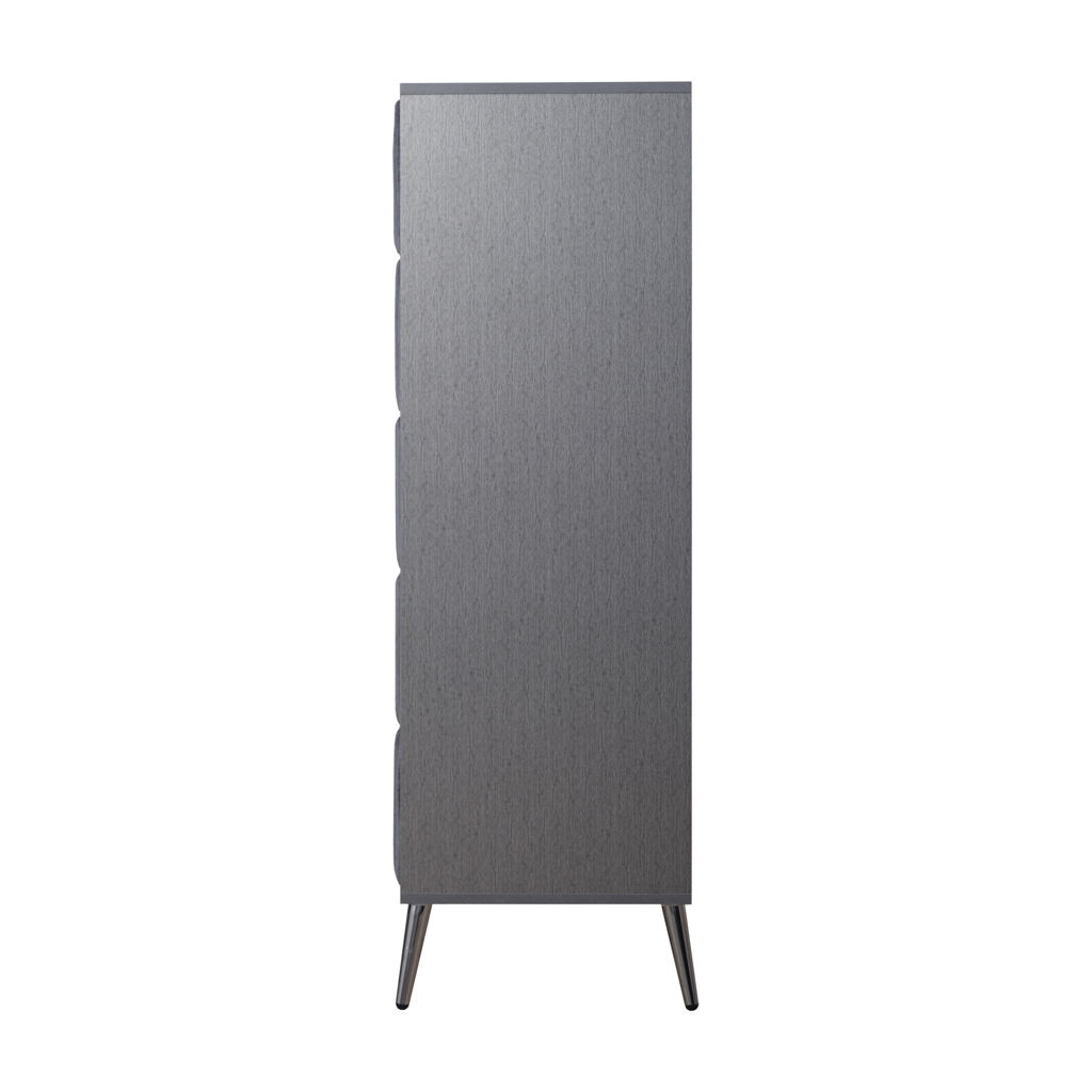 The Kailani 5 Drawer Chest is a perfect blend of modern design, durability, and eco-friendly construction, making it an ideal addition to any bedroom. Expertly crafted from a mix of solid rubberwood, engineered wood, and eco-friendly decorative laminate, this chest offers lasting style and sustainability. The laminate finish not only enhances the chest’s appearance but also provides superior resistance to scratches, moisture, and stains, ensuring its beauty with minimal maintenance. The chest features a modern minimalist design with clean lines, a sleek silhouette, and a chic ribbed texture, complemented by slim metallic handles and tapered legs that add both elegance and durability. The drawers, wrapped in luxurious 100% Polyester Velvet and accented by chrome pulls, bring a touch of sophisticated glamour to your space. Each drawer is designed for seamless functionality with fully finished interiors, full-extension slides, and dovetail joinery, providing smooth, snag-free storage and lasting strength. The Kailani 5 Drawer Chest combines style, function, and sustainability, making it a standout piece in any modern bedroom.