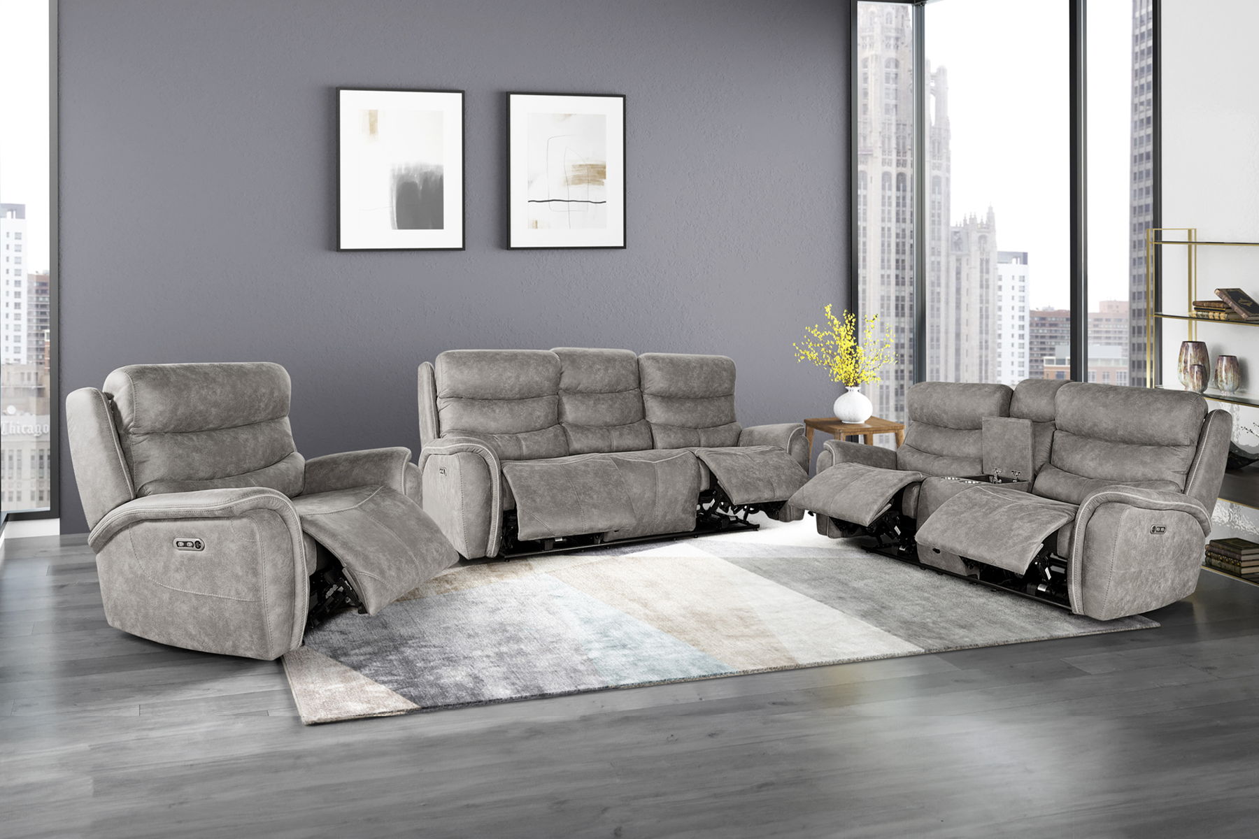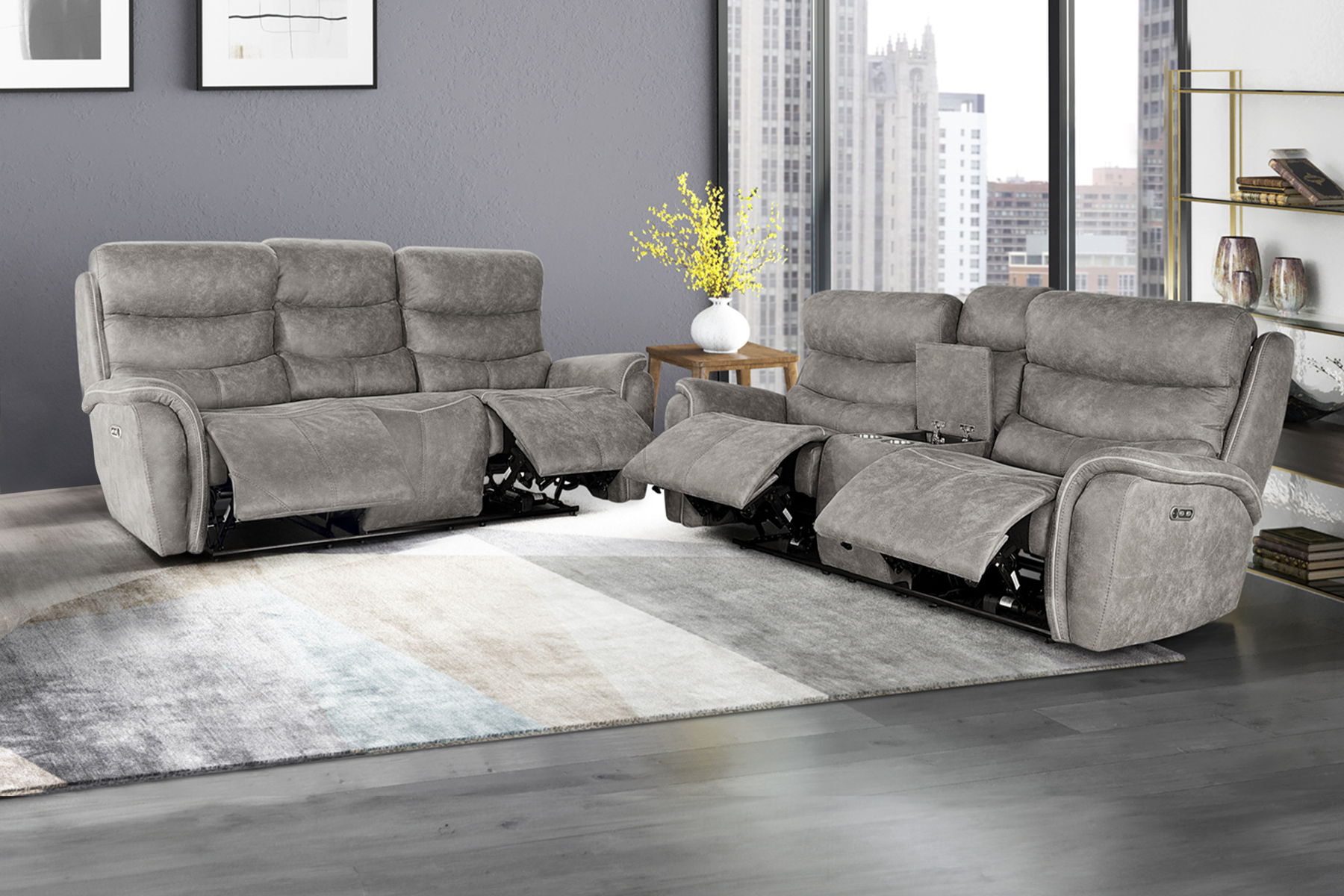 Indulge in the luxurious comfort of the Kamari Reclining Sofa Set. Crafted with a sumptuously soft dappled gray upholstery, this set invites you to sink into relaxation. Tailored to perfection, its triple roll backs, bucket seats, and wrap-around arms exude sophisticated style, accentuated by tasteful contrasting welt detailing. Recline and unwind with fully upholstered chaise recliner footrests, offering unparalleled comfort. Built for lasting support, hardwood and manufactured wood frames, coil spring cushions, and resilient foam ensure durability and coziness for years to come. Convenience meets style with the loveseat”s center console for remote storage and built-in cupholders for your beverages. Versatile in design, whether your taste leans contemporary or traditional, this set effortlessly complements any decor.