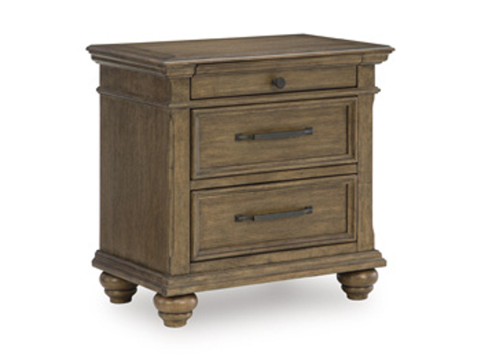 Timeless design meets everyday comfort in this nightstand. The rich brown finish of its stunning oak veneer highlights the natural beauty of the wood grain. Classic bun feet and moulding details add a timeless touch, complemented by a felt-lined accessory drawer that keeps delicate essentials neatly tucked away. Thoughtfully crafted, this nightstand appeals to those who appreciate luxury in every detail.