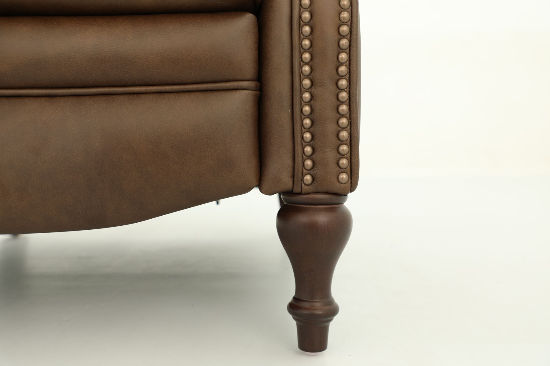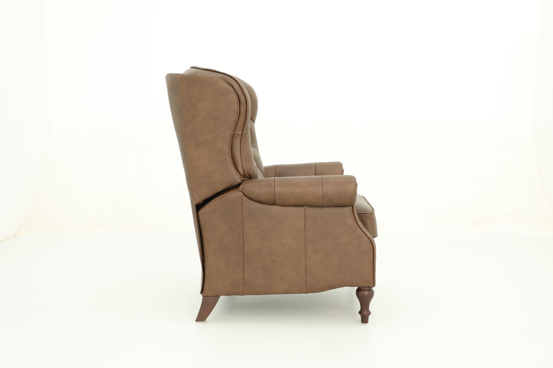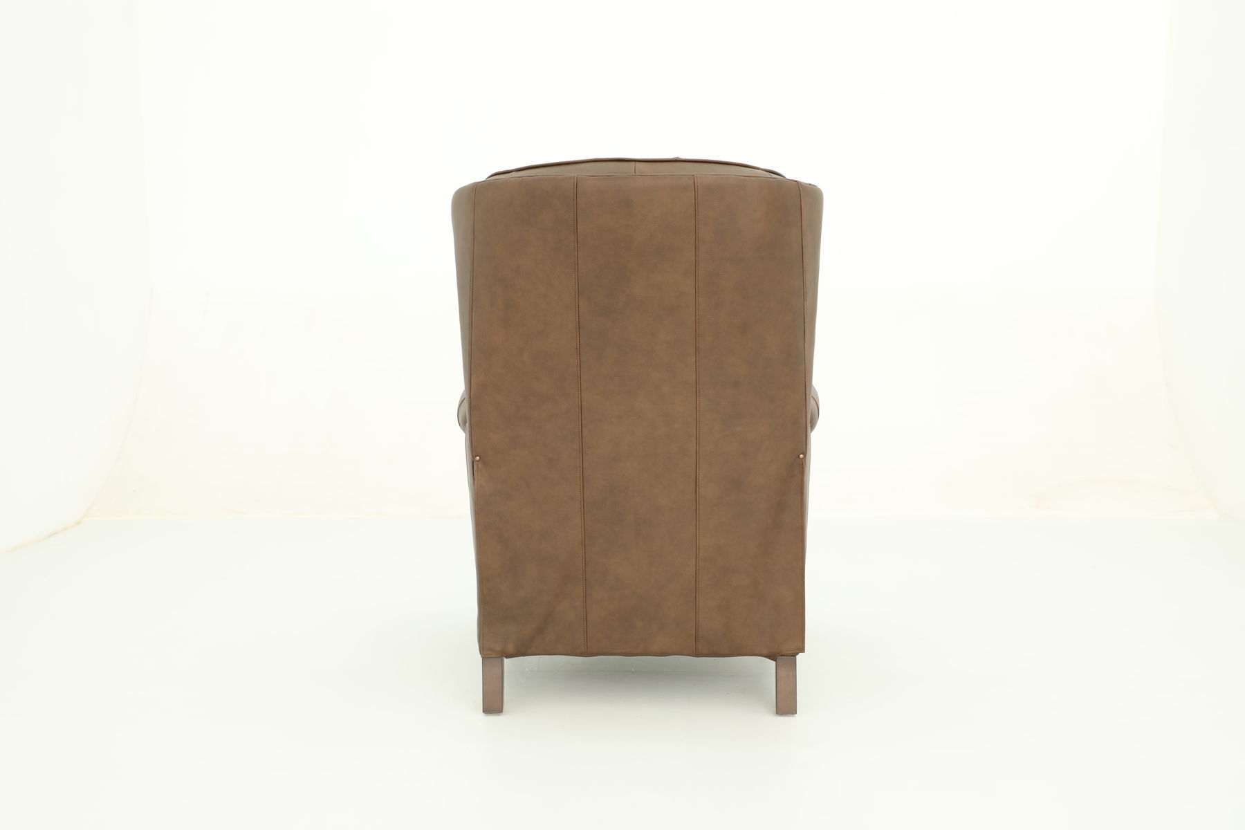 An updated classic with a unique 44.5” high barrel back with button tufting. This push thru the arms wing chair is accented with nail head trim, shaped ottoman board and knee back rolled arms. Welted, loose box seat cushion contains pocket coil springs with a down wrap that will provide years of comfort. Hand carved wood legs complete this look.