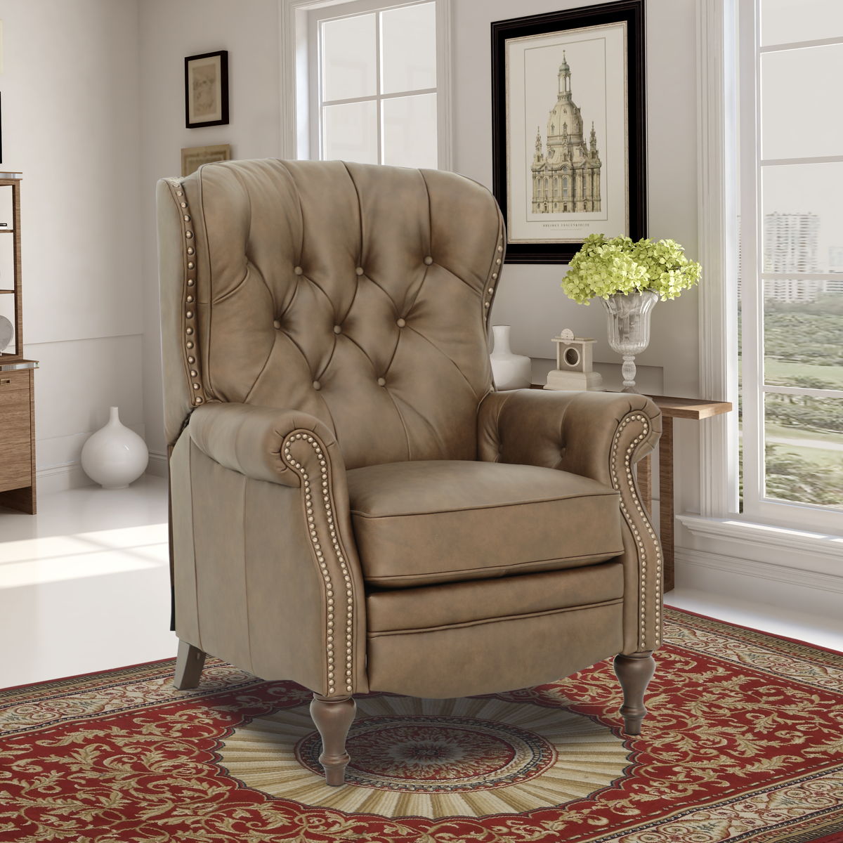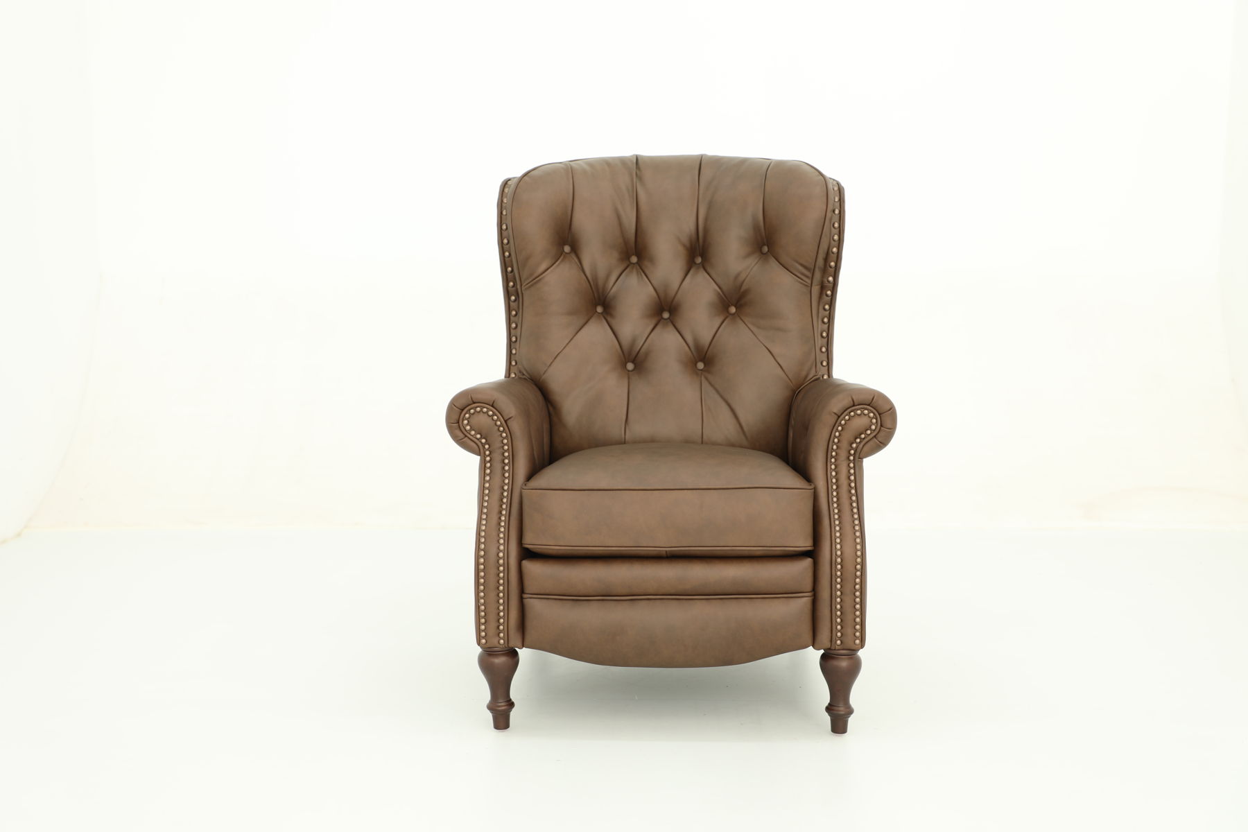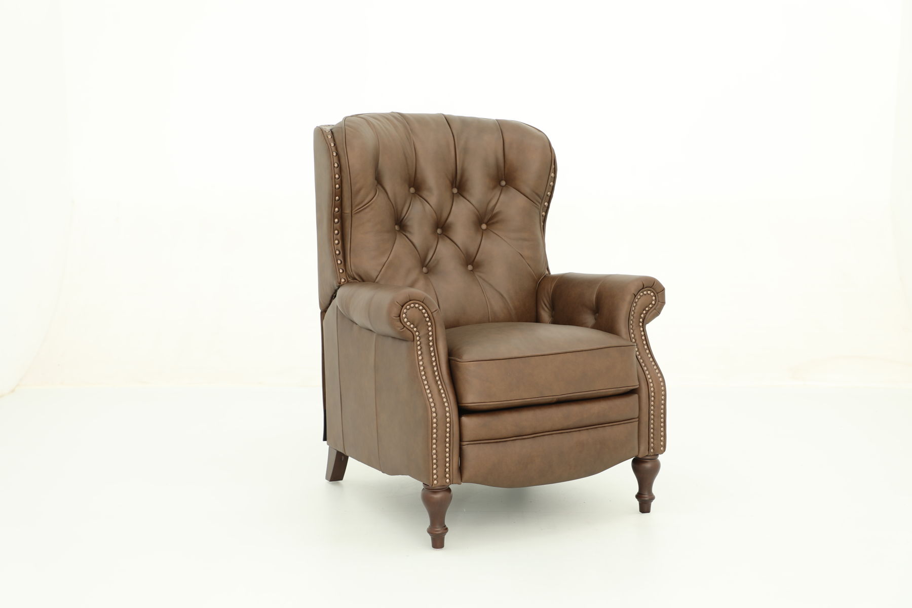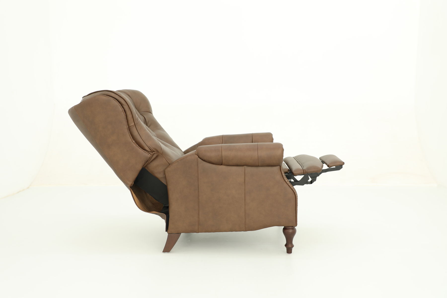 An updated classic with a unique 44.5” high barrel back with button tufting. This push thru the arms wing chair is accented with nail head trim, shaped ottoman board and knee back rolled arms. Welted, loose box seat cushion contains pocket coil springs with a down wrap that will provide years of comfort. Hand carved wood legs complete this look.