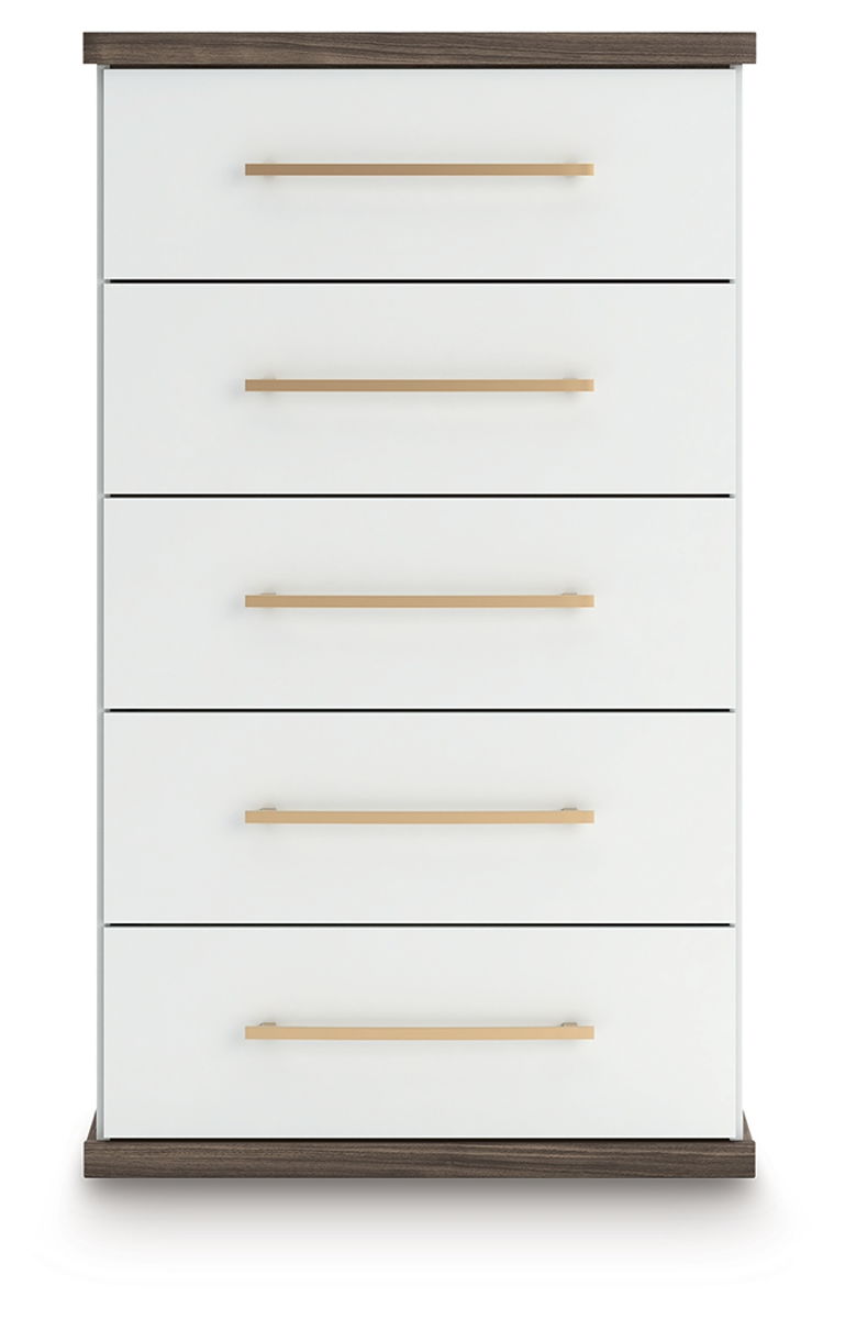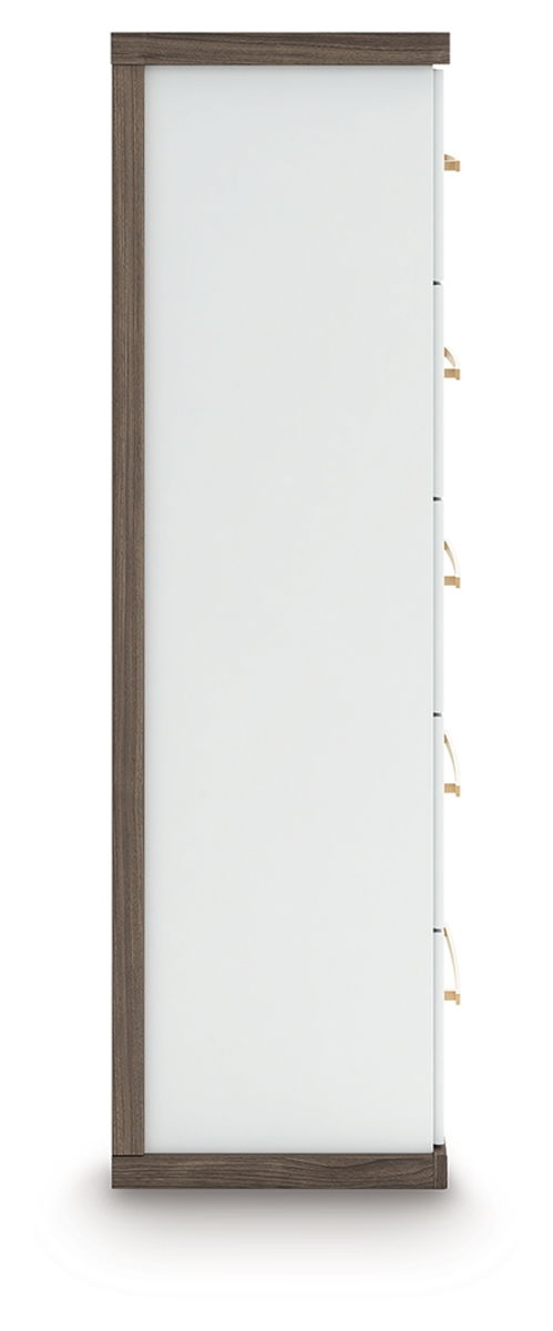 Looking to make a subtly striking statement in your bedroom? We’ve got you covered. This chest of drawers’ sophisticated two-tone treatment marries a warm brown finish over replicated walnut grain with a matte white finish. Rounded corners and a thick top radiate an air of modern panache, while sleek handles in a champagne finish add a sparkling touch to the spacious drawers. It’s a master class in contemporary yet comfortable character.