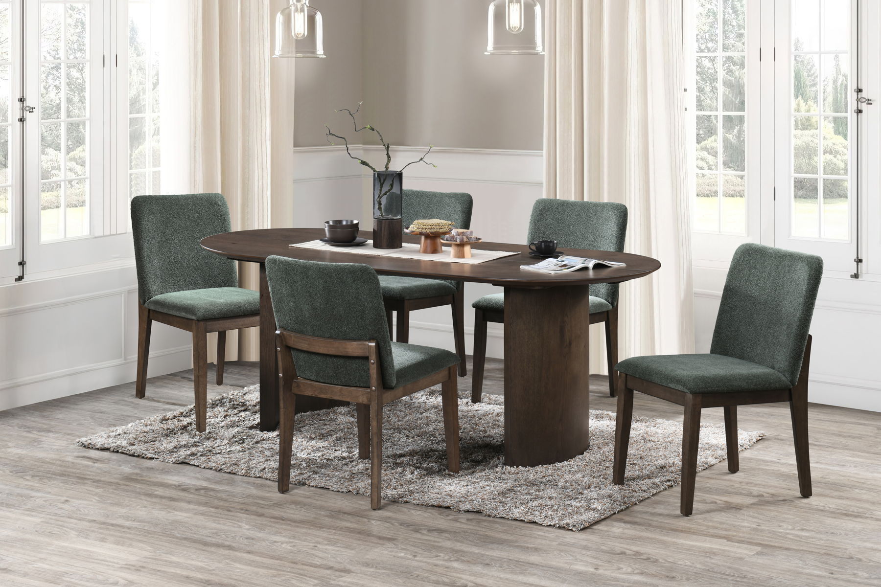 The Kody Dining Set features a durable oval table and chairs, crafted from solid rubberwood, engineered woods, and oak veneers. A rich finish brings out the natural grain. The table’s sleek shape and pedestal base offer modern sophistication, while plush foam seats in textured forest green polyester provide comfort and easy care. Seating for six makes this set ideal for family dining or casual entertaining.