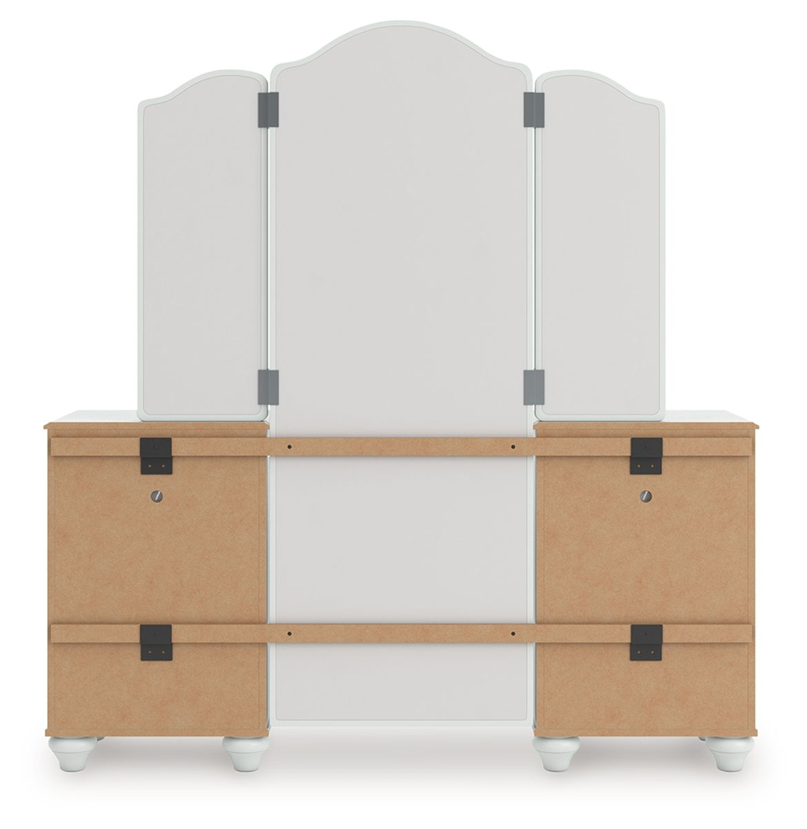 Fit for a princess. This vanity with mirror’s crisp matte white finish pairs with charming ornate beading details—perfect for your girly girl. The mirror’s ambient lighting adds a touch of romance, while the bun feet and crystal knobs on the cabinet are the crowning touches to make your little one feel like royalty.
