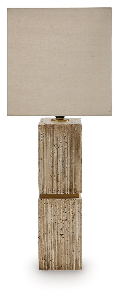 - Made of faux travertine and metal with rectangle hardback fabric shade
