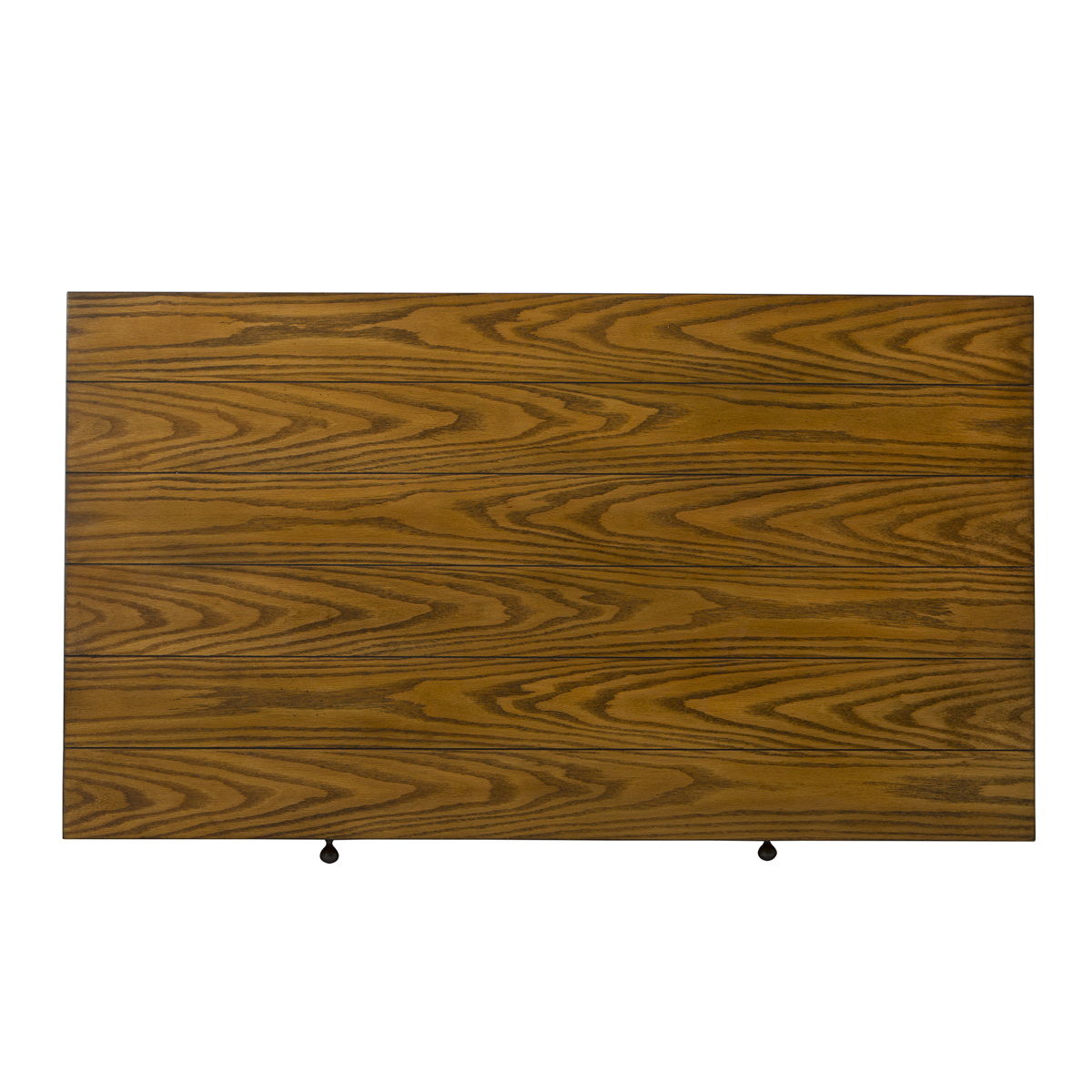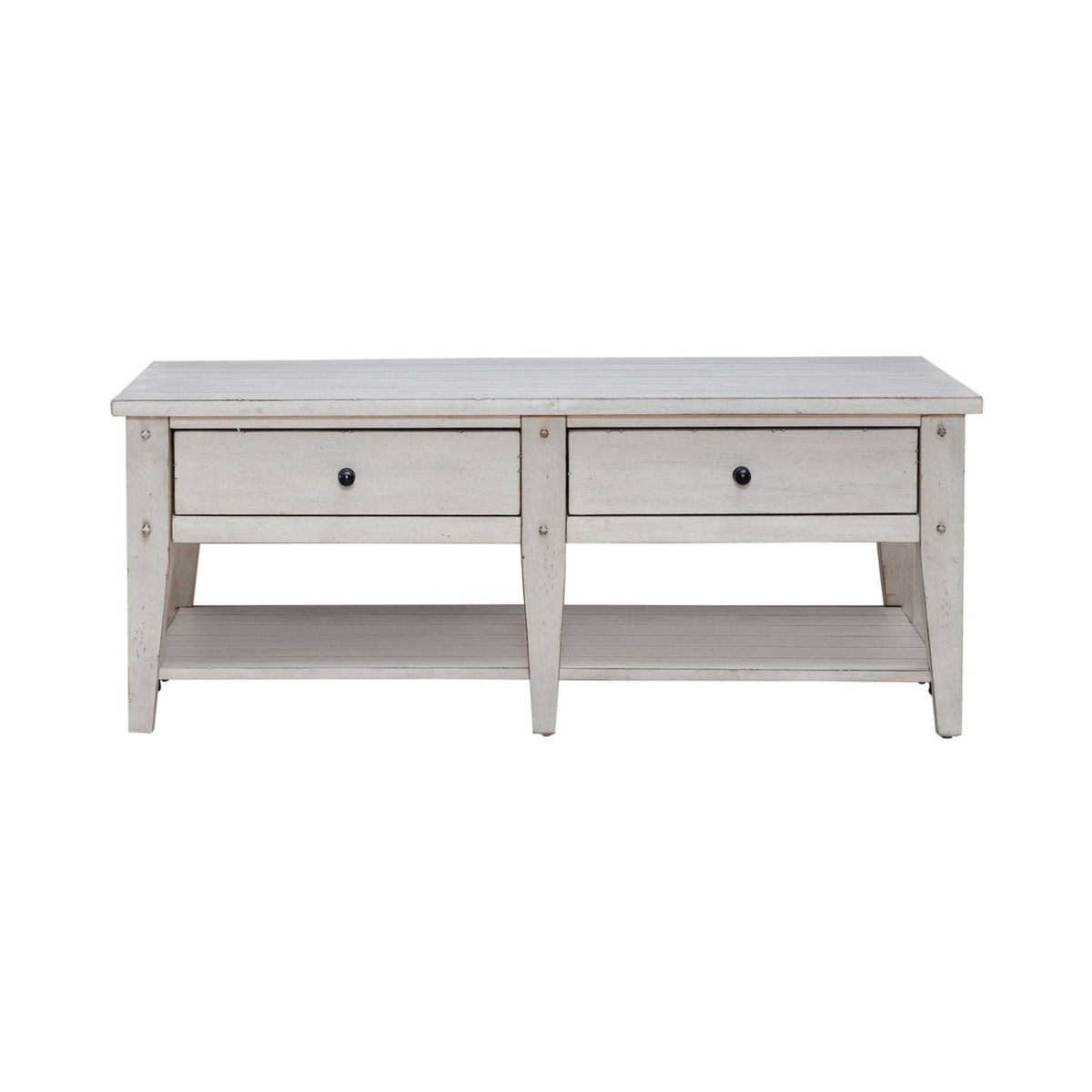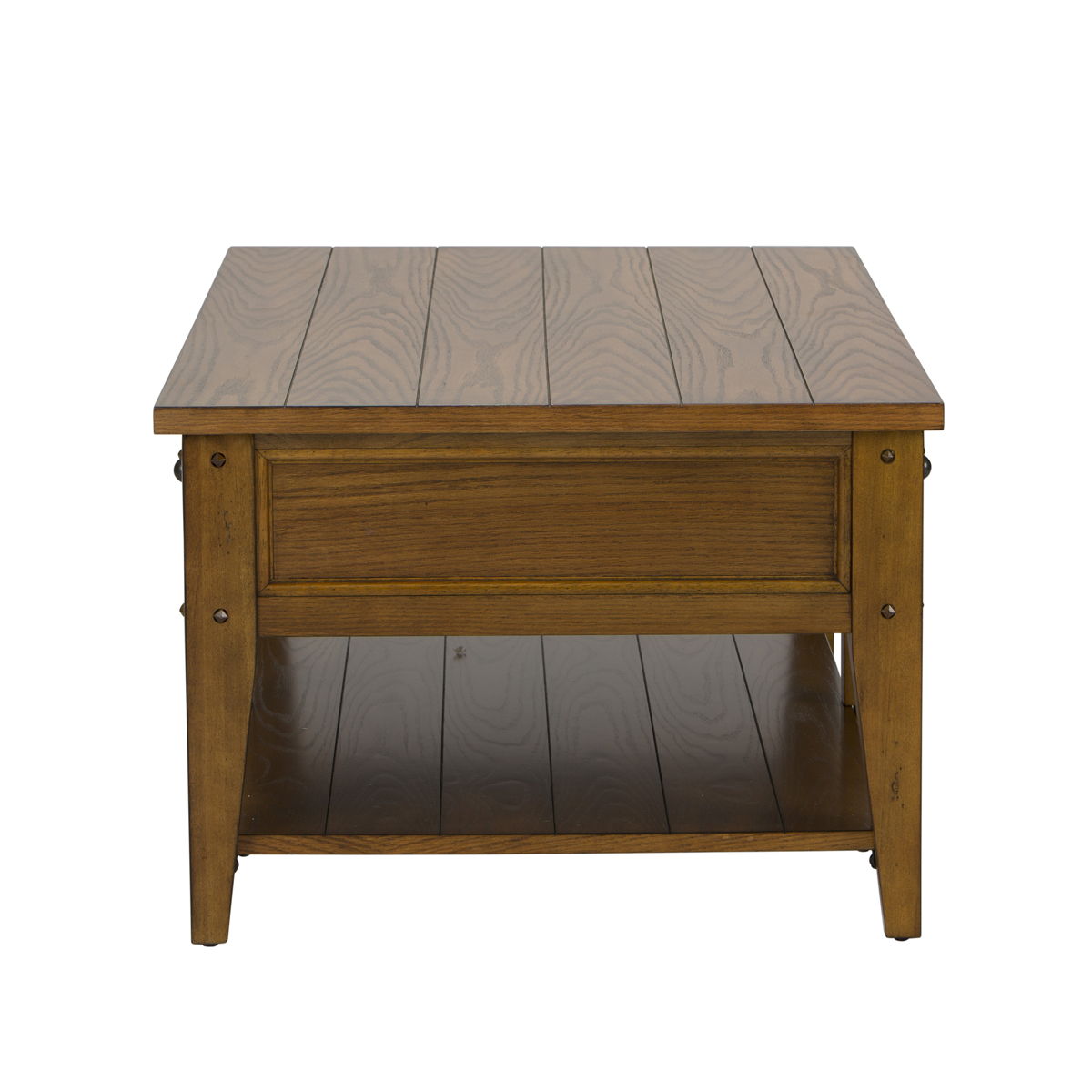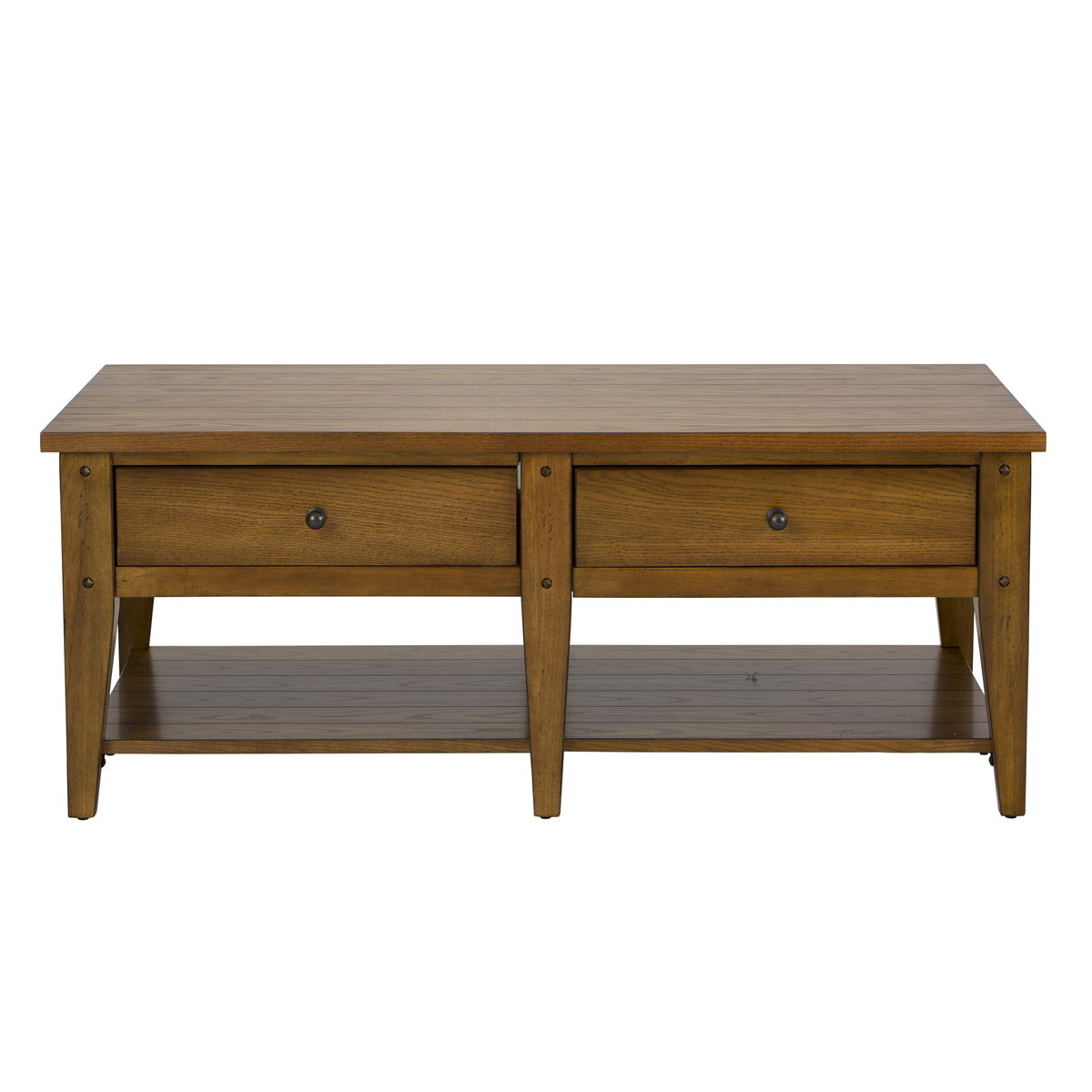 Enjoy family game night around the Lake House cocktail table. Crafted of poplar solids and oak veneers, this piece features an }appealing planked tops with additional wood and peg accents, planked bottom shelf, two push-through drawers accented by antiqued brass knob hardware, anchored by a tapered leg design. The golden oak finish allows for a universal appeal.