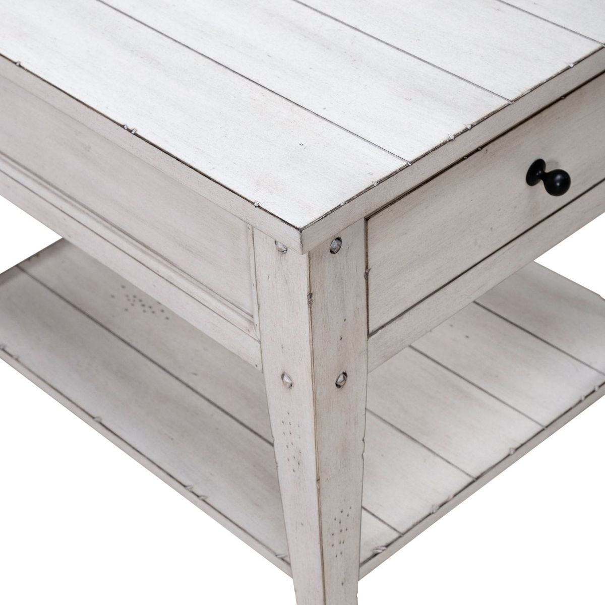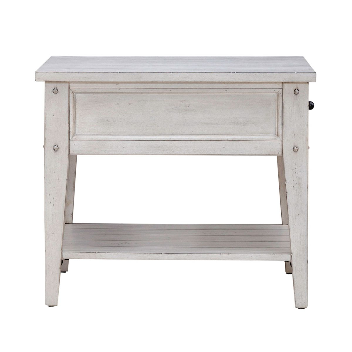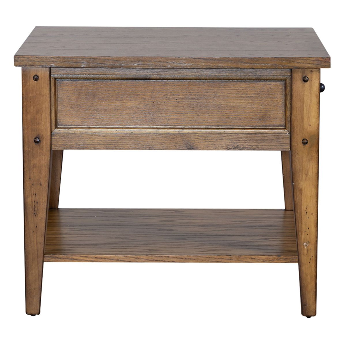 Enhance your space with the casual country style Lake House end table. Crafted of poplar solids and oak veneers, this piece features an appealing planked top, one planked bottom shelf, one drawer for additional storage, simplistic wood and peg accents, antiqued brass knob hardware, anchored by a tapered leg design. The golden oak finish allows for a universal appeal.