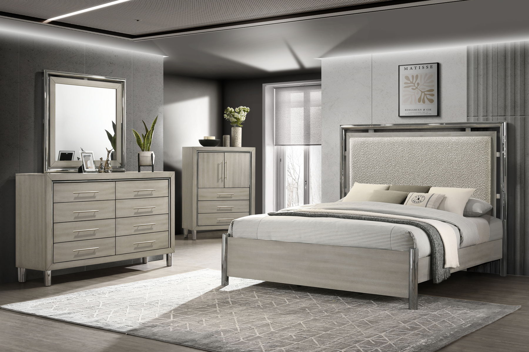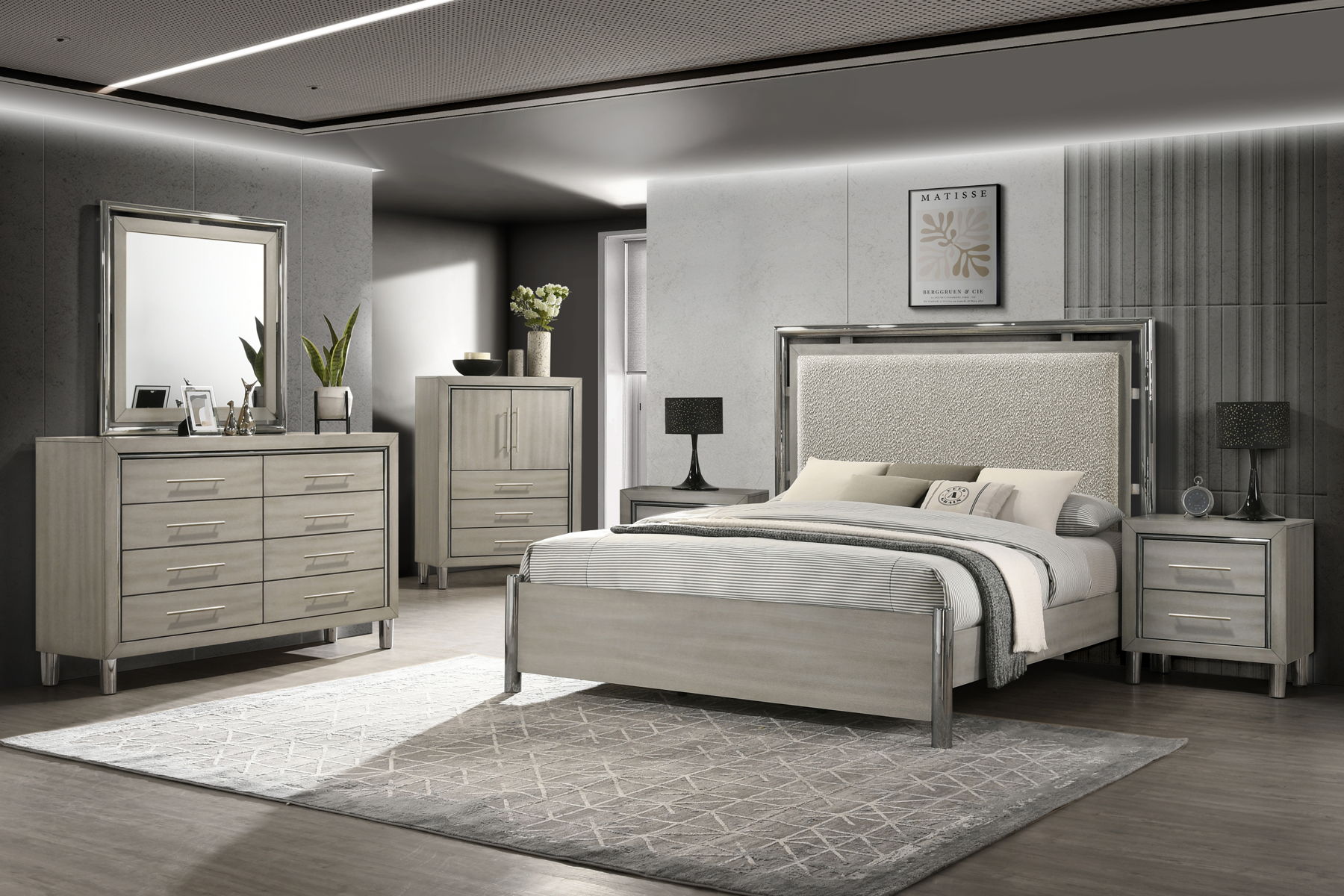 The Lennox Bedroom Set combines modern elegance, superior craftsmanship, and practical functionality to create a chic and inviting retreat. This set includes an upholstered panel bed, dresser, mirror, and nightstand, all meticulously crafted from premium engineered woods and finished with an eco-friendly gray ash laminate. Its contemporary design is enhanced by lustrous metallic accents that replicate the sleek look of stainless steel while providing exceptional durability and scratch resistance. Spacious storage drawers in the dresser and nightstand feature four-corner English dovetail joinery, smooth ball-bearing glides, and fully finished interiors for snag-free storage and seamless operation. Perfectly balancing style and durability, the Lennox Bedroom Set is an ideal choice for elevating any modern bedroom.