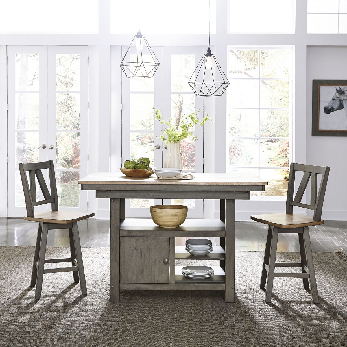 Wow family and friends with the Lindsey Farm kitchen island table. Crafted of rubberwood solids, and is accented with a wooden knob hardware. This table features on 18” self-storing leaf on an easy guide system. The storage base features two wood panel doors with one shelf located behind them, a smaller open shelf for storage, and one large open shelf directly beneath the top for display items. The end panels feature a V-shaped pattern. Lindsey Farm offers looks that easily work in today’s homes with style uncompromised and comfort abound.