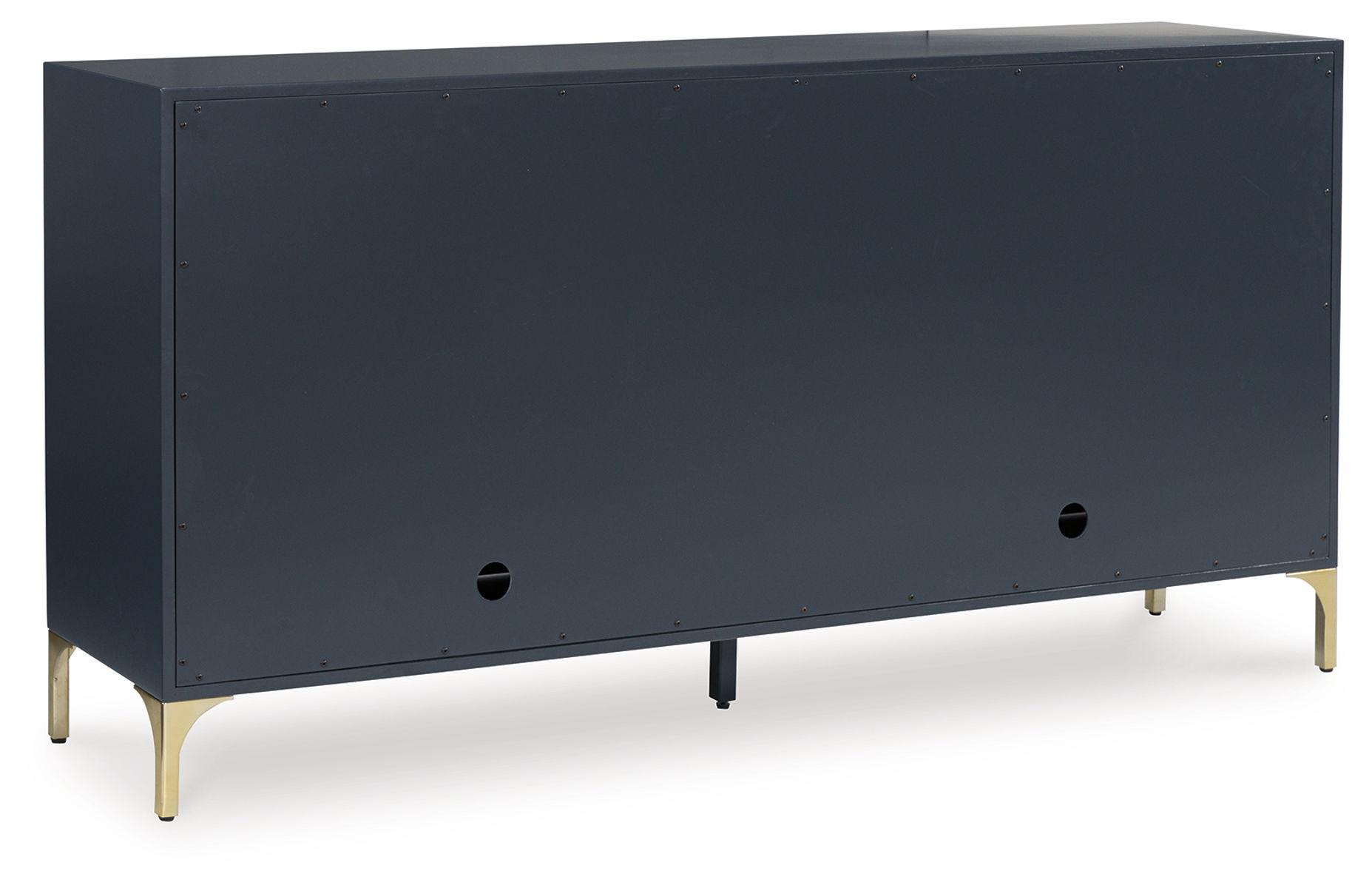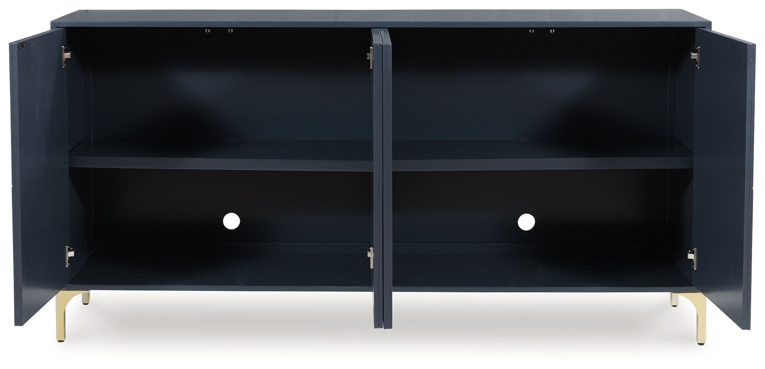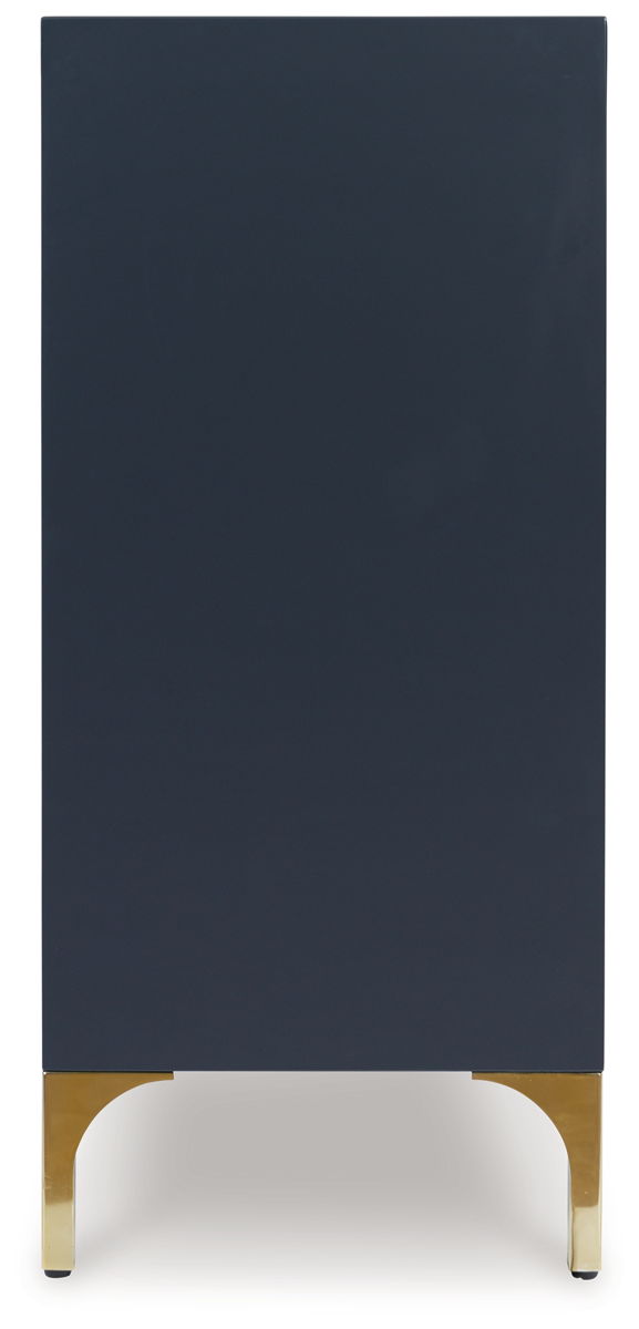 Elevate your aesthetic with the chic design of this accent cabinet. Sleek goldtone legs and striking doors with a geometric pattern infuse contemporary flair wherever you place this piece. Add a dark blue finish, and you’ve got a stunning showstopper. Providing function to form, the cabinet’s push magnetic doors reveal two shelves and openings for electronics.