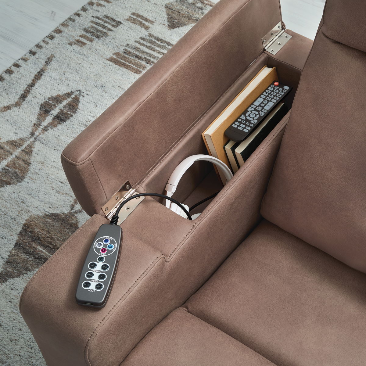 - Armrests with flip-top storage; hidden Thunder control panel with adjustable volume, treble, bass and vibration