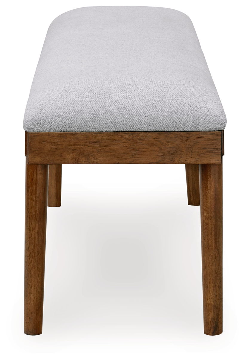 A refreshed take on retro aesthetics. This upholstered bench adds an air of simplicity to your dining space, capturing the architectural language of mid-century stylings. Its seat invites the eye with a soft-edged silhouette and neutral gray cushion. A casual, yet timeless, finish on the frame creates visual contrast to complete this study in form and function.