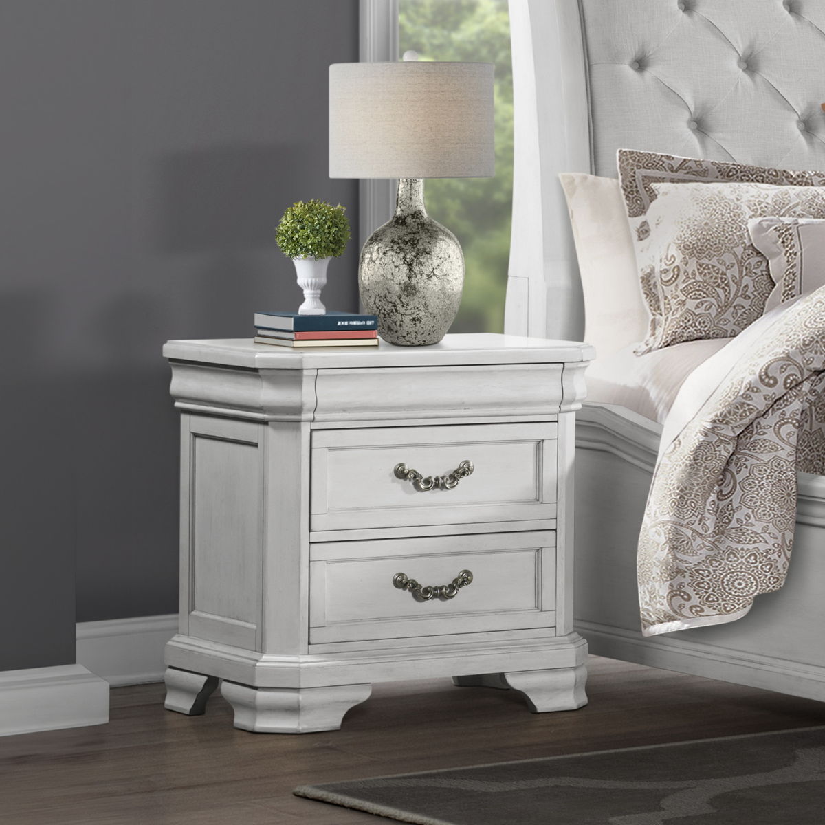 Introducing the Lyndhurst Nightstand — an essential piece for any bedroom sanctuary. Crafted from solid Acacia, Acacia veneers, and manufactured wood, this nightstand ensures lasting durability. Its heirloom finish, achieved through meticulous distressing, burnishing, and glazing, enhances the wood’s natural beauty. Substantial moldings, bracket feet, and ornate hardware define its masterful style, making it a statement piece in any space. Inside, drawers are crafted with English dovetail joinery, full extension drawer glides, and finished interiors, with velvet-lined top drawer to protect delicate items. Experience modern convenience with the two-drawer design, equipped with a USBC charging station to keep your devices running smoothly. Plus, a discreet velvet-lined compartment hides behind the molding, providing additional storage for jewelry. Elevate your bedroom decor with the timeless elegance and functionality of the Lyndhurst Nightstand.