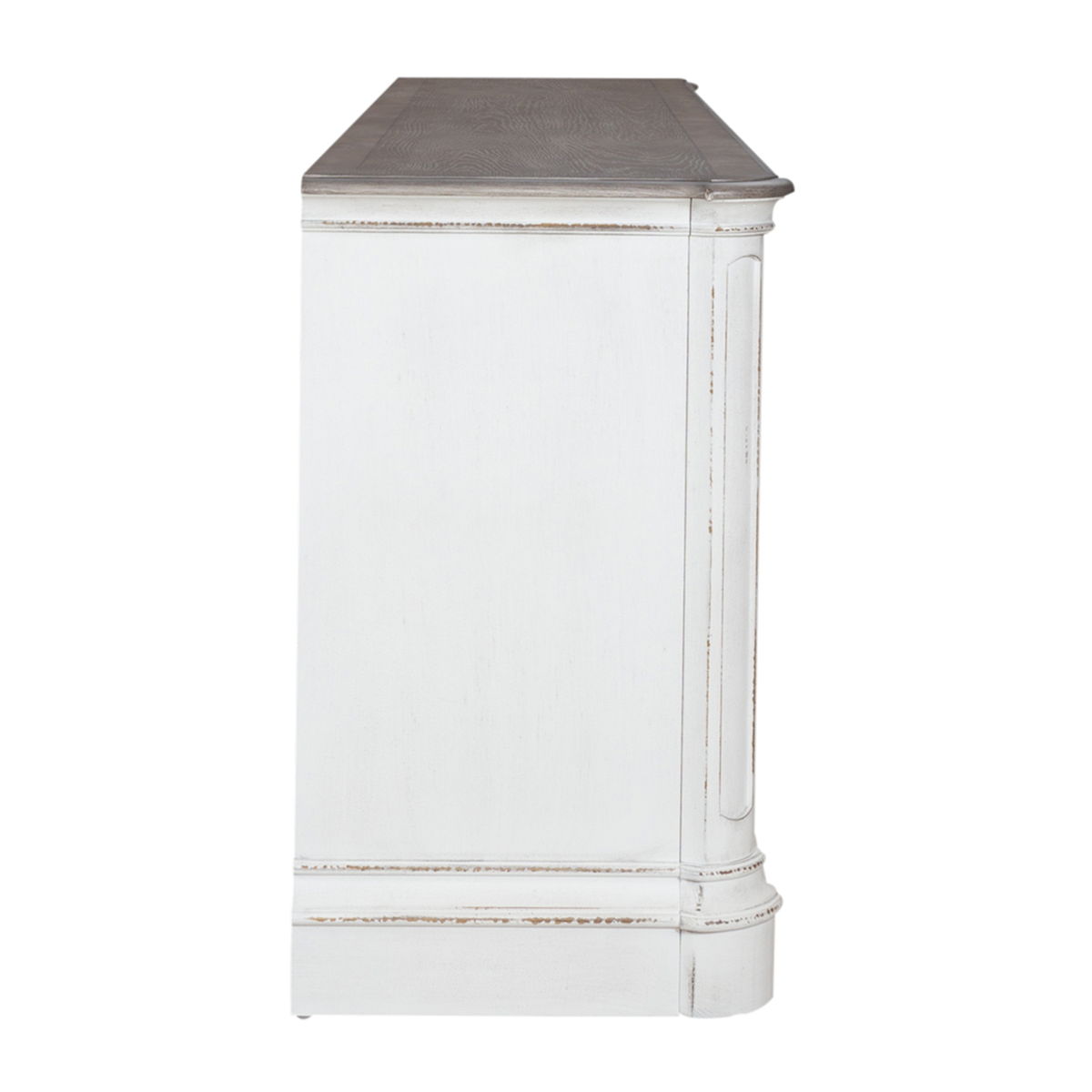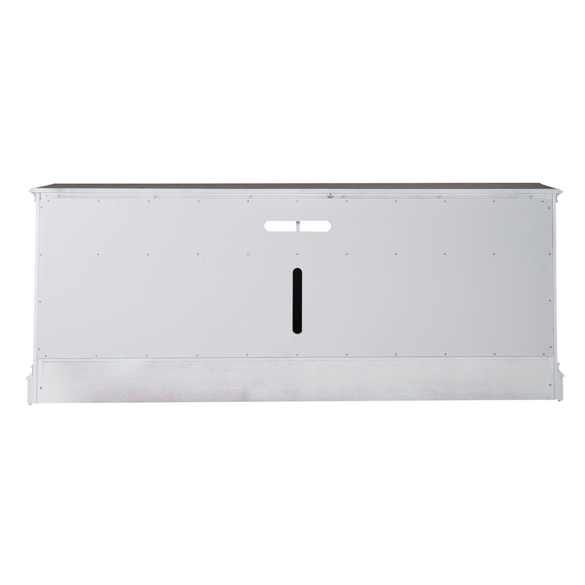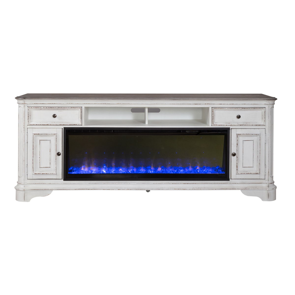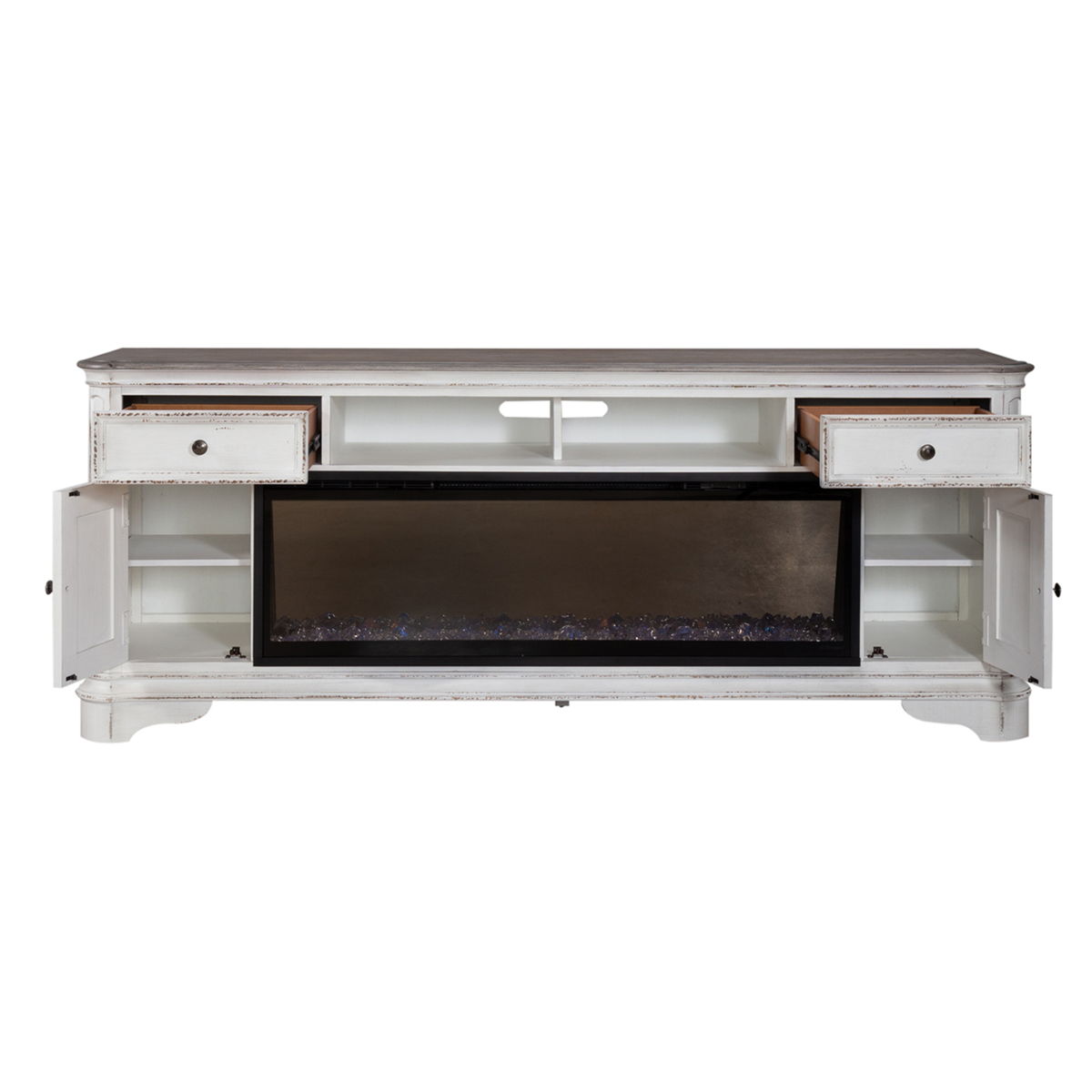 Get cozy with the Magnolia Manor eighty-two inch console with fire. Crafted with excellence using rubberwood solids with birch veneers, this piece features a two-tone Antique White and Weathered Brown finish with heavy chipping and distressing. There are two full extension drawers and two doors. The doors and drawer fronts are wood framed with bead molding and are accented with Antique Pewter knob hardware. Behind each door is one adjustable shelf. The canted corners on the top draw attention to the chamfered pilasters which flow into shaped bracket feet. The open center compartment with a half center divider can be utilized for your electronics with a wire management cut-out located at the back.