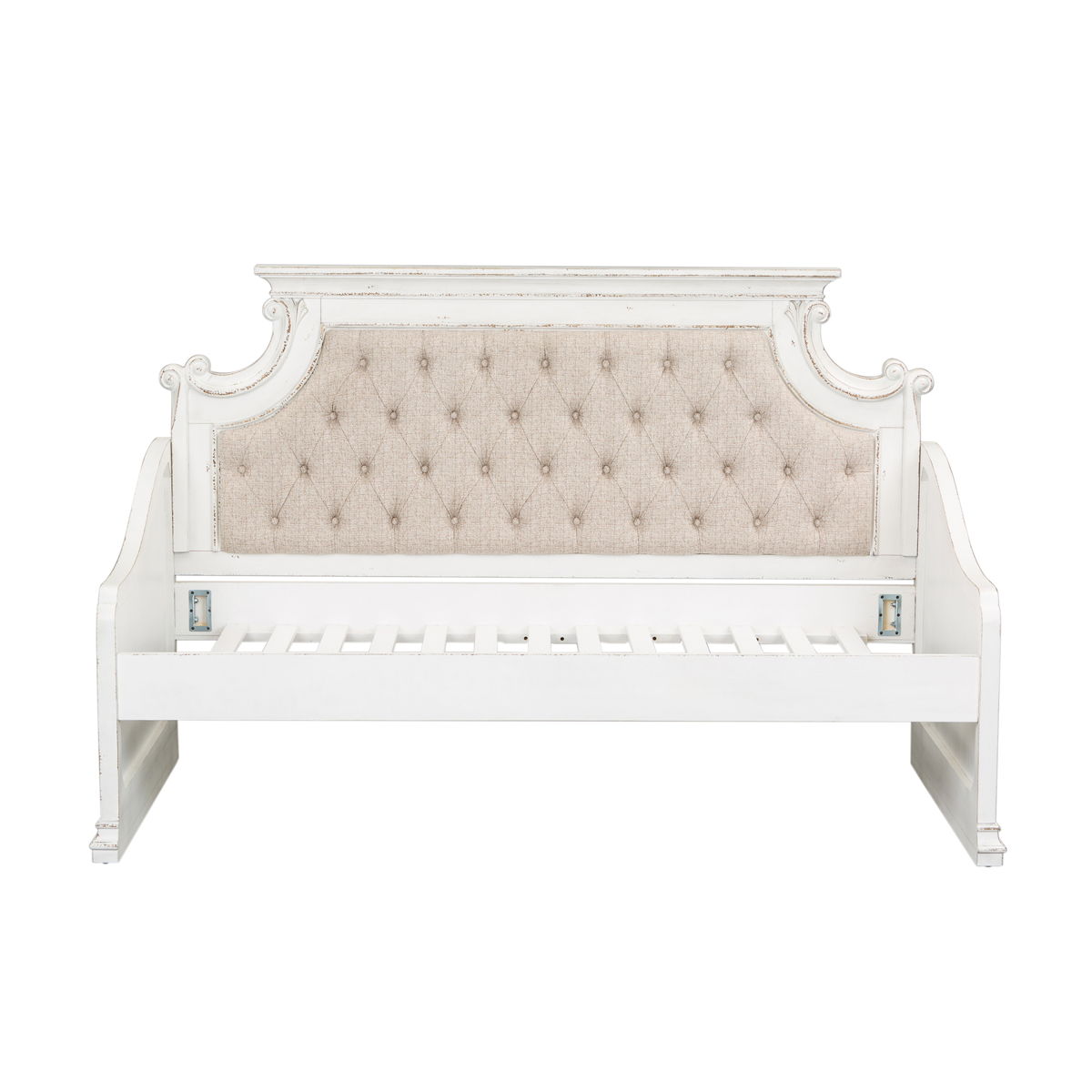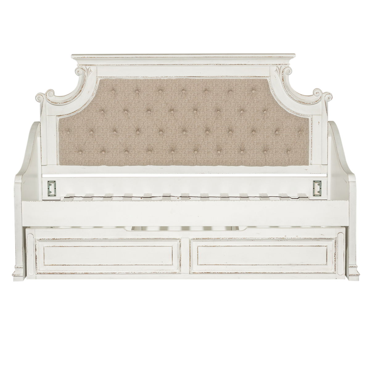 Accent your bedroom with the perfect blend of European Traditional design, using this unique twin daybed. Upholstered in tufted chenille, laced with tones, threading, this bed constructed with poplar solids as well as oak & birch veneers, features an antiqued finish accompanied by heavy chipping. This piece ships with a slat roll pack, preventing buyers from having to purchase a box spring, enhancing user convenience. Enjoy the extra storage or utilize the trundle to accommodate guests. The scrolled cap rail and sloped end panels on each side effortlessly add both definition and character, completing your look.