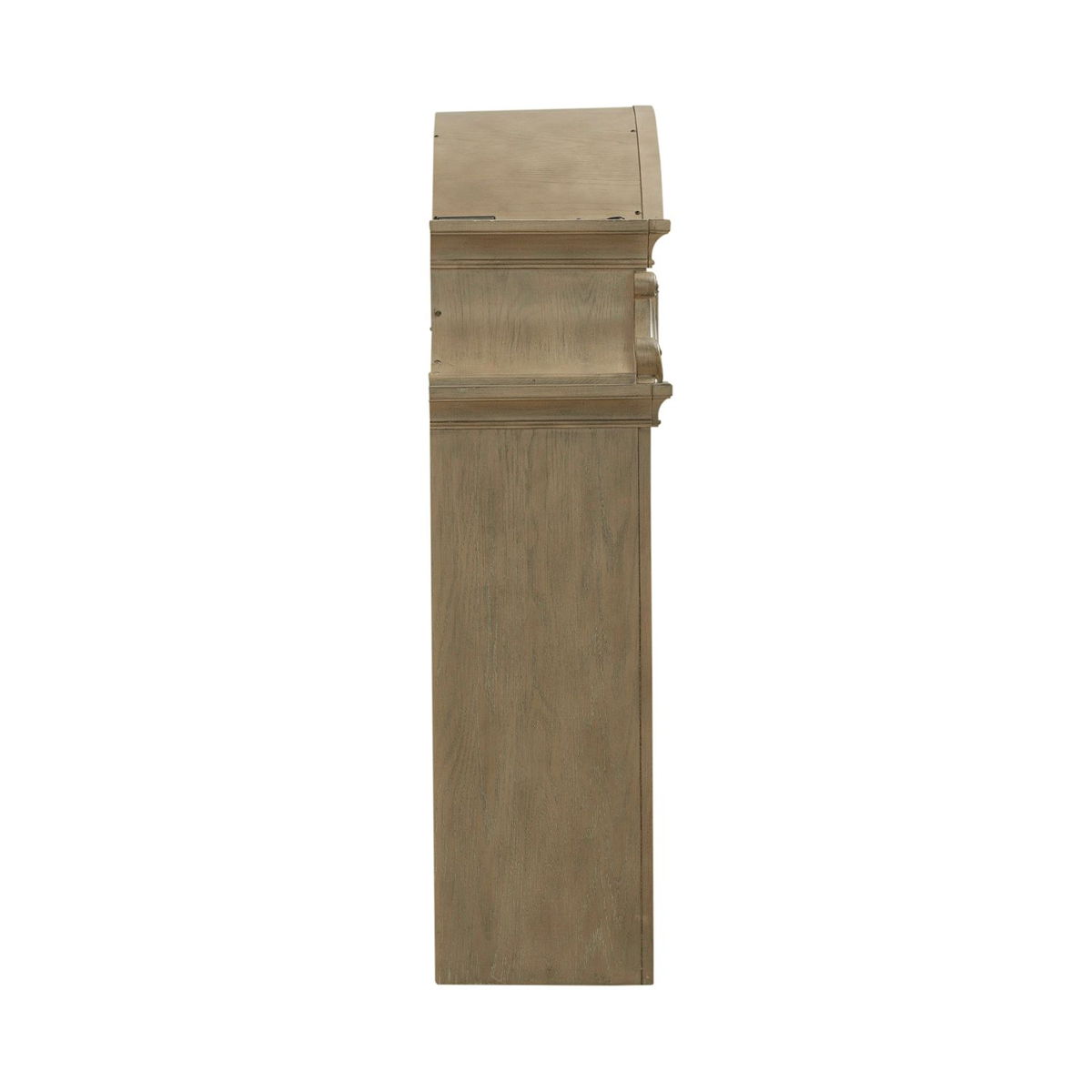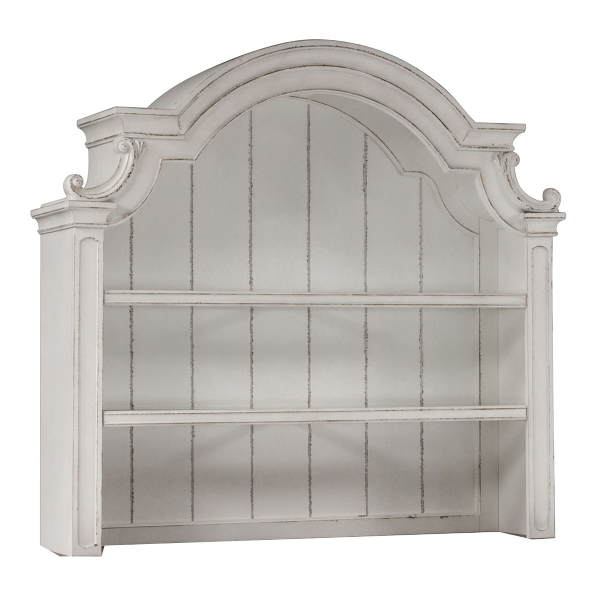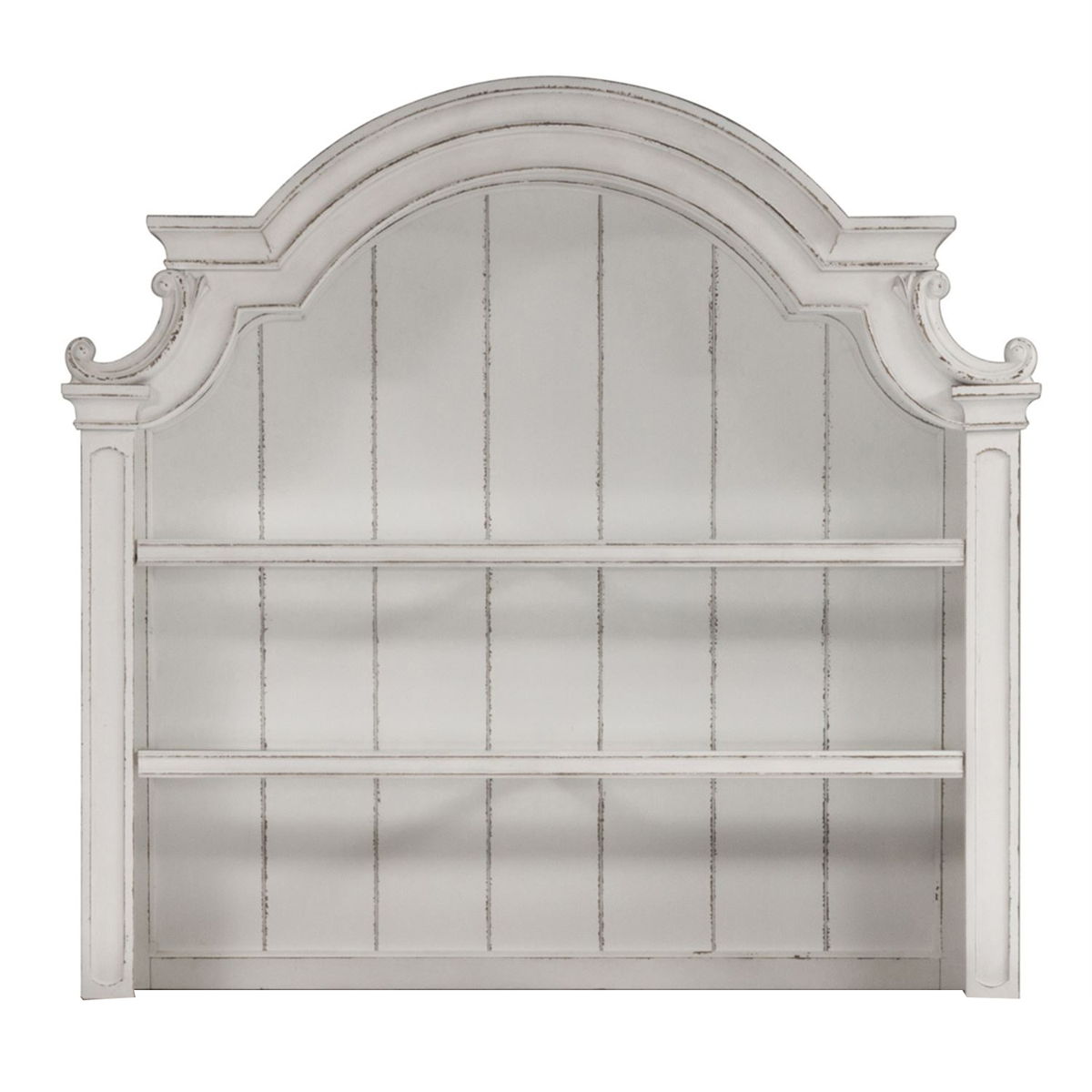 Features planked back panel, two wood framed adjustable shelves, heavily craved bonnet top and LED touching lighting. Cannot stand alone. Pair with the buffet to make a complete set.