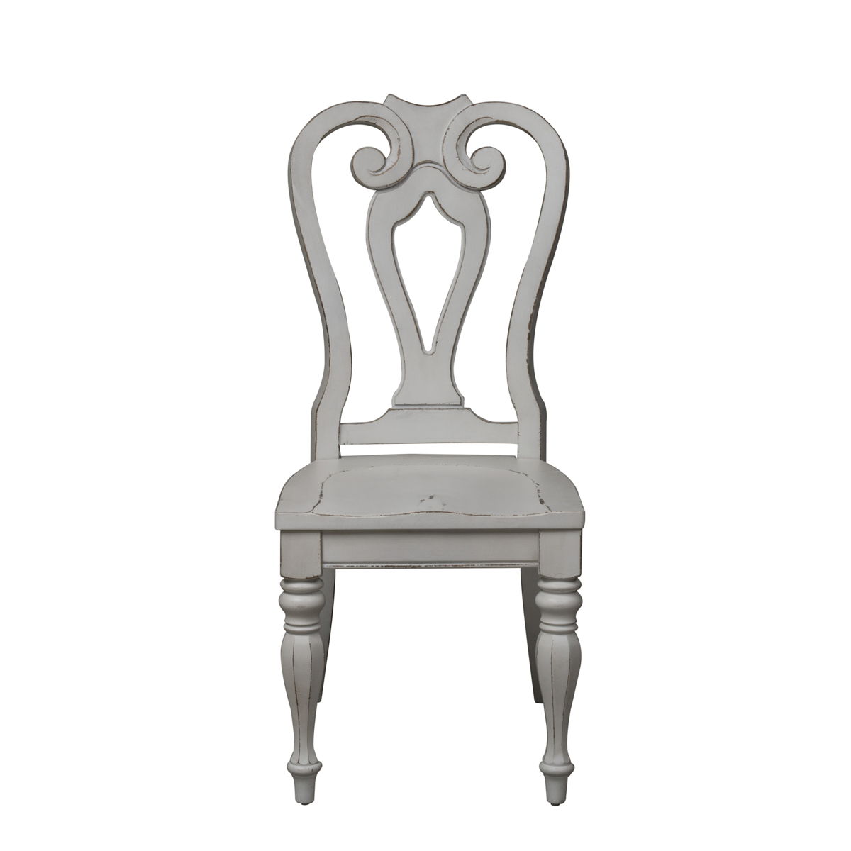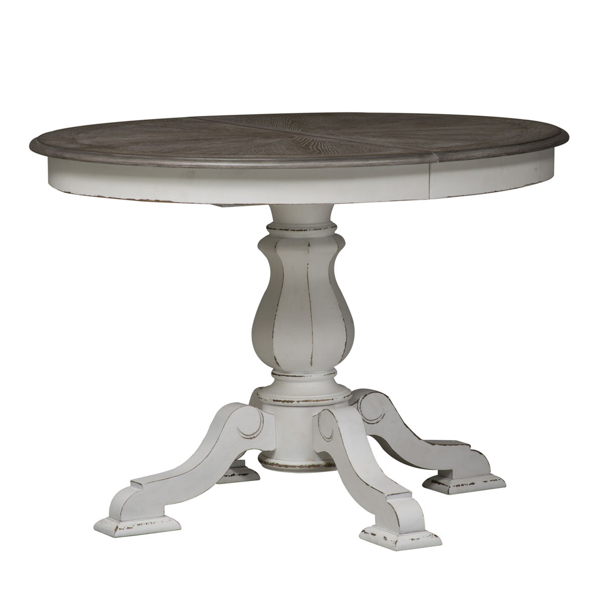 Create a grand gathering with the Magnolia Manor optional five-piece pedestal table set, consisting of four splat back upholstered side chairs and a pedestal table. Crafted of poplar solids with cathedral oak veneer, this kit features an antique finish with heavy chipping and a weathered top. The table offers one 12” leaf to accommodate guests or a larger family and is anchored by a turned pedestal base. The chairs feature the perfect blend of European design, upholstery in tweed chenille, dog bone accents on the splat back, tufted back panel, nylon chair glides to protect your flooring, and beautifully faceted turned legs. Warm antique finishes and artistic distressing along with grand scale create a piece to be passed to generations.