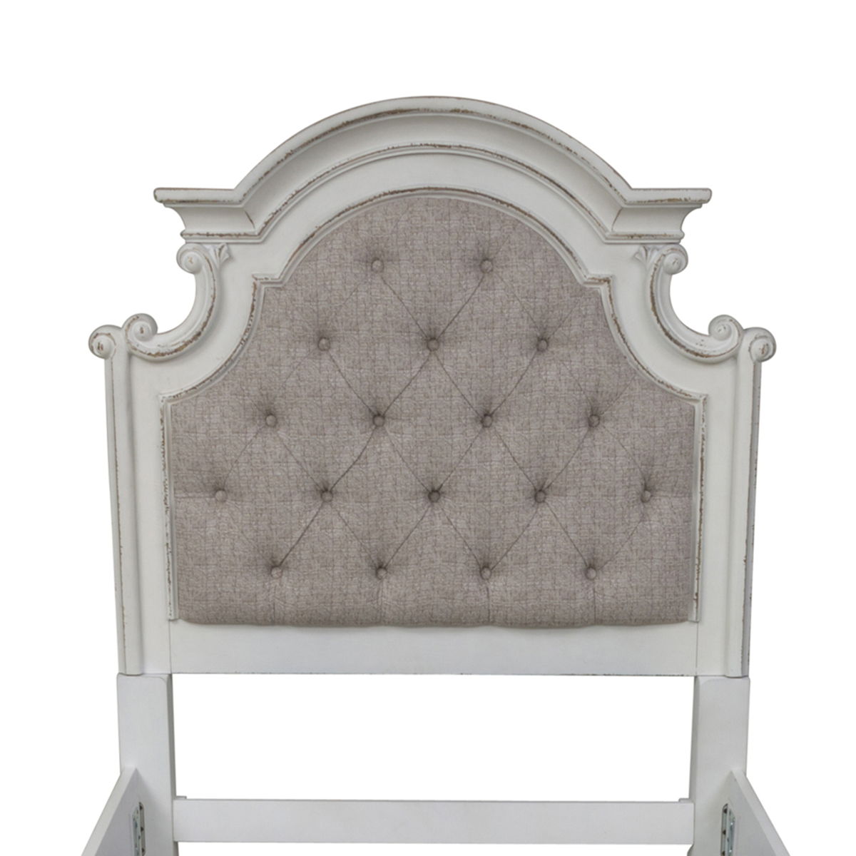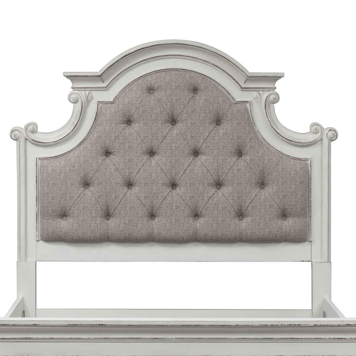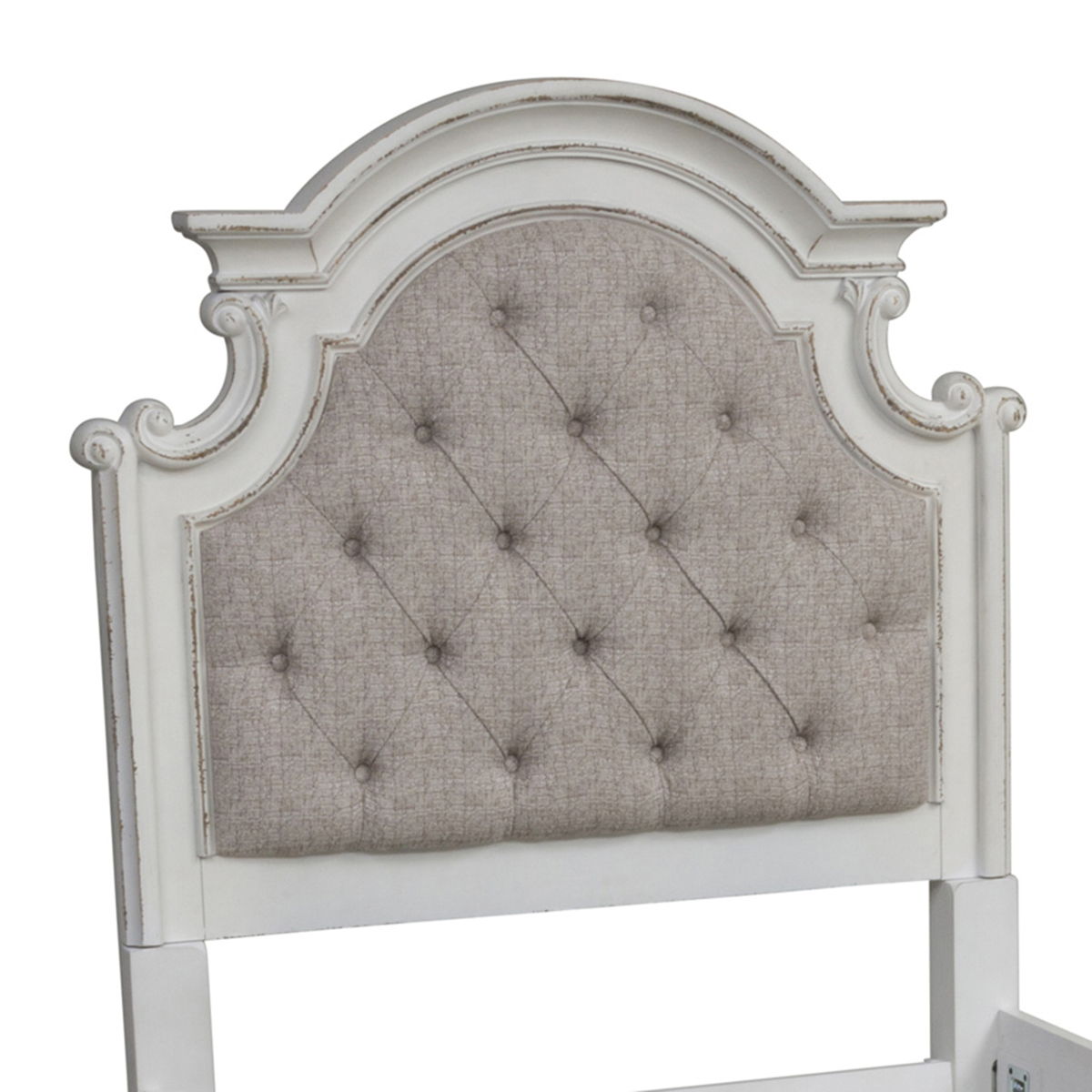 Accent your bedroom with the perfect blend of European Traditional design and casual appeal using the Magnolia Manor Upholstered Headboard. Finished in a weathered brown and antique white finish with heavy chipping combination this piece is crafted of poplar solids and white oak and birch veneers.The upholstered headboard is button tufted in a chenille fabric laced with tones of white, tan and brown threads and features an arched crown with dog bone accents on each corner adding definition and character. The headboard will work with a metal bed frame or the panel footboard and rails.