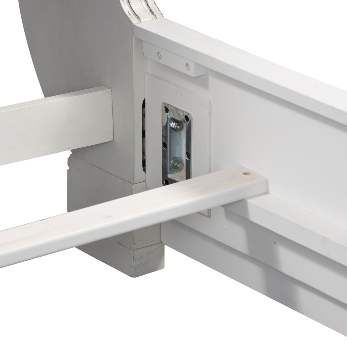 Accent your bedroom with the perfect blend of European Traditional design, using this unique upholstered sleigh bed. Upholstered in tufted chenille, laced with tones of white, tan and brown threading, this bed constructed with poplar solids as well as oak & birch veneers, features an antiqued white finish accompanied by heavy chipping. The rolled upholstered headboard and footboard effortlessly adds both definition and character, completing your look.