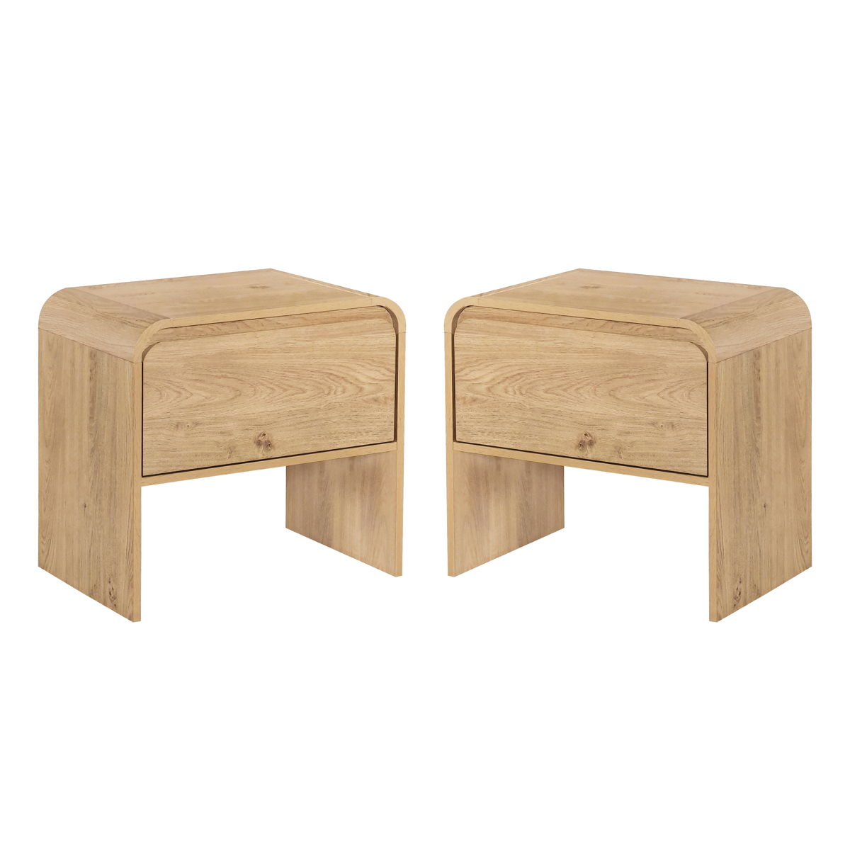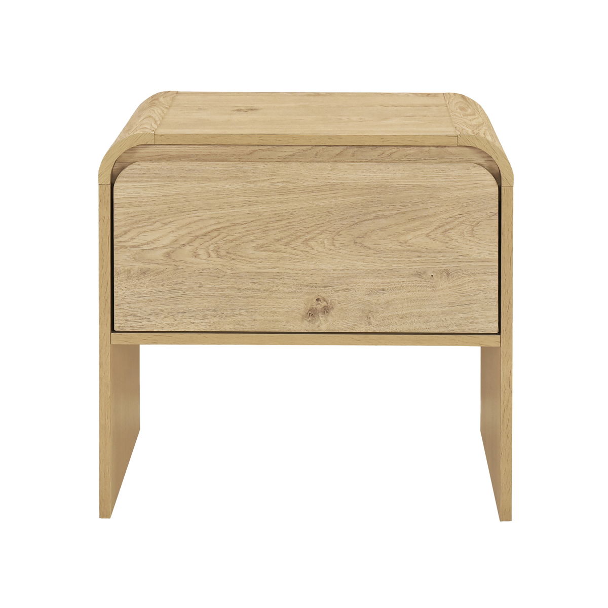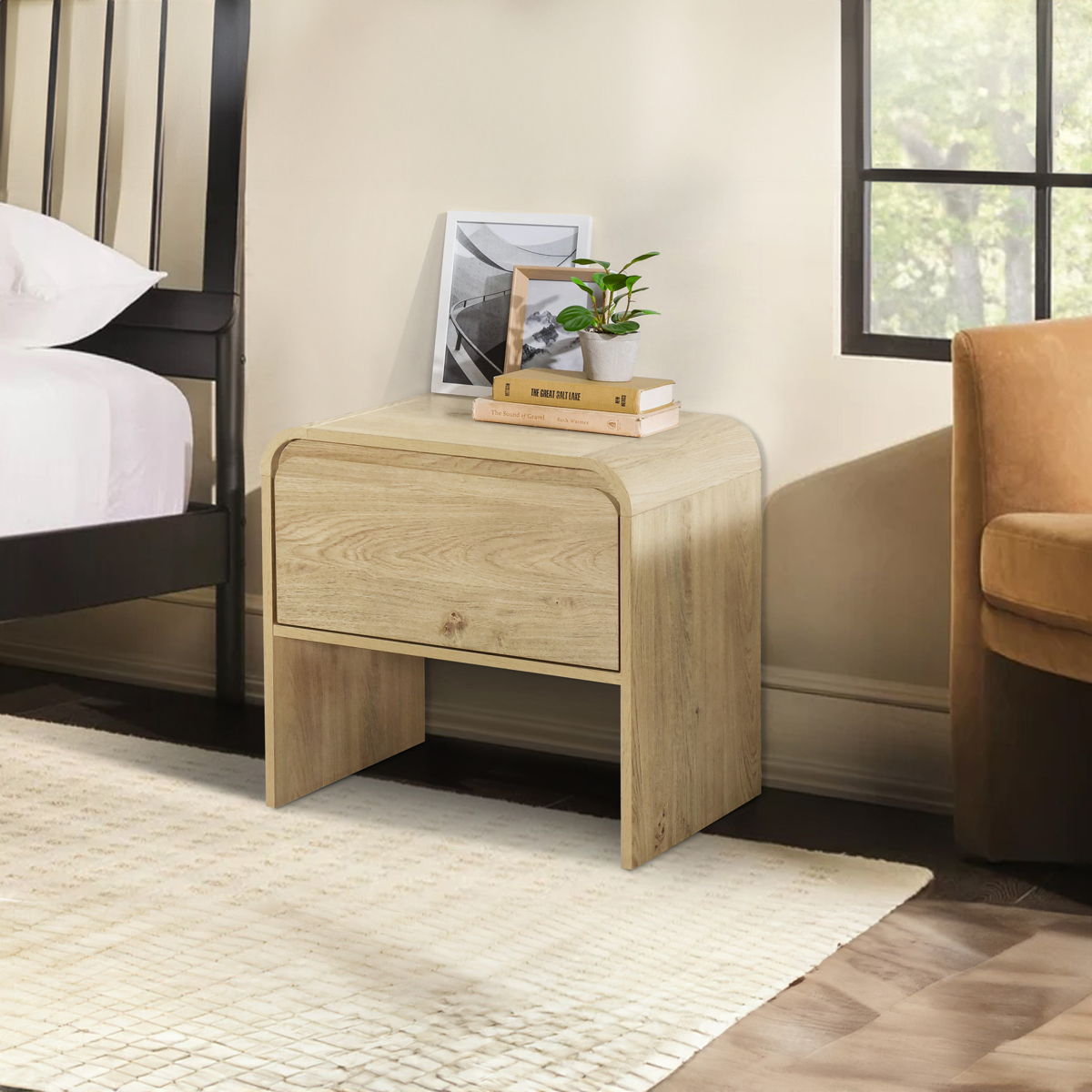 Introducing the Mara One Drawer End Table, a testament to eco-friendly craftsmanship and modern design. Crafted from durable manufactured wood and adorned with environmentally friendly laminate, this end table offers both style and sustainability. Its ample surface area provides space for lamps and accessories, while the discreet storage drawer keeps remotes and reading materials neatly out of sight. The minimalist design, accentuated by curved drawer fronts and waterfall-style tops and sides, adds a touch of contemporary elegance to any room. Finished in a natural hue, it effortlessly complements a variety of décors, making it a versatile choice for your home. Experience functionality and sophistication with the Mara One Drawer End Table.