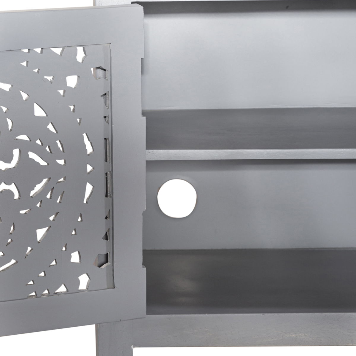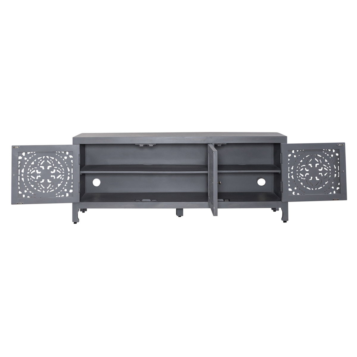 Marisol accent TV console gives you that Boho chic feel that is so popular today. Boho is a mix of colors, styles, and materials to create a carefree causal comfortable space. Crafted of solid mango with a soft finish. Features three artisan hand craved doors in a floral pattern, one fixed shelf behind each door, shaped block legs with antique brass knob hardware. Perfect as a TV console.