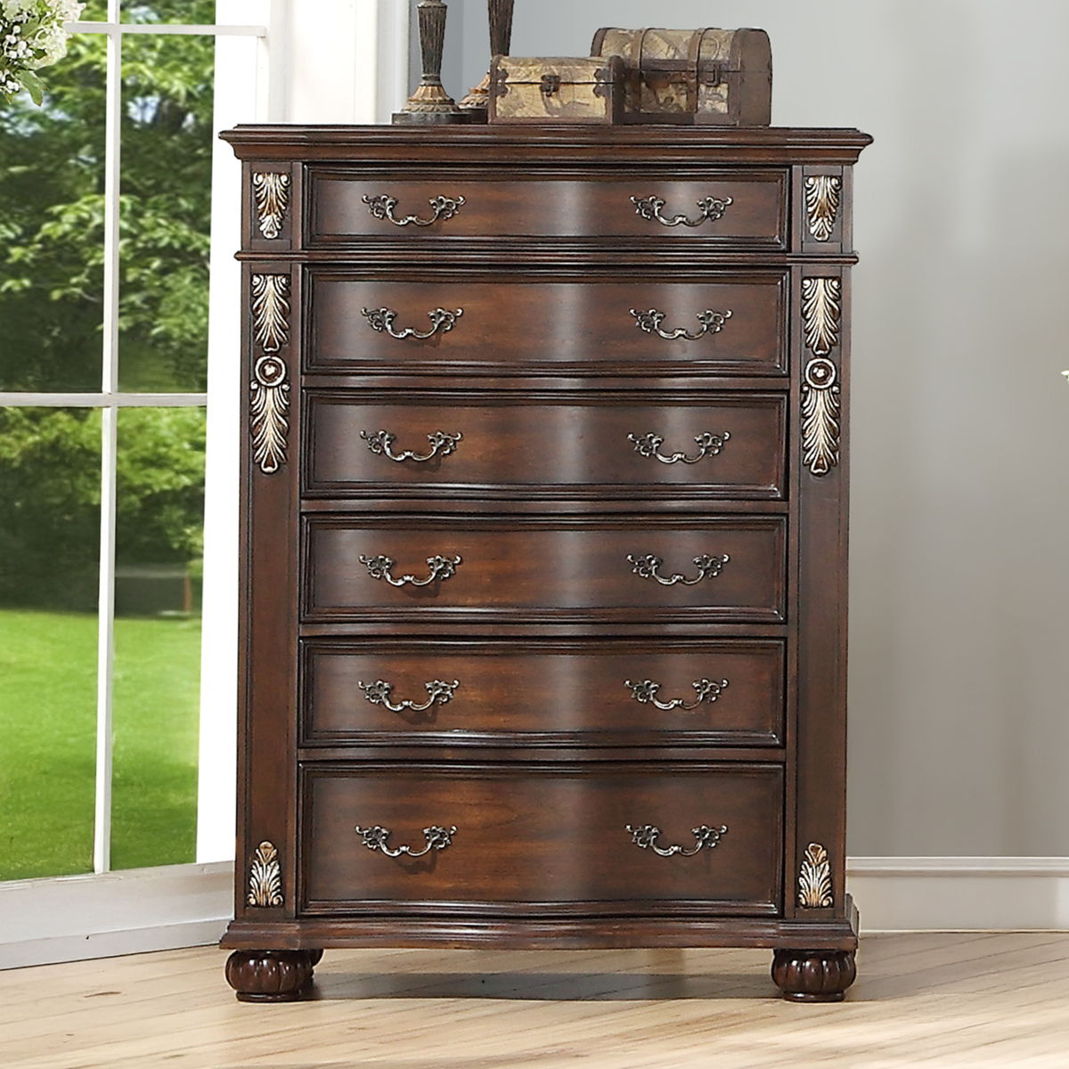 The Royal Classics Maximus 6-Drawer Chest in Madeira Brown is a masterfully crafted piece that blends enduring quality with timeless elegance. Constructed from solid poplar and premium birch veneers, this chest is built to last, offering heirloom-quality durability and beauty for years to come. The multi-step finish enhances the rich, natural grain of the wood, while delicately burnished gold tipping highlights the intricate Baroque-inspired carvings, adding a luxurious touch to the overall design. Each drawer is crafted with French and English dovetail joinery for exceptional strength and glides smoothly on full-extension tracks, providing effortless access to your belongings. The impeccably finished interiors ensure snag-free storage, while the velvet-lined top drawers add a layer of refined sophistication. This chest combines classic design with modern functionality, making it a perfect addition to any elegant bedroom.