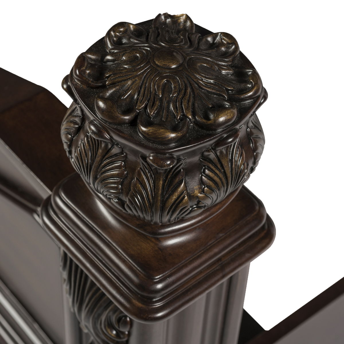 Invite this luxurious European style Messina Estates poster bed into your bedroom. The finish is accented by acanthus leaf carvings on the square posts. Scrolled metal accents in the headboard along with heavy bead molding add to the traditional design of the bed. Crafted with poplar solids and wormy cherry veneer, this piece features bolt-on rails and a center supported slat bed ensures that the bed is sturdy and reliable.