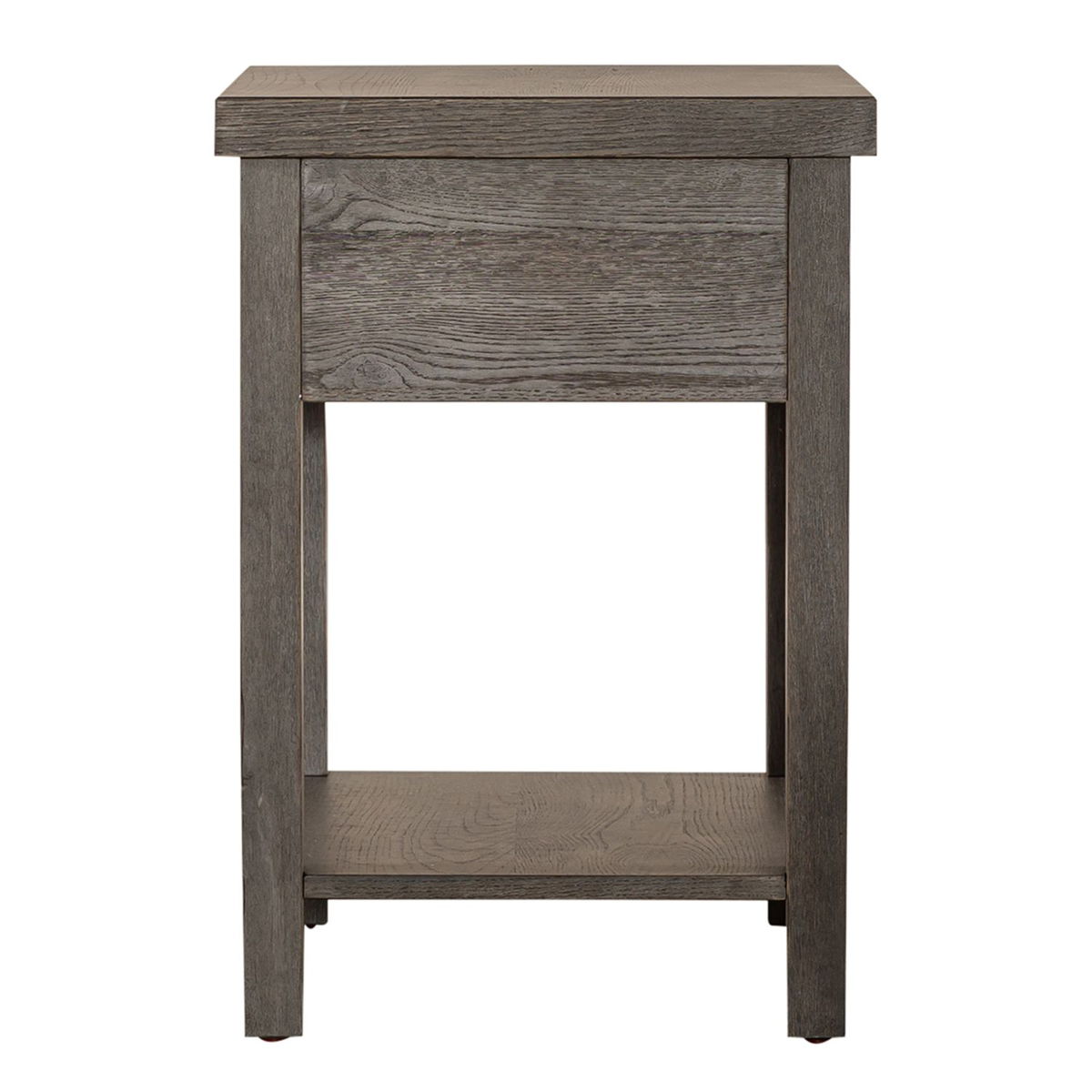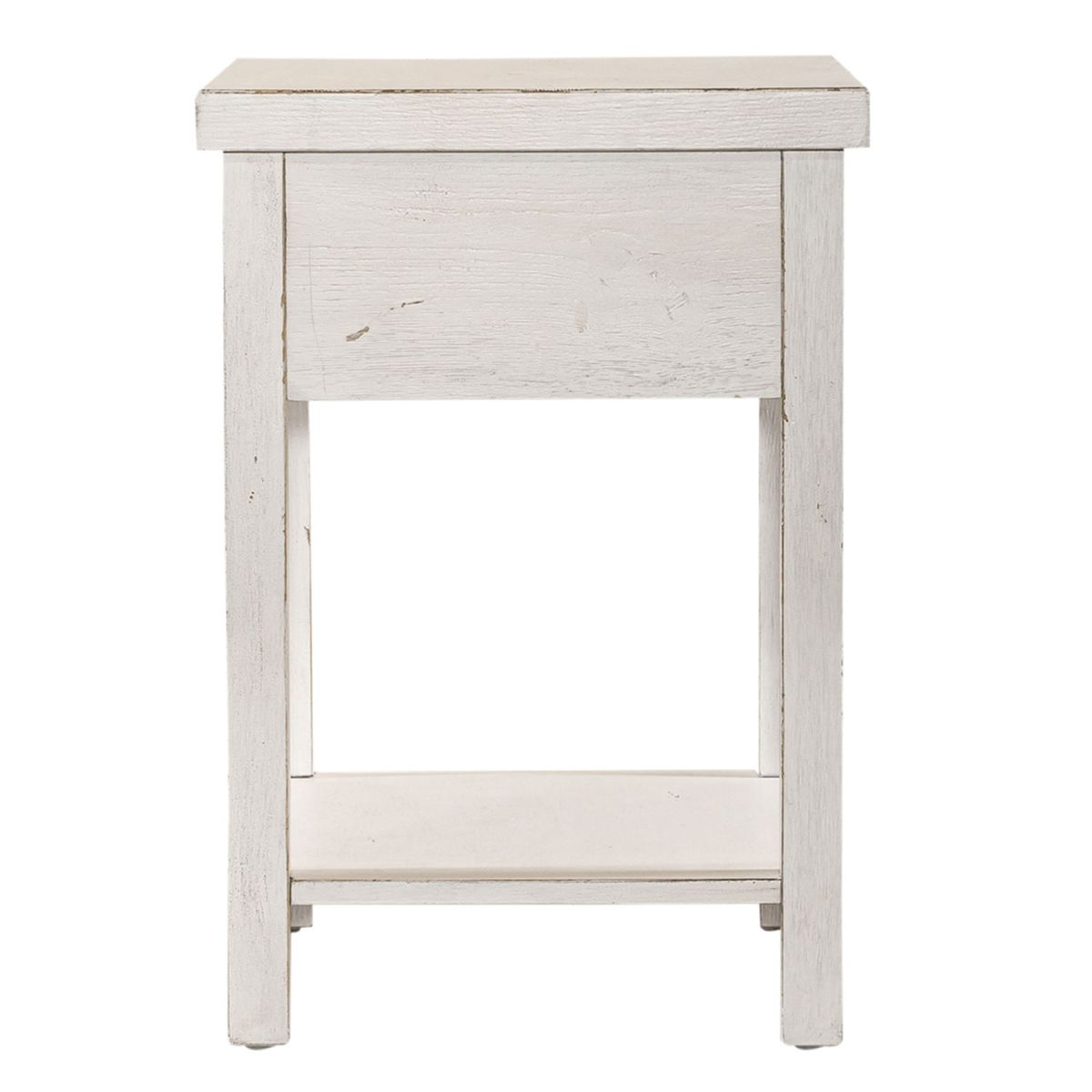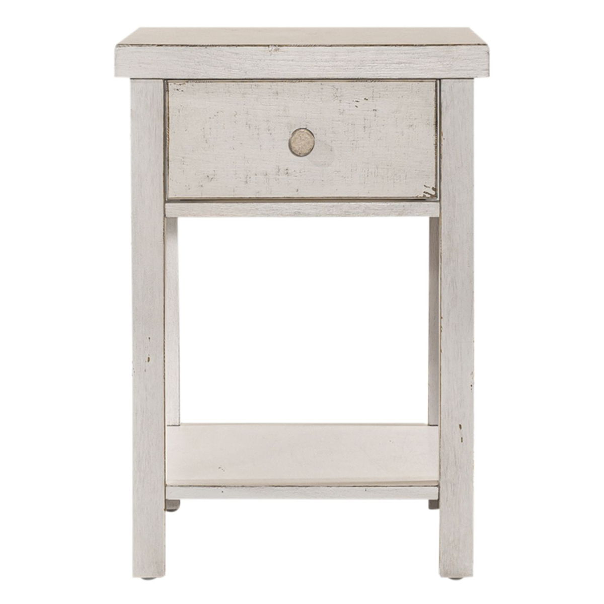 Enhance your space with the Modern Farmhouse drawer chair side table. Crafted of poplar solids with knotty white oak veneers, this piece features heavy distressing, a full extension drawer with a bottom shelf for additional storage, appealing washed brass knob hardware. Also available in an alternate finish, this modern farmhouse piece would be a wonderful addition to your cottage or contemporary style space.