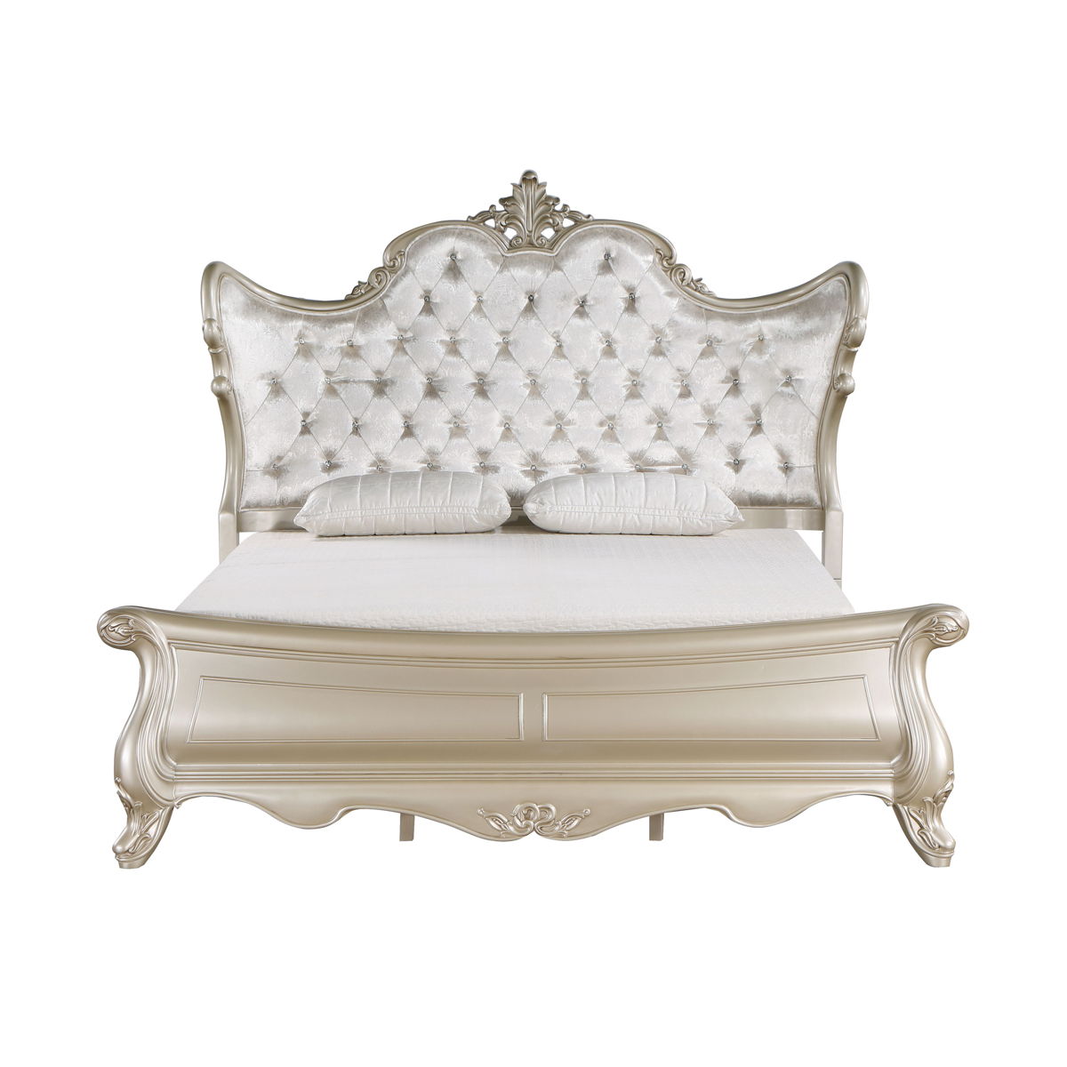The Monique Royal Classic Bed with Button Tufted Headboard is a testament to heirloom quality and timeless French Provincial elegance. Crafted from poplar solids and birch veneers, this bed promises strength and durability. Its design reflects the charm of French countryside homes with soft curved lines, intricate carvings, scalloped edges, and decorative moldings. The bed features an opulent velveteen headboard adorned with subtle patterns and shimmering crystal accents, providing a sumptuous sanctuary for restful sleep. The intricate, multi-step finish, enhanced with antique gold glazing, highlights the exquisite moldings and ornamental carvings. Experience the blend of sophistication and comfort that the Monique Royal Classic Bed offers, making it a truly unparalleled choice for your home.