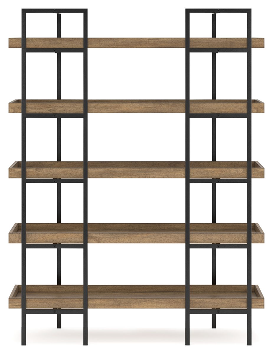 Urban Contemporary design. Made with Mango wood veneer, MDF substrate and metal frames. Finished in a light brown wood tone with contrasting gunmetal gray frames. Desk features 3 drawers and open raceway on the back side to help keep wires and power supplies neatly tucked out of sight. Matching bookcase with five 58″ wide gallery shelves.