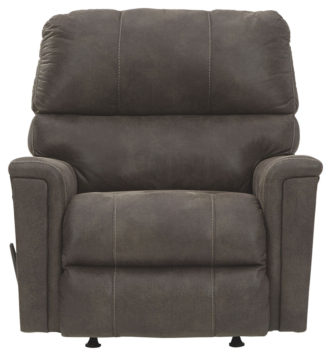 If you love the cool look of leather but long for the warm feel of fabric, you can take comfort in this rocker recliner. Wrapped in a fabulous faux leather with a weathered hue and hint of pebbly texture to resemble the real deal, this decidedly modern recliner proves less is more. Elements include angled side profiling and track armrests wrapped with a layer of pillowy softness for that little something extra. Prominent jumbo stitching and clean-lined divided back styling lend fashion-forward flair.